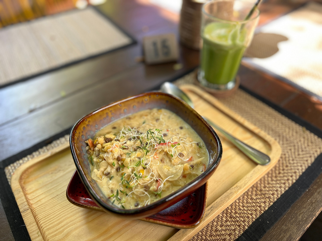 오랜만에 리조또가 먹고 싶어서 주문했다. 렌틸콩과 슈퍼곡물들을 주재료로 해서 양파, 애호박 등의 야채를 잘게 채 썰어 넣고 끓인 비건크림리조또. 어린 새싹을 위에 올려 마무리해서 아삭아삭 식감도 좋고 끝맛도 산뜻하다. 유당불내증과 알러지반응이 심해져 우유를 완전히 끊고 난 직후에 크림소스가 먹고 싶어서 집에서 가끔 오트밀크를 이용해 크림파스타나 리조또를 만들어먹곤 했는데, 이날 먹은 리조또가 딱 집에서 만들어 먹던 그 맛이었다. 비건크림소스는 재료 특성상 우유나 생크림으로 만드는 크림소스와는 차이가 날 수밖에 없는데, 처음엔 꾸덕함이 없는 크림이 좀 아쉬웠지만, 먹다 보니 어느 순간부터 깔끔한 비건크림에 길들여졌는지 이제는 꾸덕한 우유크림이 먹고 싶은 생각은 별로 나지 않는다. 채소의 향이 선명하게 살아있는 채식크림소스가 오히려 더 좋아!