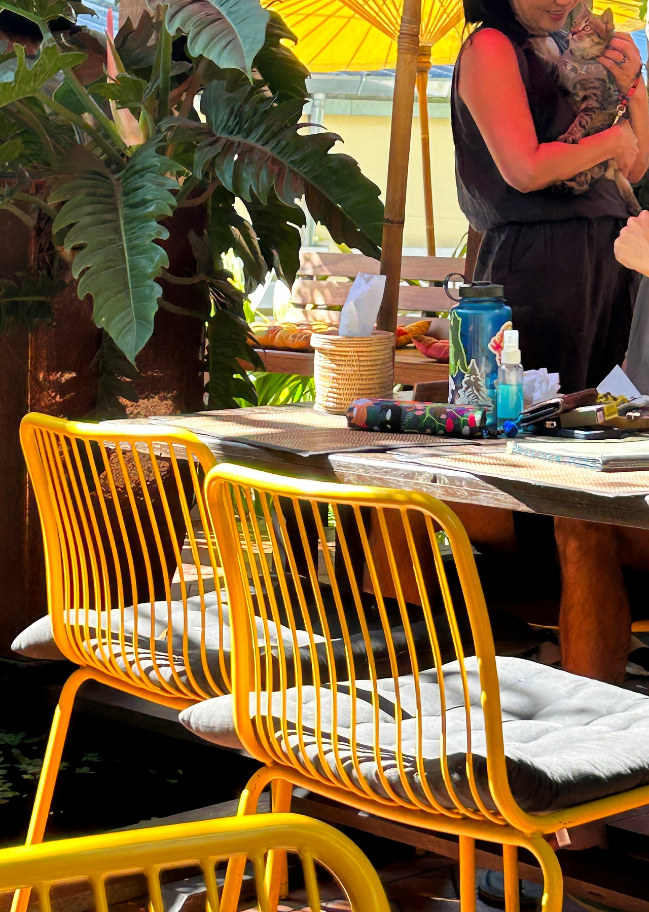 자그마한 몸을 가제트 팔처럼 주우우욱 늘인 채로 엉아를 찾아 기웃대던 아기고양이는 이내 포기하곤 의자 위에 풀썩 올라 앉아 야외에 가득한 사람들을 구경하기 시작한다. 반짝이며 나를 바라보는 노란색 눈동자에 그만 심쿵- 화장실에 가려던 것도 잊고 한참 동안 아기고양이와 함께 정원에 쏟아지는 여름의 빛을 구경했다.