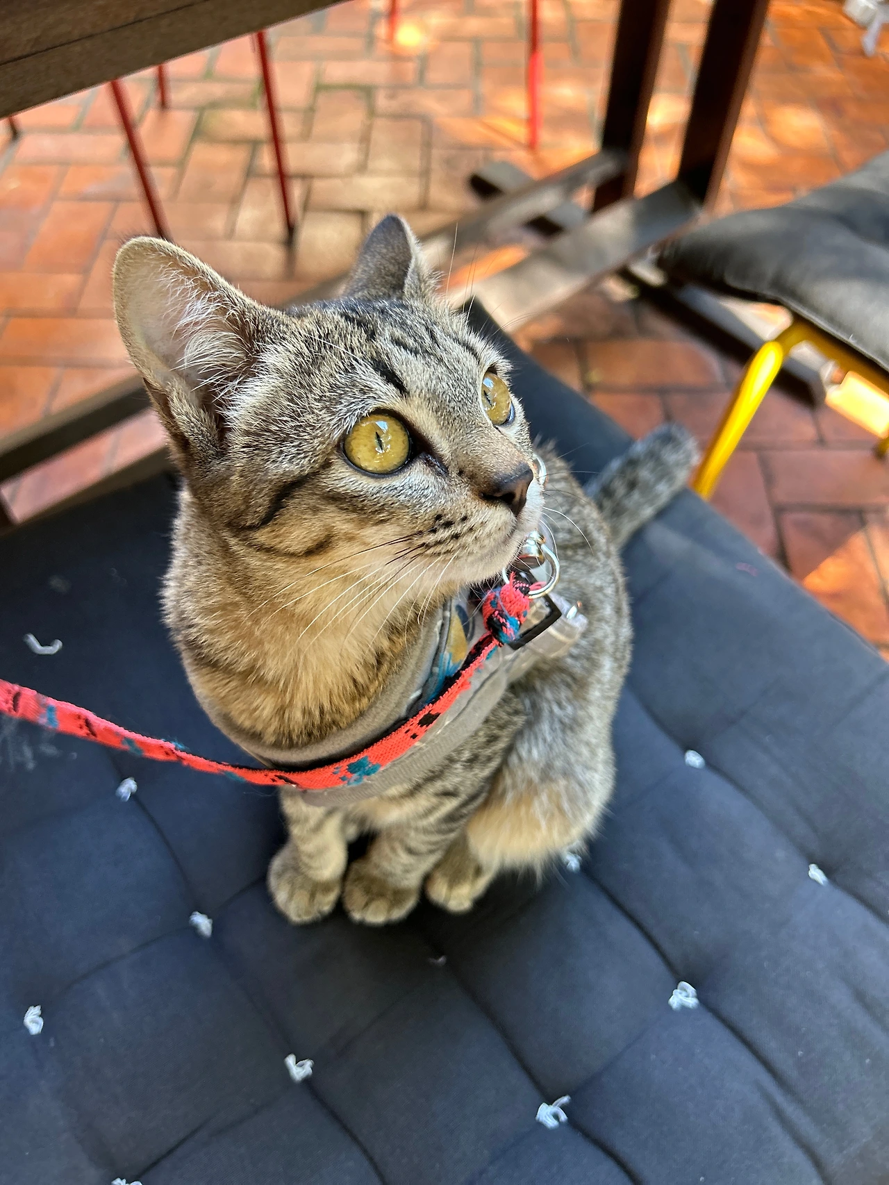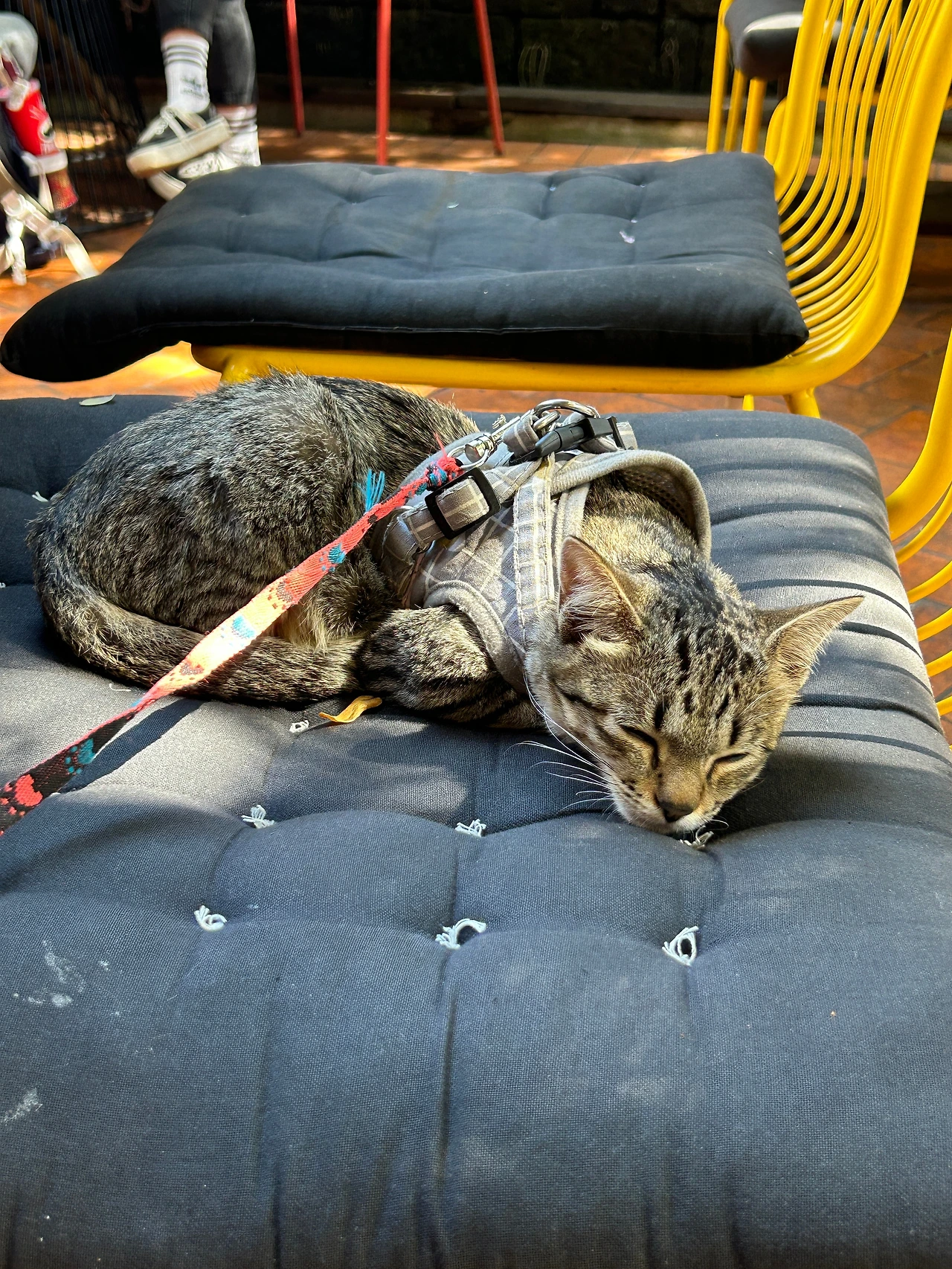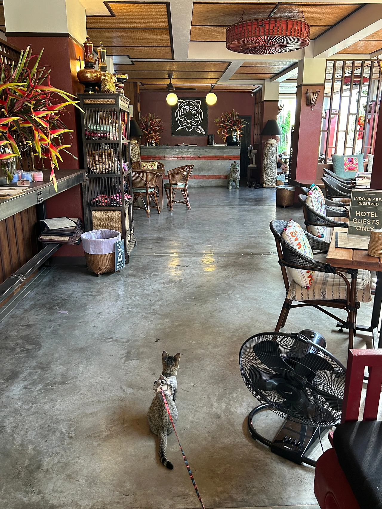 햇살 가득한 정원에서 따뜻하고 배부르게 식사를 마친 뒤. 화장실을 찾아 건물 안에 들어갔는데, 호텔에 딸린 식당인 관계로 실내좌석은 호텔손님들만 이용가능하도록 제약을 두어서 안이 텅 비었다. 덕분에 널찍한 실내는 전부 고양이들 차지! 아까 손님들에게 안겨 사랑받던 고양이가 나를 보더니 하네스를 찬 채로 쪼르르 달려온다. 손님이 데려온 고양이가 아니라 이 호텔에 사는 고양이인가 보다!