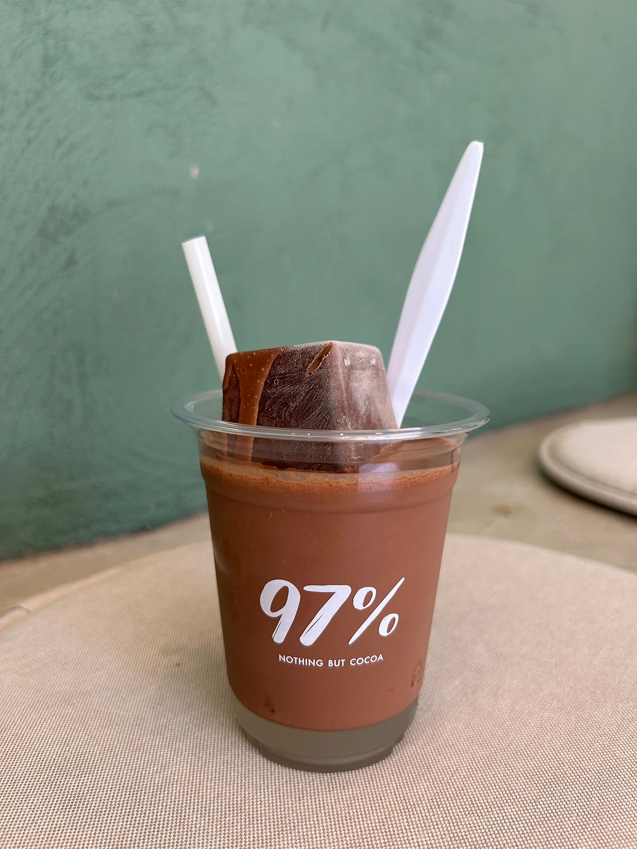 초콜릿을 얼려 만든 큼직한 아이스큐브를 띄운 아이스다크초콜릿은 그야말로 ‘Nothing But Cocoa’라는 슬로건다운 맛! 아이스큐브가 적당히 녹으면 부수어서 먹을 수 있게 빨대와 함께 숟가락도 하나 꽂아준다.