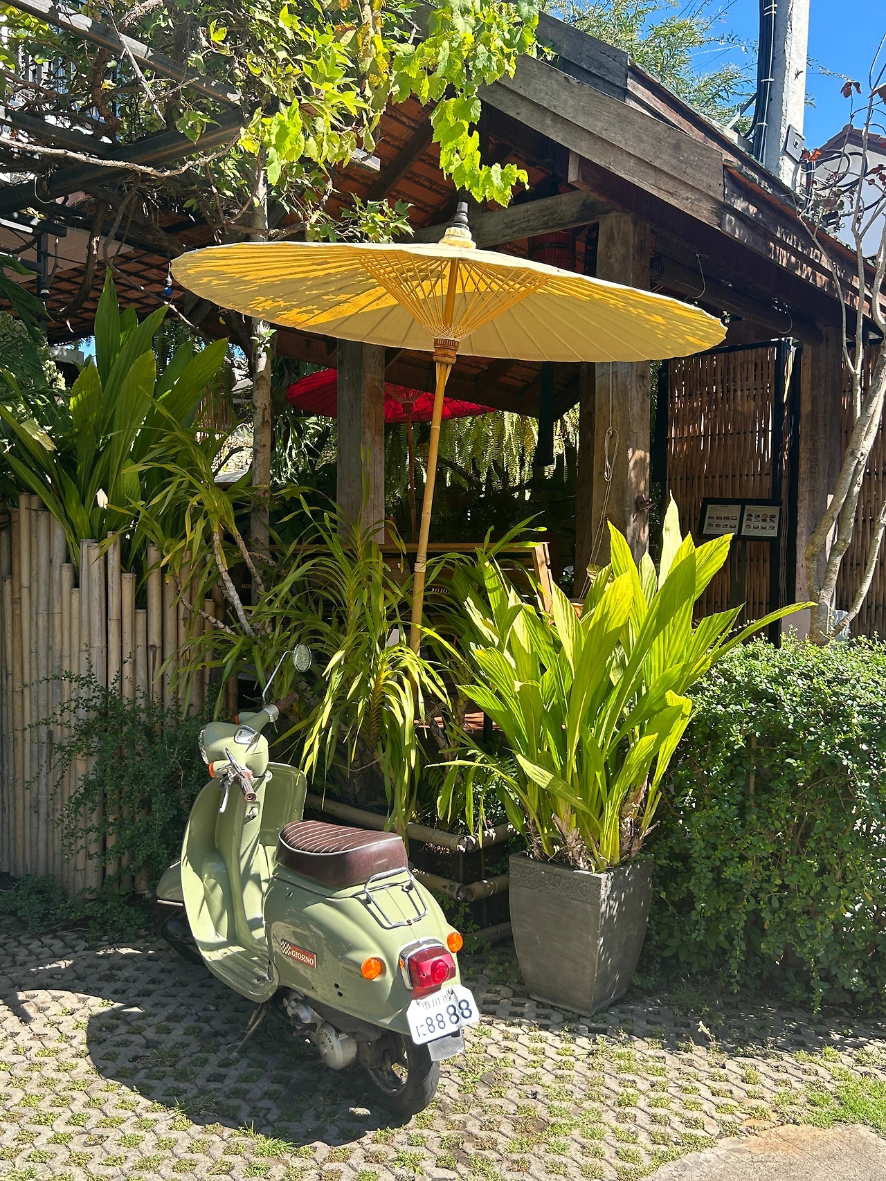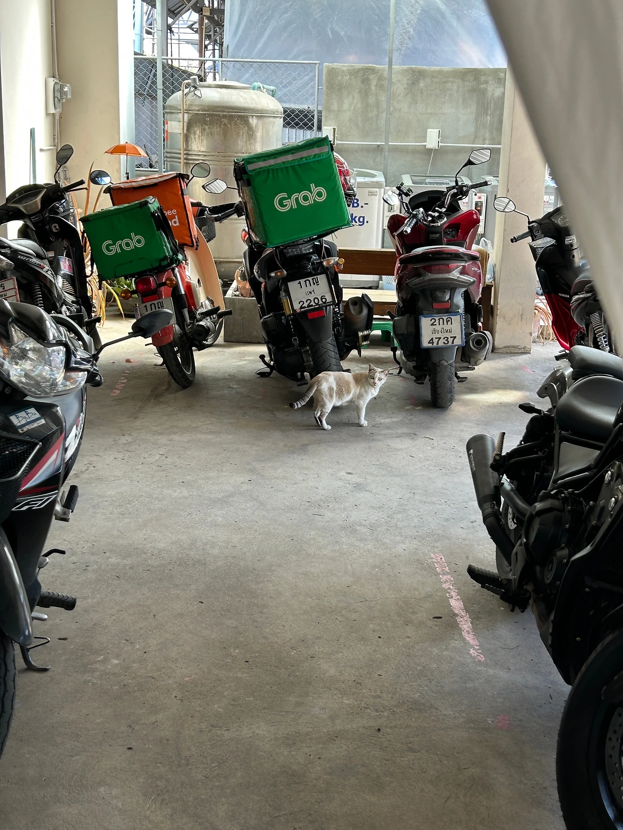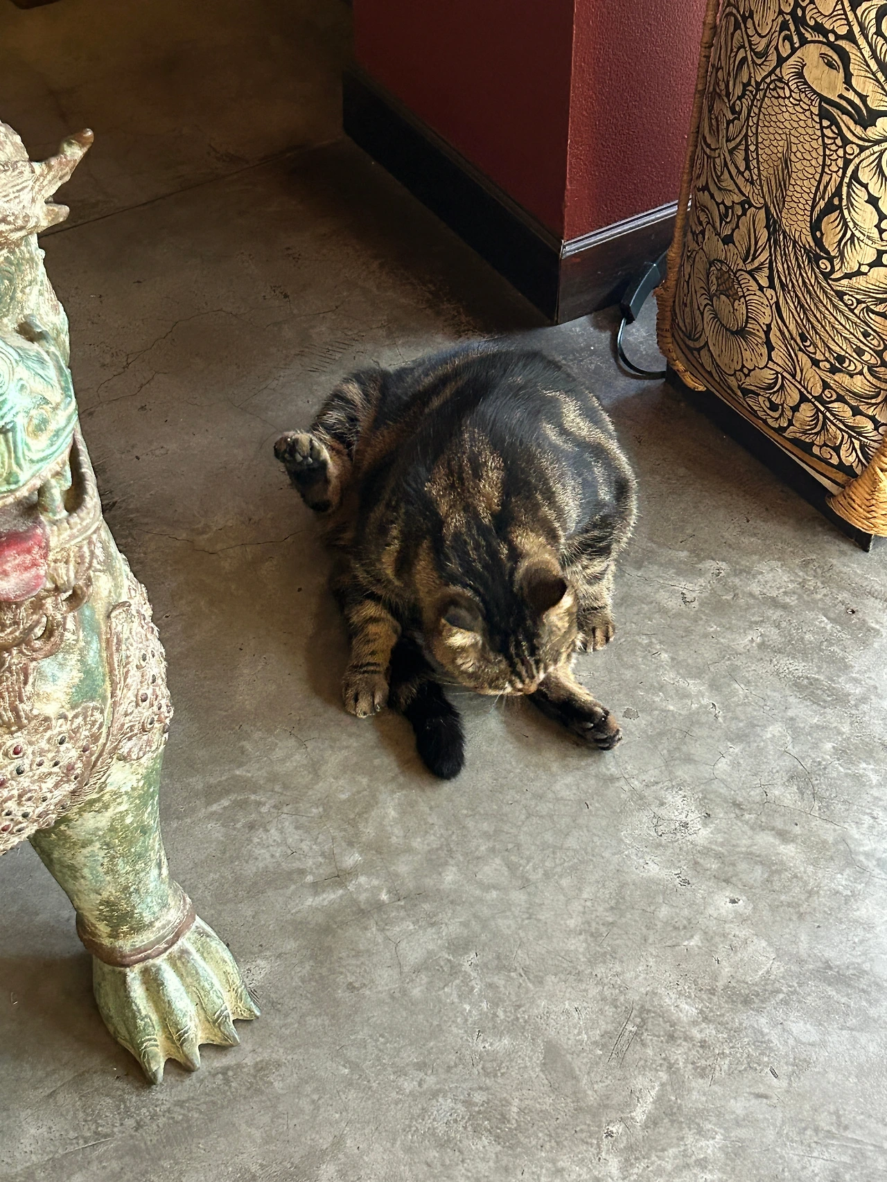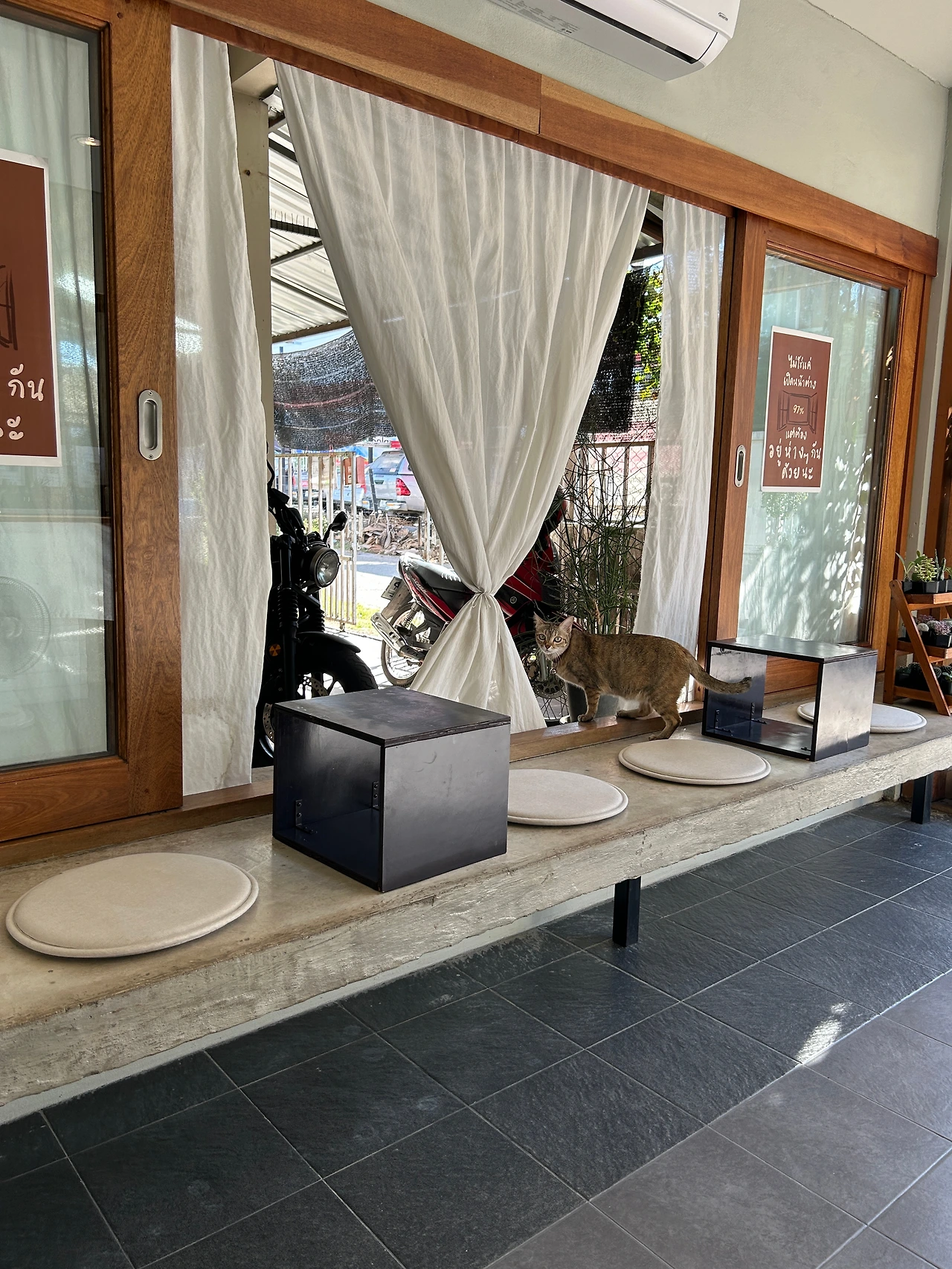 목적지인 식당에 도착해 햇살 좋은 야외에 자리를 잡고 앉았더니, 마침 옆 테이블에서 고양이자랑이 한창이다. 치앙마이에도 물론 고양이들은 많지만, 아무래도 한적하고 인적 드문 시골마을에 비하면 차도 많고 사람도 많은 탓인지, 빠이의 고양이들에 비하면 경계심을 대부분 갖추고 있어서 목걸이를 한 남의 집 고양이들이 반갑다고 먼저 달려와서 같이 놀자고 배를 드러내고 몸을 비비는 일은 드물게 되었다.