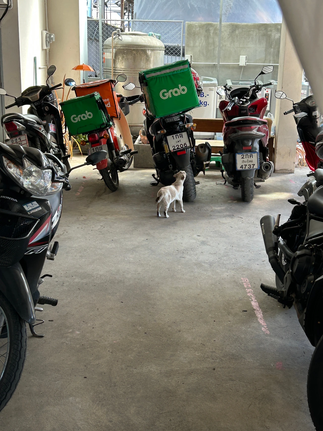 대체 왜 아이스음료는 사이즈를 불문하고 세 모금 마시면 끝나는 걸까? 숟가락으로 아이스큐브를 야무지게 부수고 있는데, 옆집에 하얀 무언가가 왔다 갔다 한다. 돌아앉아서 지켜보니, 하얀 고양이 한 마리가 주차되어있는 오토바이의 배달용 가방에 매달려서 킁킁 냄새 맡기 삼매경에 빠져있다.