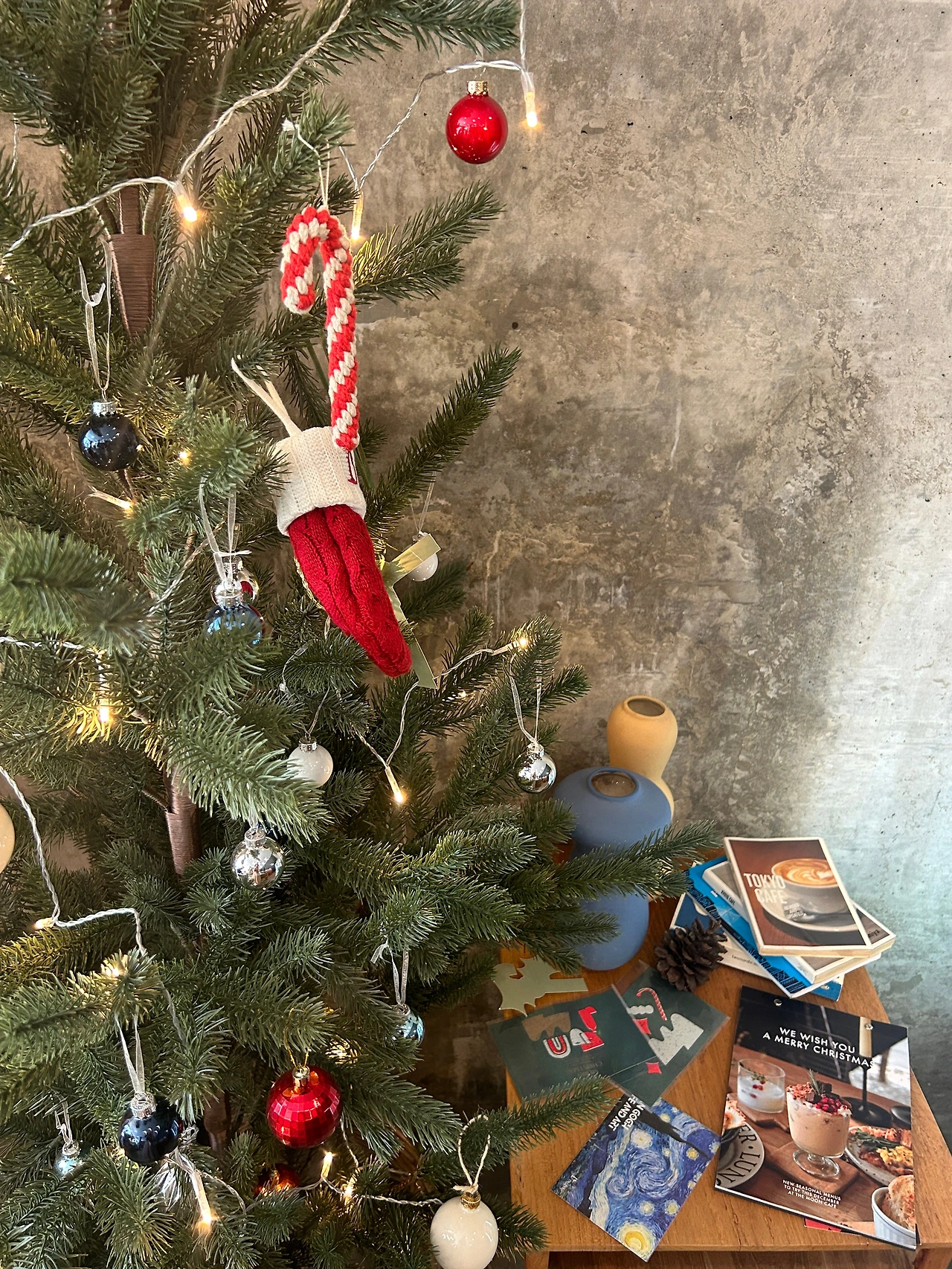 여름의 빛 내려앉은 따뜻한 밀크티 한 잔과 여름에 더 포근해 보이는 크리스마스트리