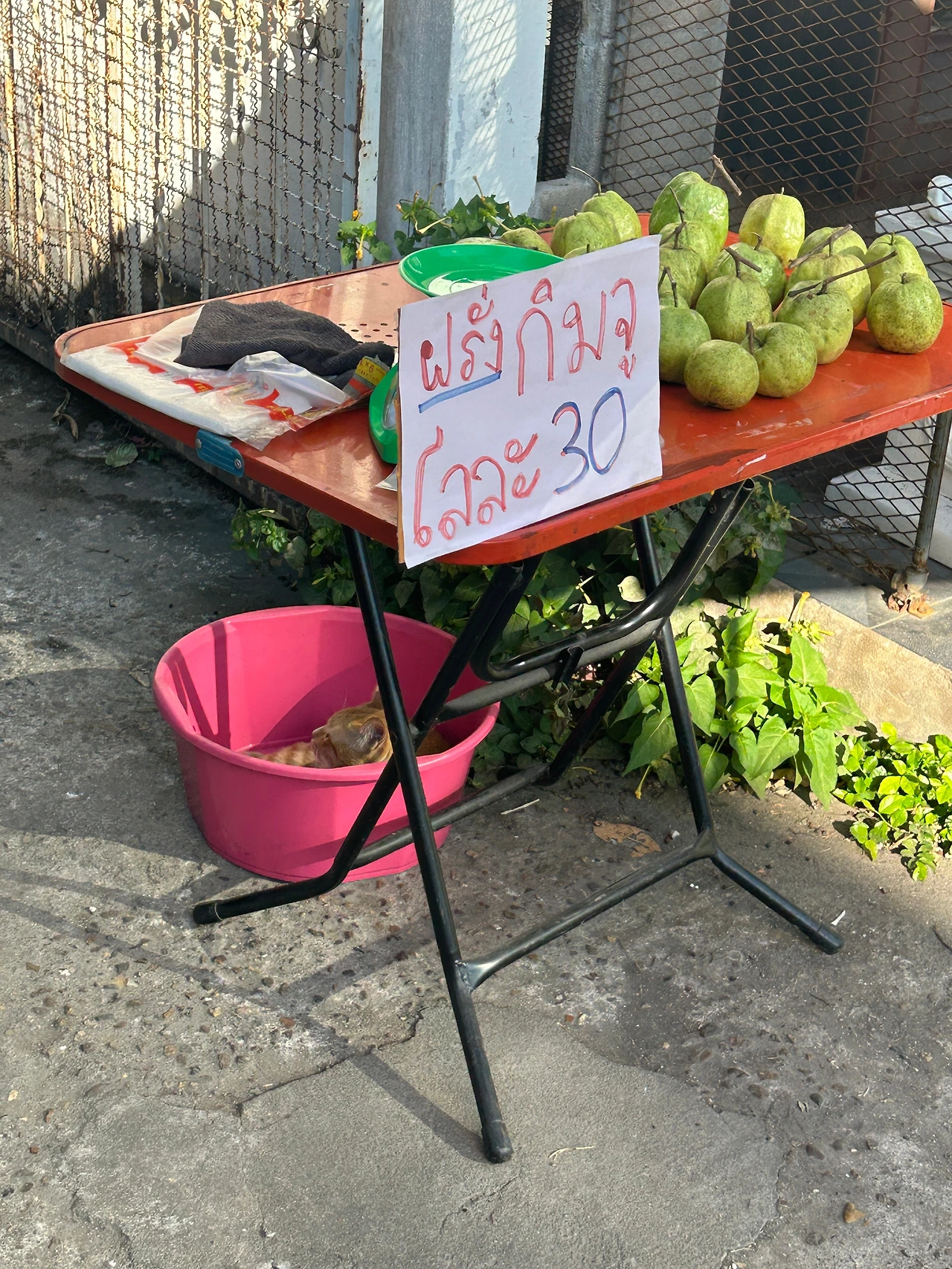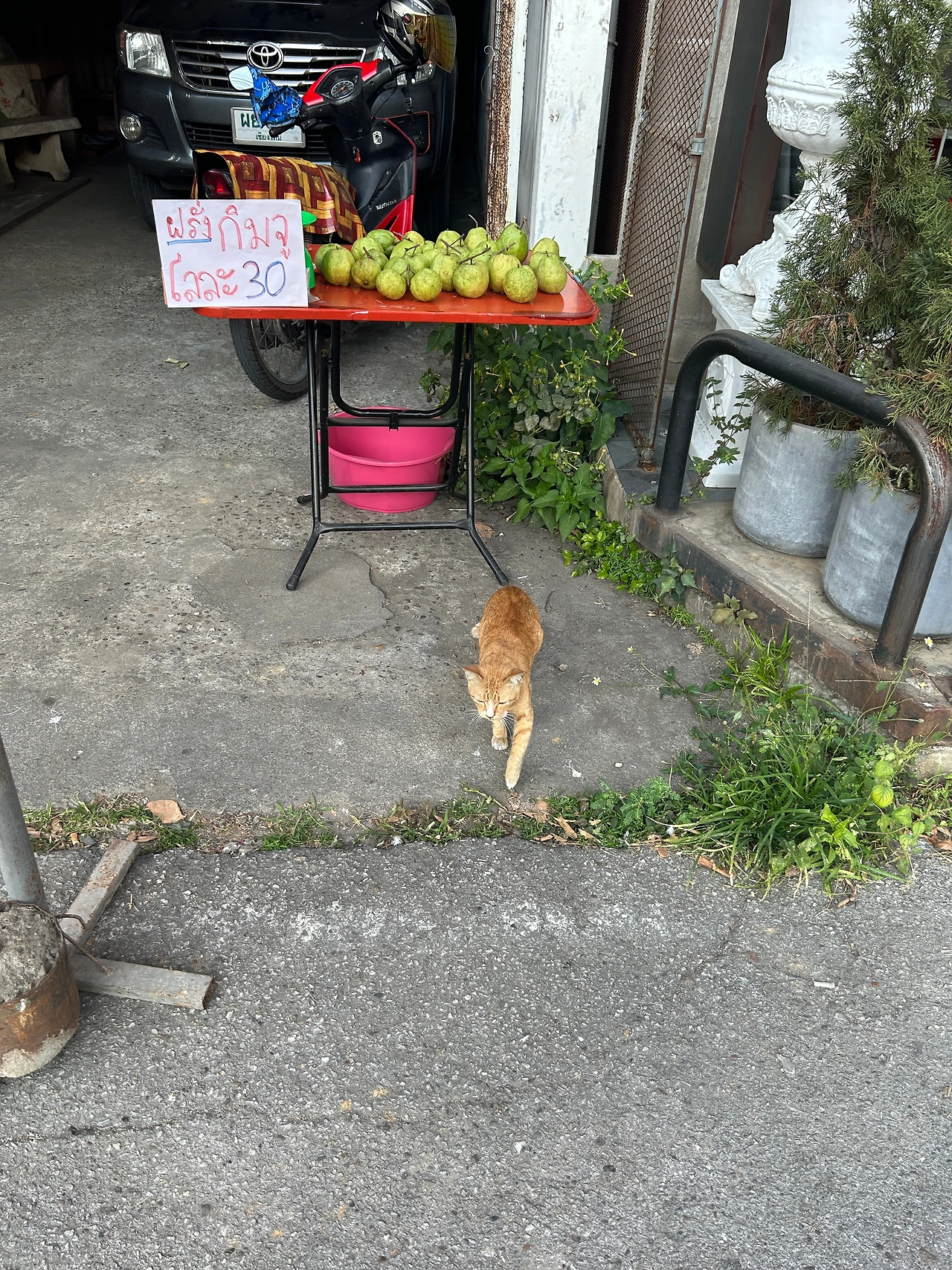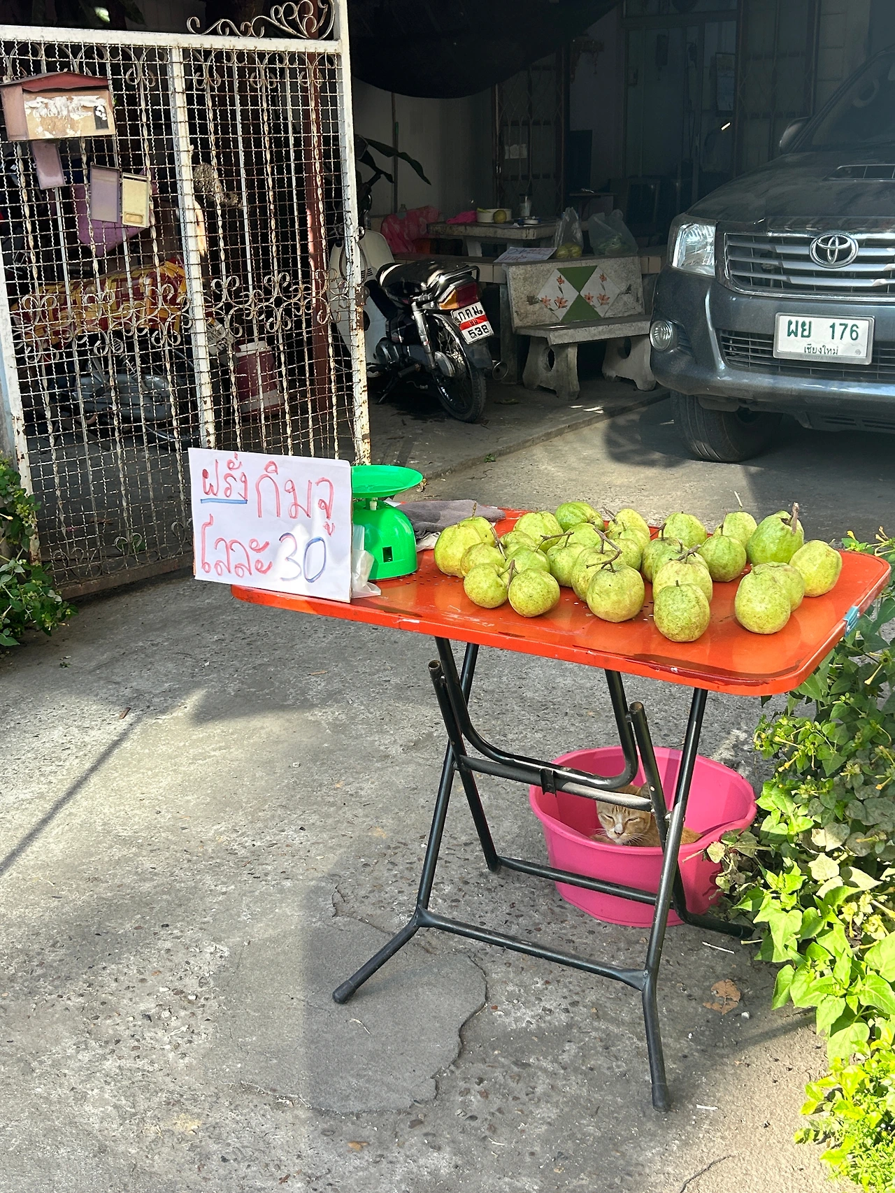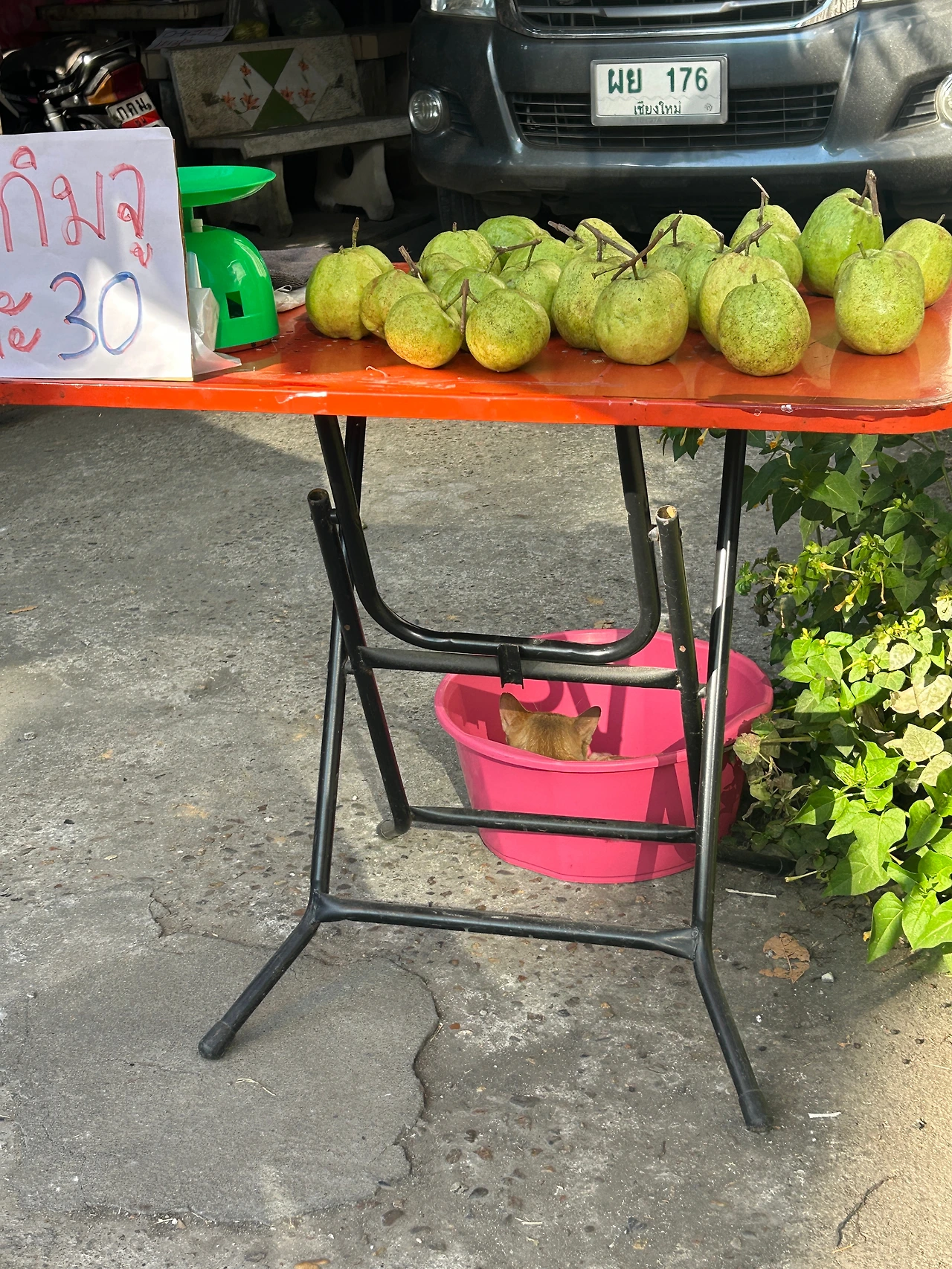 하루를 마치고 집으로 돌아가는 길, 마당에서 갓 따온 듯 울퉁불퉁한 구아바를 늘어놓은 간이 가판대 앞에 멈추어 섰다. 태국어는 모르지만, 대략 1kg에 30바트에 판매한다는 거 아닐까? 주황색 탁자 위에 동글동글 놓아둔 구아바와 초록색 원색의 저울이 아기자기하다. 그런데 어라, 역시나 오늘도 주인은 온데간데없고, 가판대 아래 놓아둔 바구니엔 고양이 한 마리가 쏙 들어가 있다.