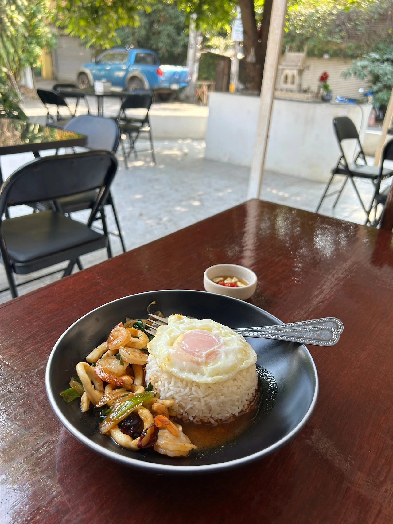 식당에 도착하자마자 오징어와 새우를 넣은 바질볶음덮밥을 주문했다. 하얀 쌀밥에 매콤하게 볶아낸 바질볶음 덮고, 지글지글 끓는 기름에 살짝 튀기듯이 부친 계란후라이 하나 올리면, 닳아가는 내 영혼의 건전지를 충전해 줄 한 끼 완성!
