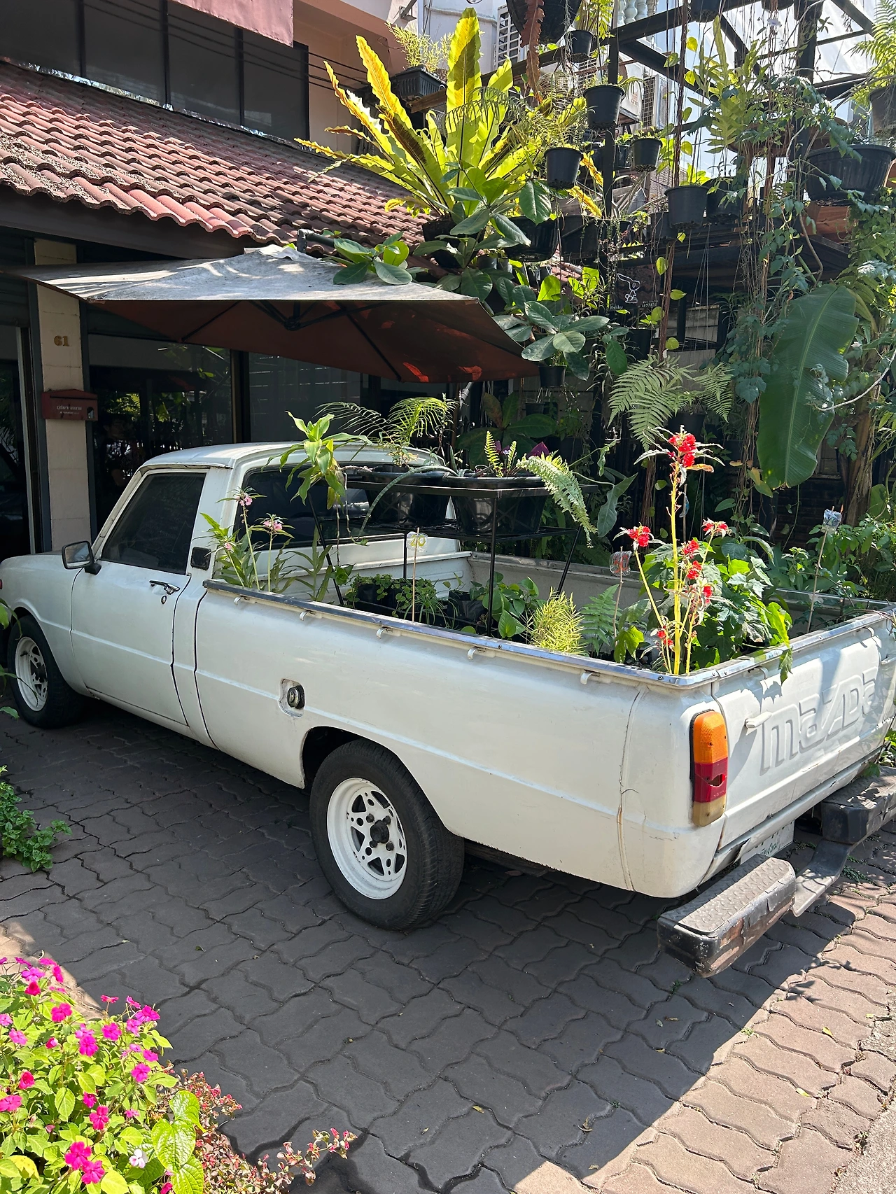 마당조경을 위해 과감히 트럭 하나를 희생한 건지, 아니면 배달준비 중인 꽃집트럭인 건지. 하얀 자동차에 가득 피어난 초록색 잎사귀들이, 도시와 자연이 서로를 벗 삼아 살아가는 치앙마이를 꼭 닮았다.