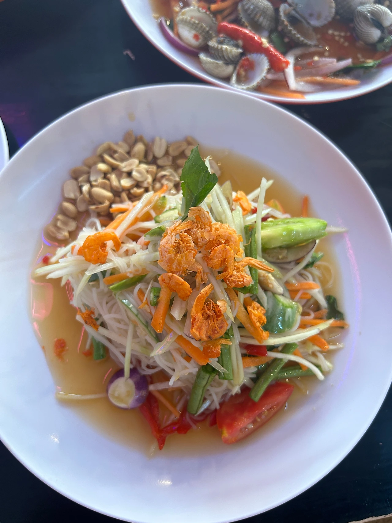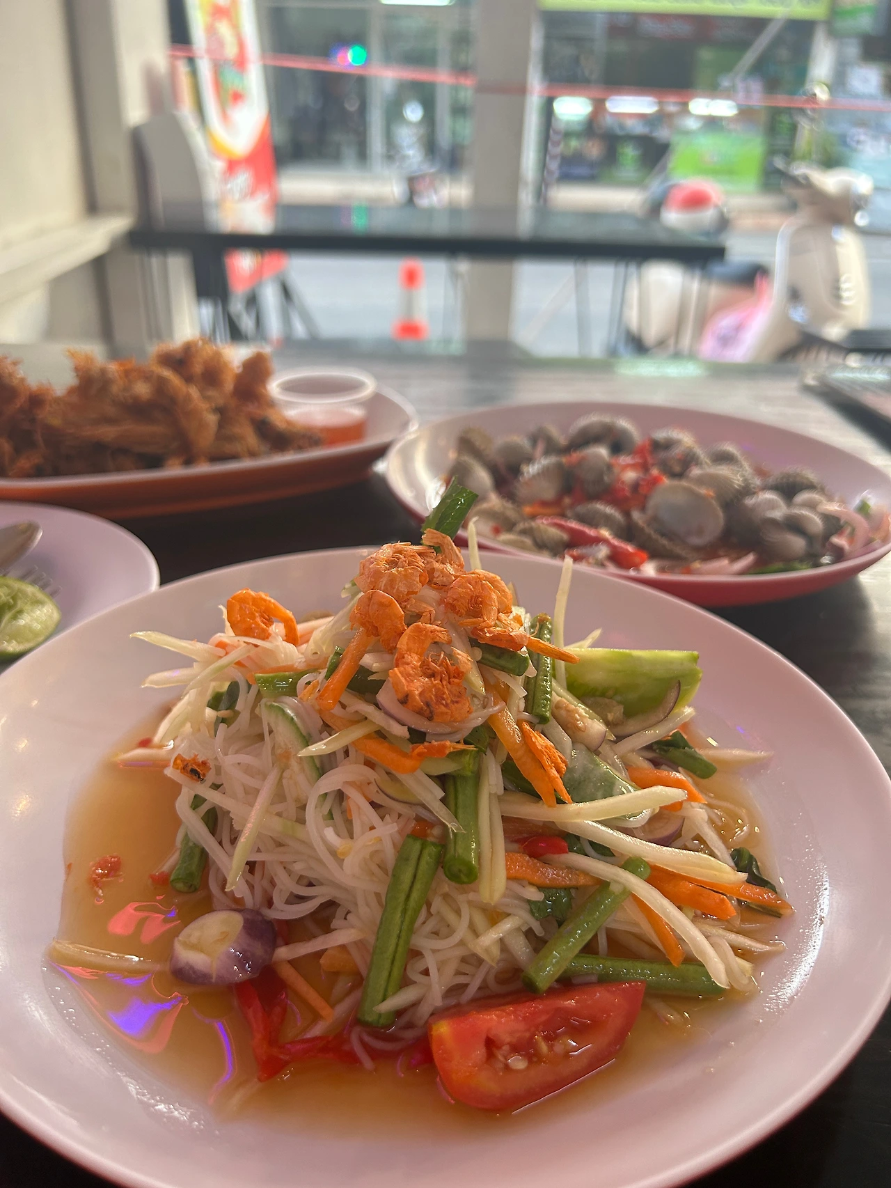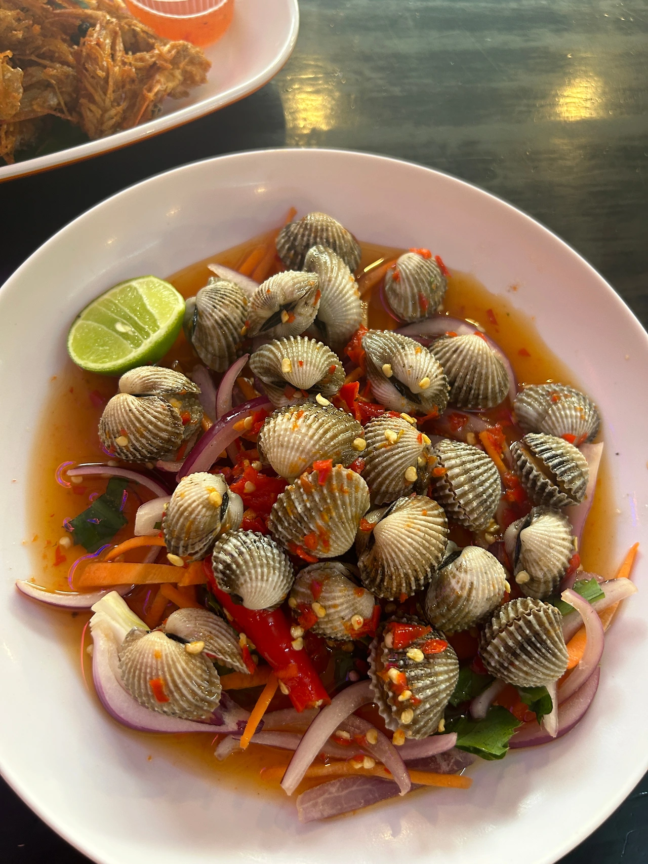 사람 생각 다 똑같은지, 그간 태국에서 맛본 꼬막은 전부 살짝 삶아서 소스에 버무린 것들이었는데, 이번에 주문한 꼬막도 비슷하게 요리되어 나왔다. 양념은 새콤한 라임에 태국고추를 넣어 매콤함을 가미했는데, 쏨땀에 재료만 파파야에서 꼬막으로 바꾼 것 같은 느낌이었다. -내가 주문한 게 혹시 ‘꼬막쏨땀’이었나?-