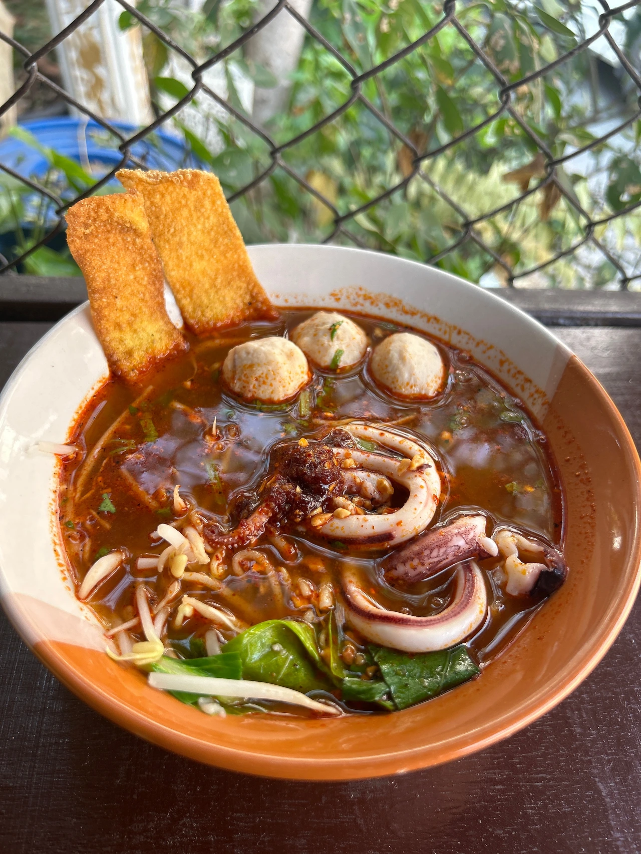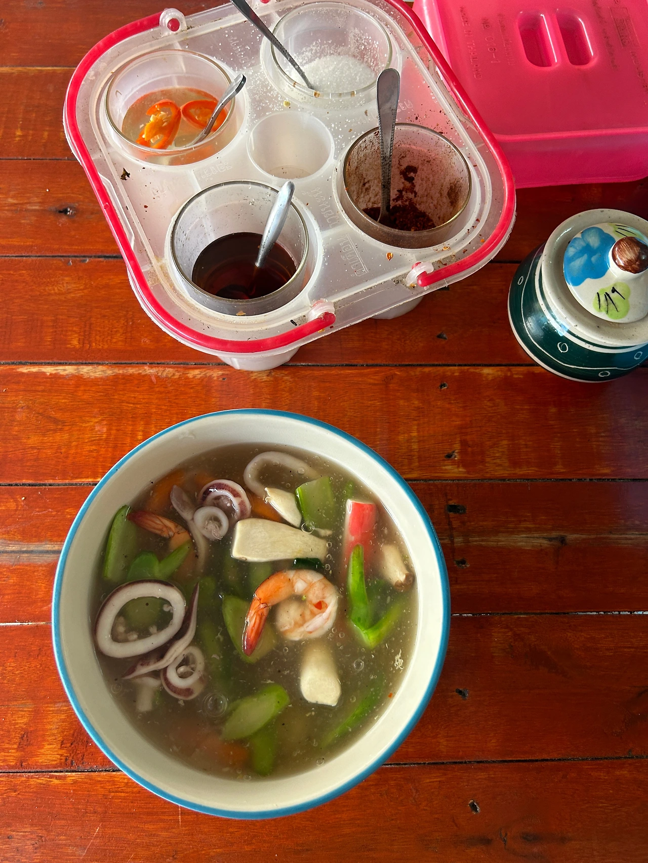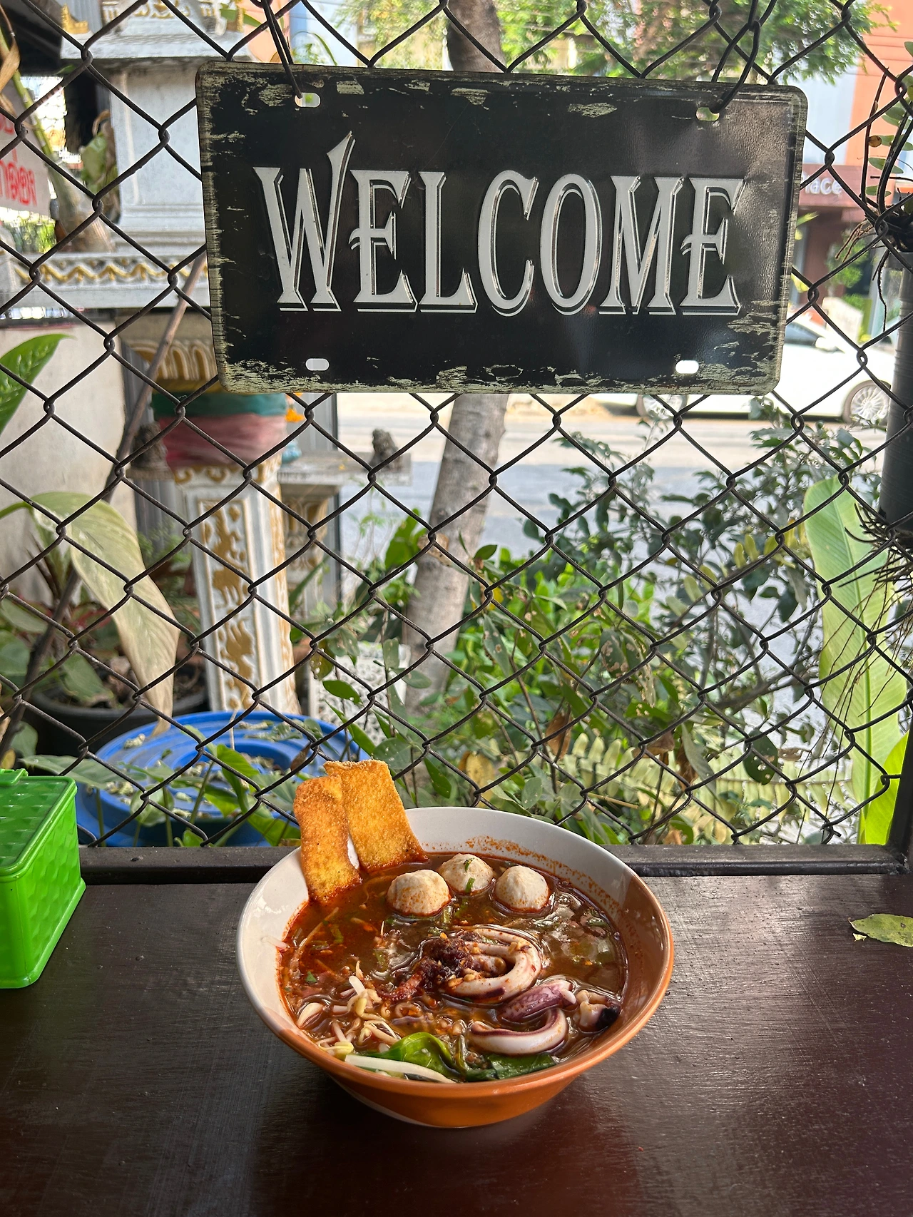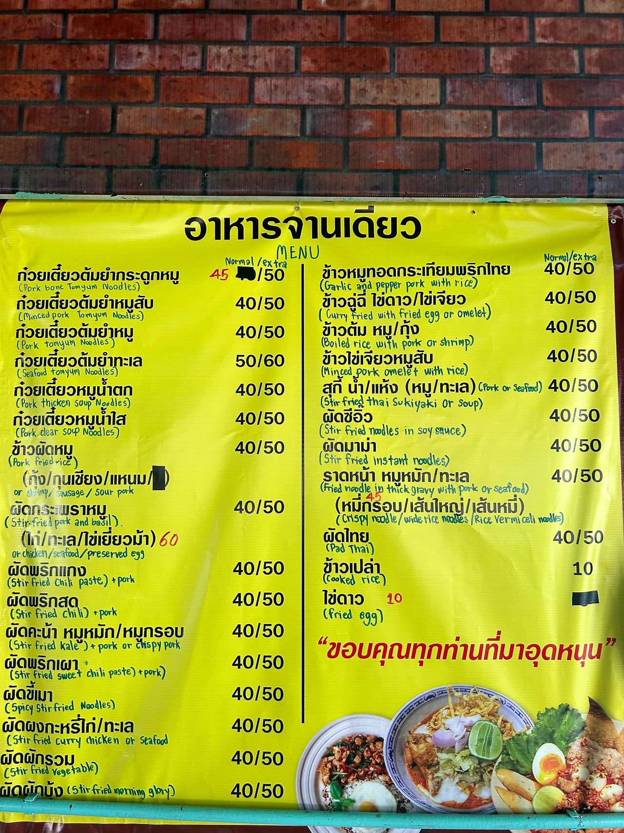 아직 태양이 기세등등한 시간, 구글지도에 현지인들이 남긴 리뷰를 보고 동네어귀의 작은 식당을 찾았다. 아무래도 내 단골식당이 될 집들의 법칙인지, 이 집도 주방이 뻥 뚫려있어 요리하는 모습을 훤히 지켜볼 수 있었다. 실은 파아란 벽에 걸린 노오란 메뉴판에서 쌀국수를 넣은 똠얌수프를 발견했을 때만 해도 ‘그래, 오랜만에 똠얌을 한 번 먹어줘야지!’ 싶어 반가웠을 뿐, 이 아담한 주방에서 요리한 음식이 태국식 매운맛의 지평을 내가 그간 알고 있던 곳에서 한 단계 위로 끌어올려줄 거라곤, 전혀 예상치 못했었다.