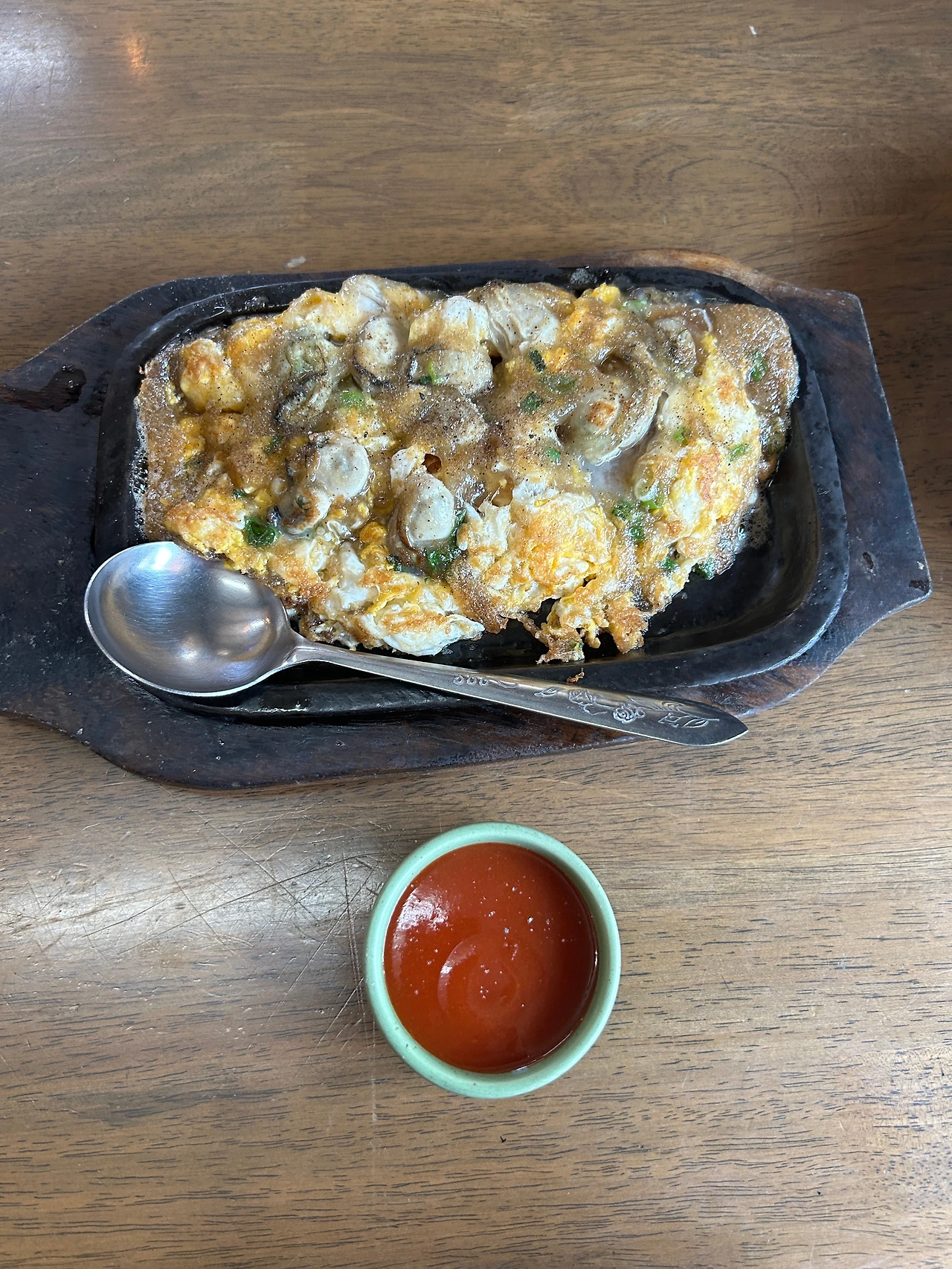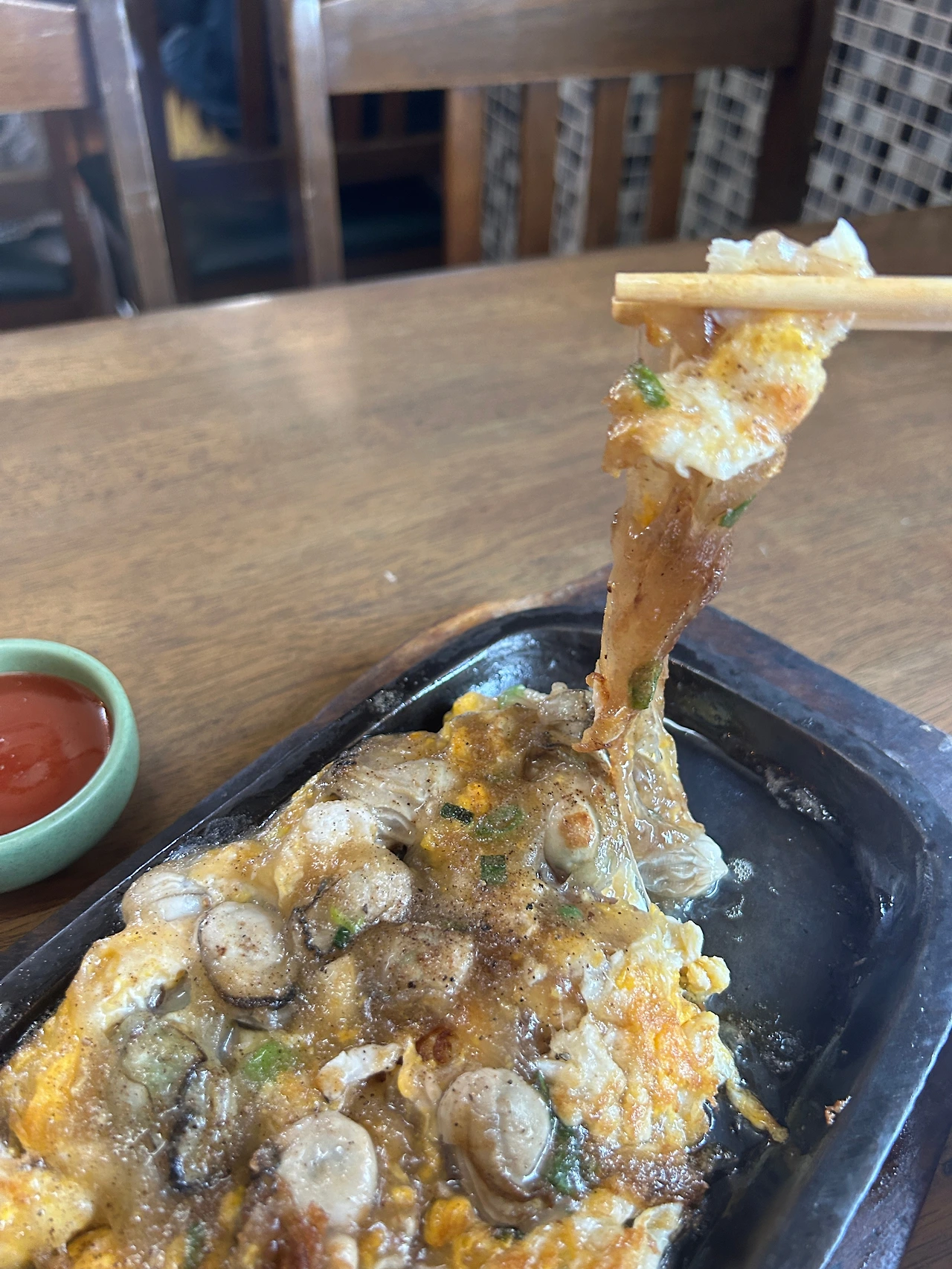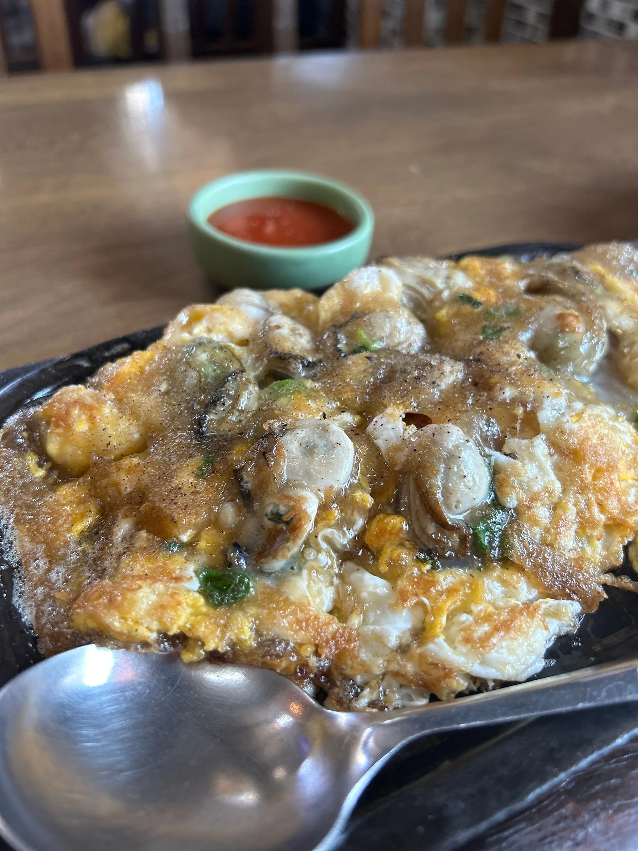 음식을 보글보글 끓는 채로 먹으려고 ‘뚝배기’라는 그릇까지 고안해 낸 한국인들이 이런 귀한 대접을 마다할 리가! 내 앞에 놓인 후로도 돌판 가장자리에선 기름이 여전히 지글지글 맛깔나는 소리를 내며 끓어올랐다. 그 난리법석의 와중에도 굴은 알알이 탱글탱글 살아있는 걸 보니, 맛이 없을 수 없겠다는 생각이 든다.