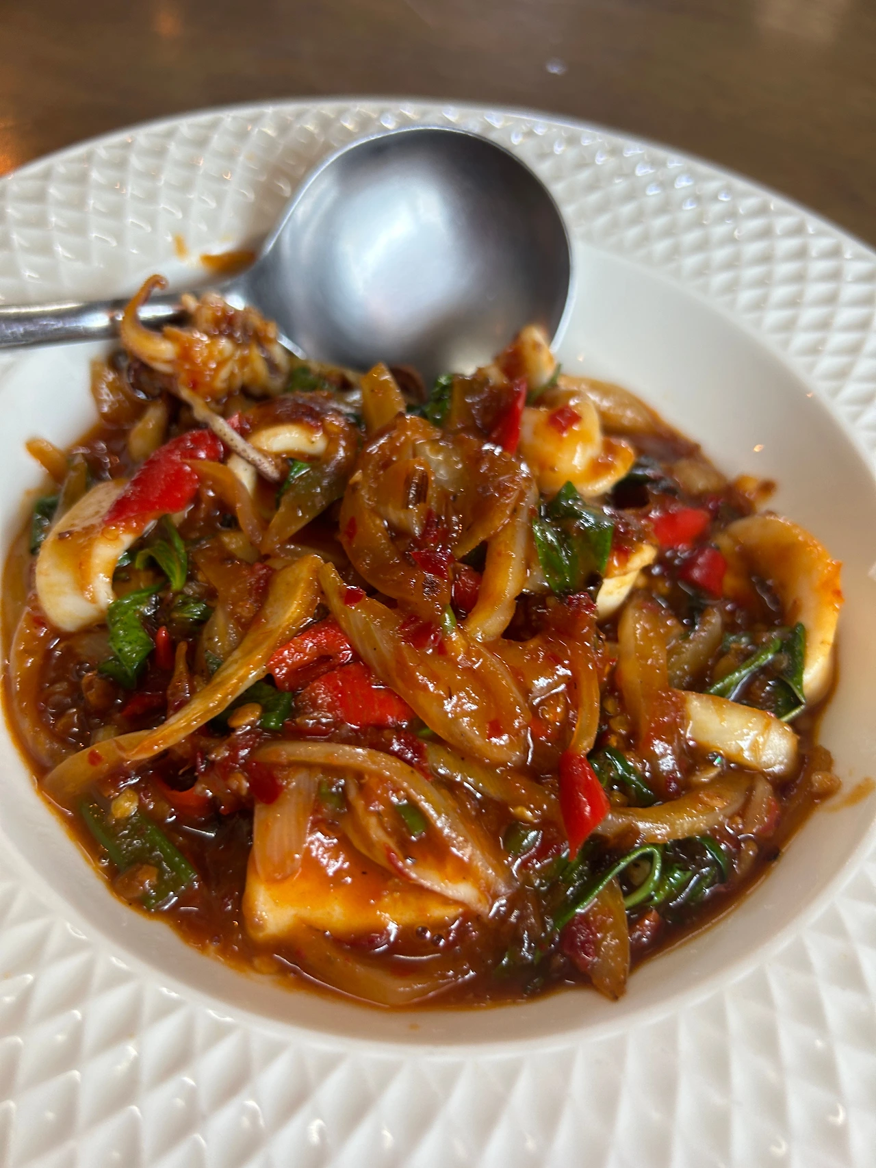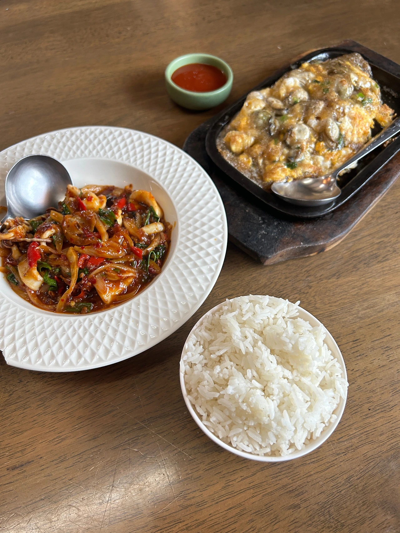 뒤이어 나온 오징어볶음은 청양고추를 넣은 것처럼 -아마도 태국고추를 넣었을 테지만- 칼칼하고 깔끔한 매운맛이 역시나 지글지글 끓는 기름을 반짝반짝 윤이 나도록 머금은 굴전과 잘 어울렸다. 오징어볶음은 태국식과 한국식을 불문하고 내 영혼의 음식인지라 그간 동네식당을 두루 돌아다니며 ‘바질오징어덮밥’을 여러 그릇 먹었는데, 역시 이렇게 한 접시로 요리해주는 오징어볶음은 아무래도 오징어 한 마리를 전부 넣어서 요리하기 때문인지 덮밥에 살짝 덮여있을 때보다 좀 더 깊은 맛이 나는 것 같다. 태국식 오징어볶음은 한국식 오징어볶음과도 크게 다르지 않은 맛인데, 인상 깊은 건 치앙마이 식당들 중에 오징어를 질기게 요리하는 집은 여태껏 단 한 집도 없었다는 거다.