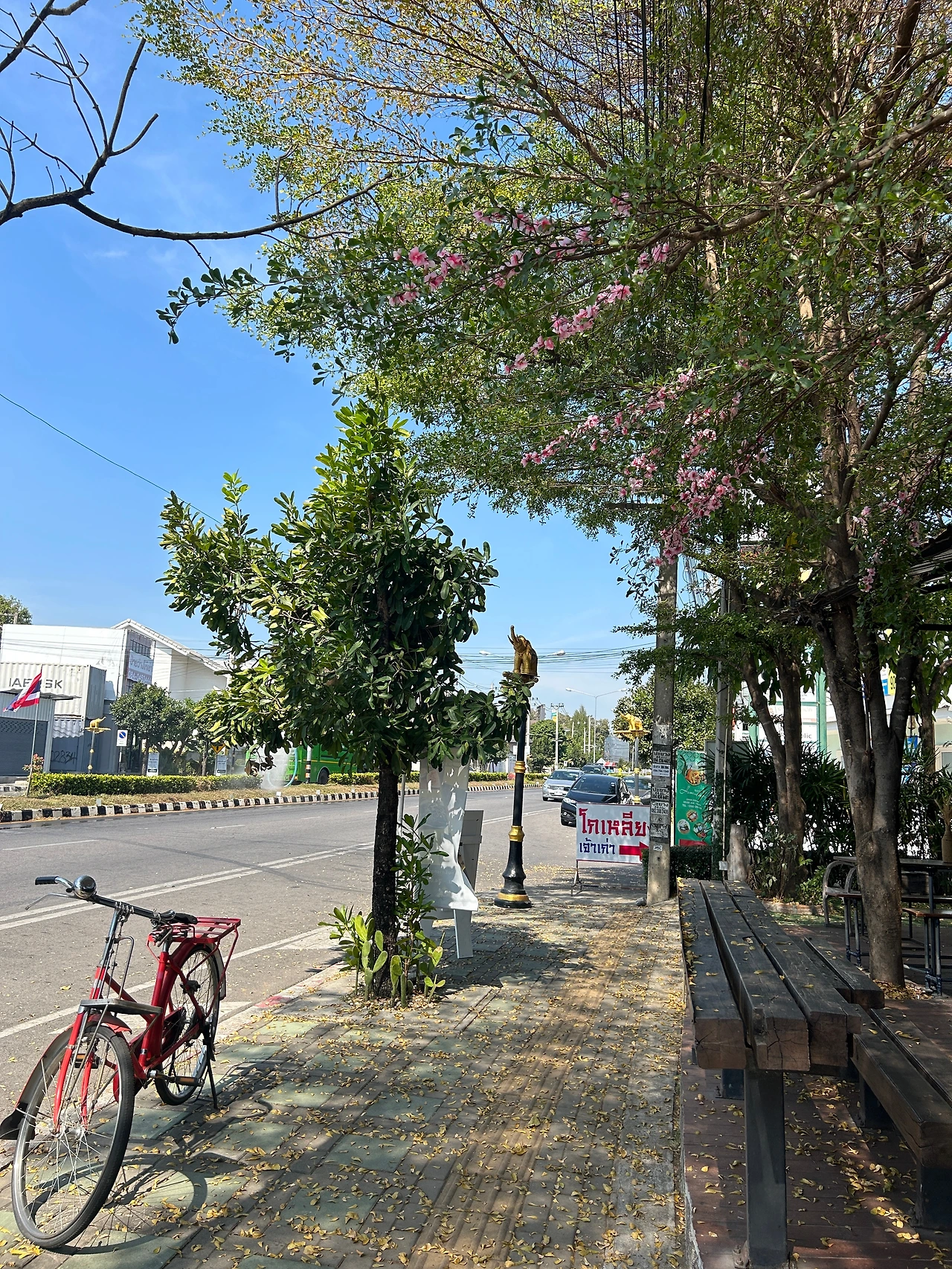 그렇다면, 당장 먹어보지 않을 수 없지! 창푸악 이곳저곳에 단골식당들이 생기며 요즈음 한동안 ‘갔던 식당 또 가는’ 재미에 푹 빠져있었는데, 오늘은 이른 아침부터 신발끈 단단히 묶고 먼 남쪽으로 길을 나섰다. 치앙마이는 공항이 도심에서 자동차로 5-10분 정도밖에 걸리지 않는데, 식당에 거의 도착할 무렵이 되니 저기 지평선 너머에서 연신 비행기가 뜨고 내리는 모습이 보였다. 항공안전 때문인지 어느 순간부터 주변에 높은 건물은 하나도 보이질 않고, 탁 트인 시야에 마음도 덩달아 활짝 열렸다. 담장마다 꽃이 흐드러지게 핀 낯선 골목길엔 정오의 햇살이 평온하게 웅크린 채 오수에 빠져있었다.