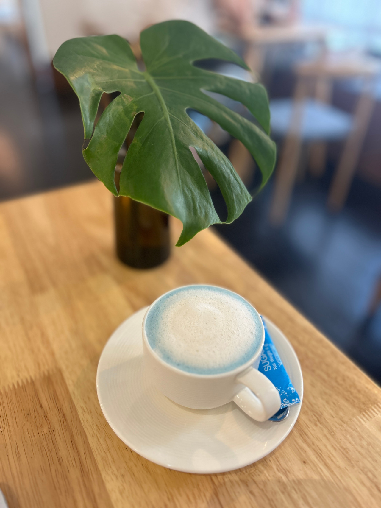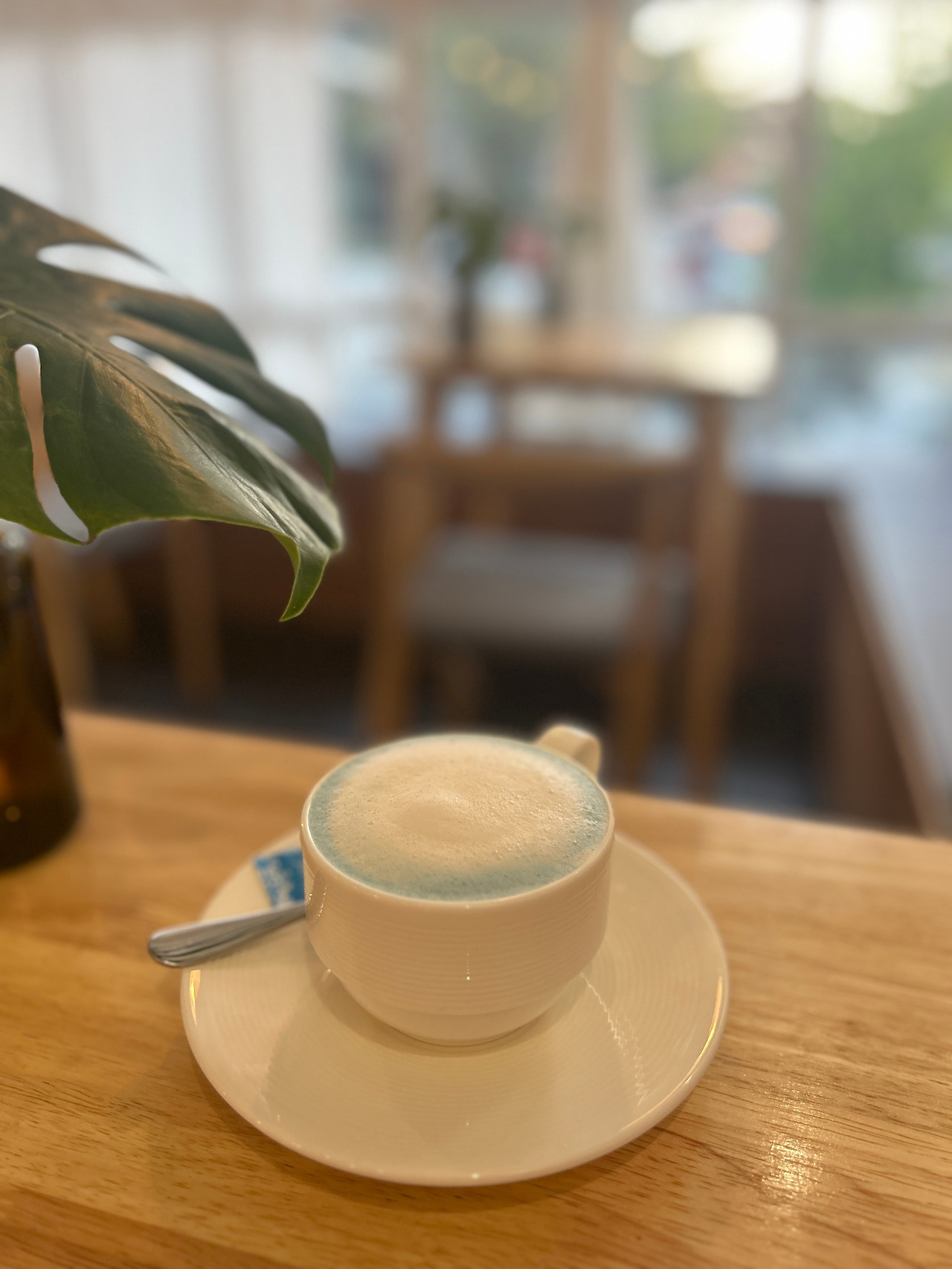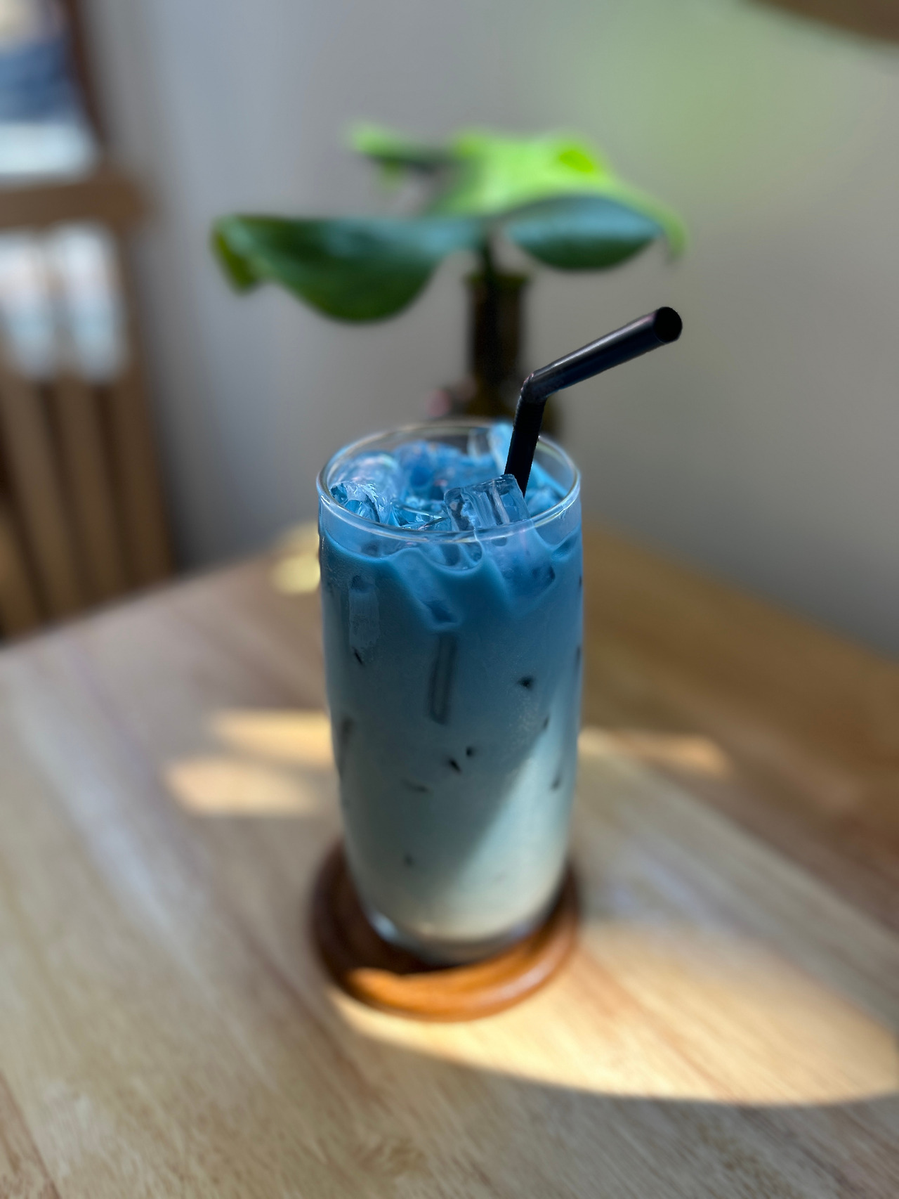 단골카페로 후딱 자리를 옮겨 내 ‘치앙마이 단골메뉴’인 버터플라이피 티라떼를 주문했다. 짙은 보라색을 띠는 나비콩ButterflyPea의 꽃은 잘 말려서 우려내면 꽃잎을 꼭 빼닮은 신비로운 보랏빛을 뿜어내는데, 신기하게도 흰 음료와 만나면 지중해처럼 시원한 푸른빛으로 변신한다.