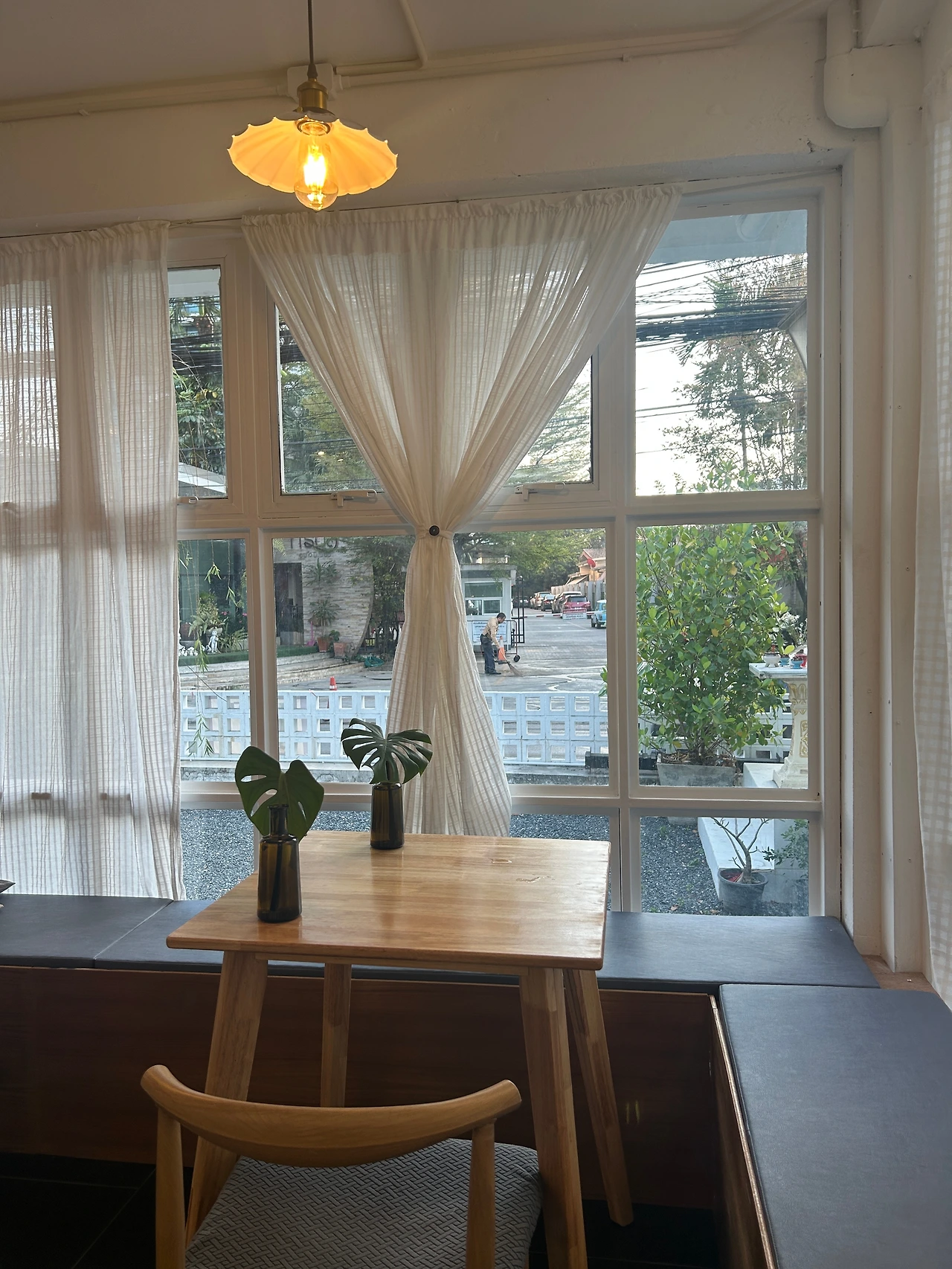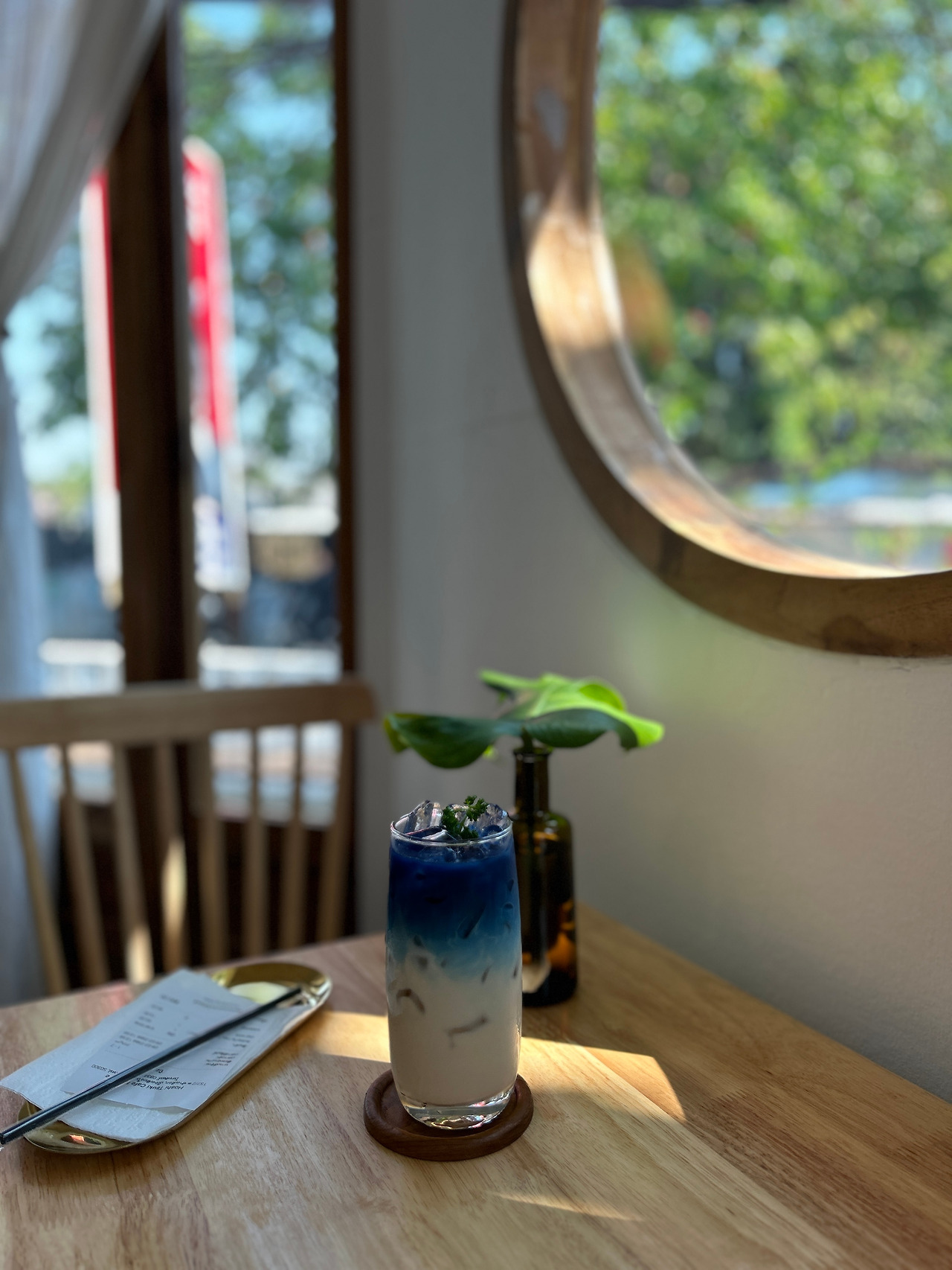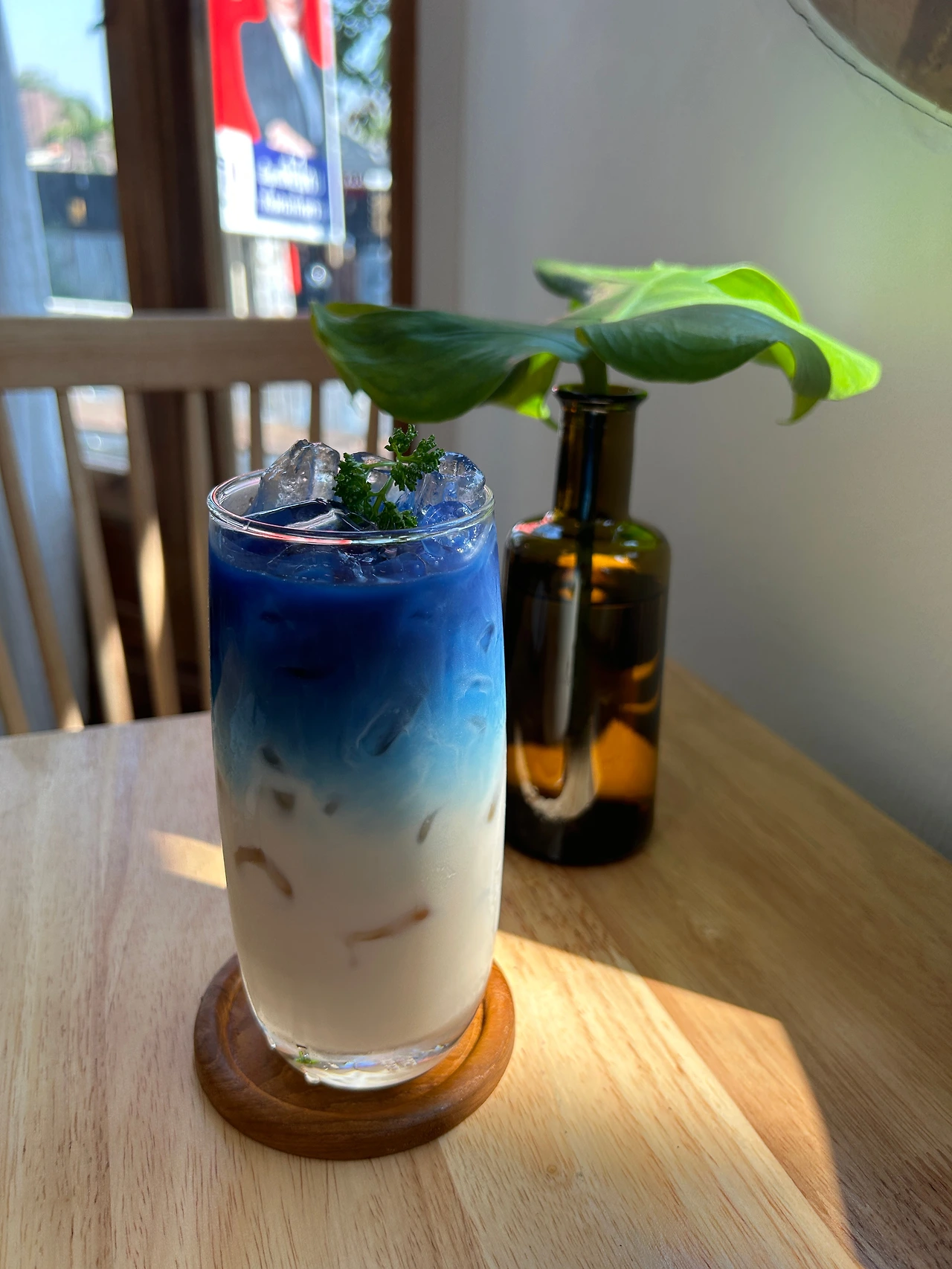 단골카페로 후딱 자리를 옮겨 내 ‘치앙마이 단골메뉴’인 버터플라이피 티라떼를 주문했다. 짙은 보라색을 띠는 나비콩ButterflyPea의 꽃은 잘 말려서 우려내면 꽃잎을 꼭 빼닮은 신비로운 보랏빛을 뿜어내는데, 신기하게도 흰 음료와 만나면 지중해처럼 시원한 푸른빛으로 변신한다.