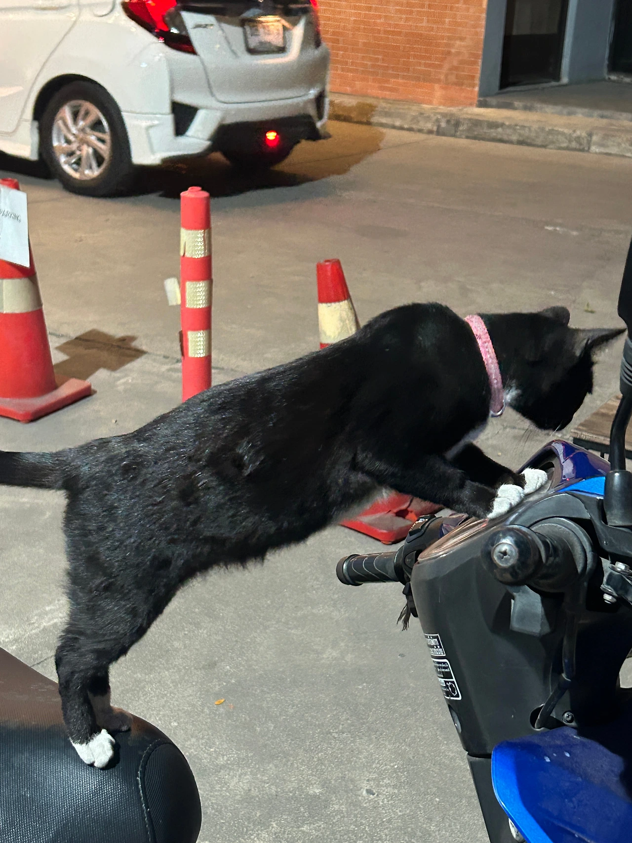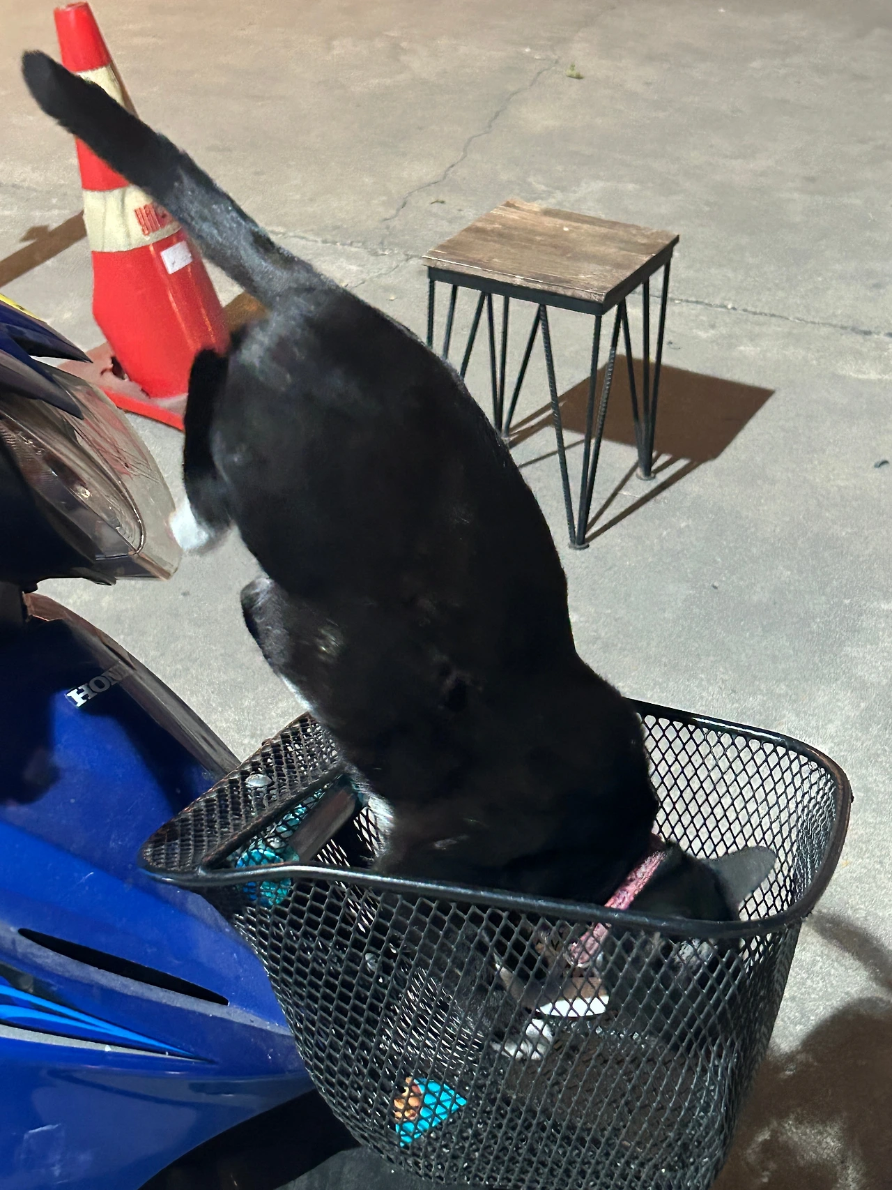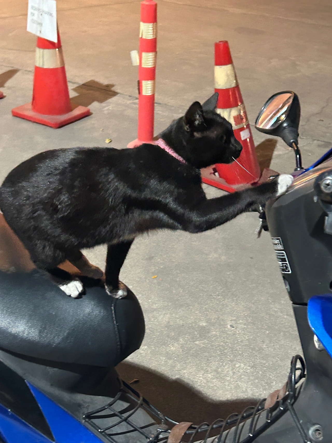 한국인인 나는 덜컥 ‘오토바이 주인이 싫어하진 않을까’ 걱정부터 되는데, 녀석은 오토바이가 제 것인 것처럼 몸을 쭈욱 일으켜 운전대까지 잡는다. ‘안 돼, 그러다 오토바이가 고장나면 주인이 널 미워할지도 몰라!’ 말리는 내 마음도 모르고, 까만고양이는 풍덩- 다이빙하듯 운전대 앞 바구니로 뛰어들어 버린다.