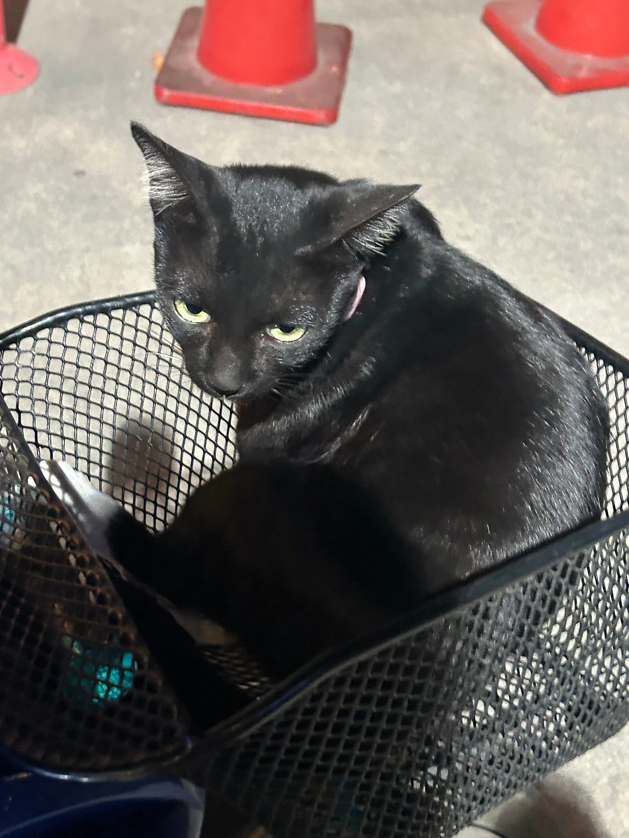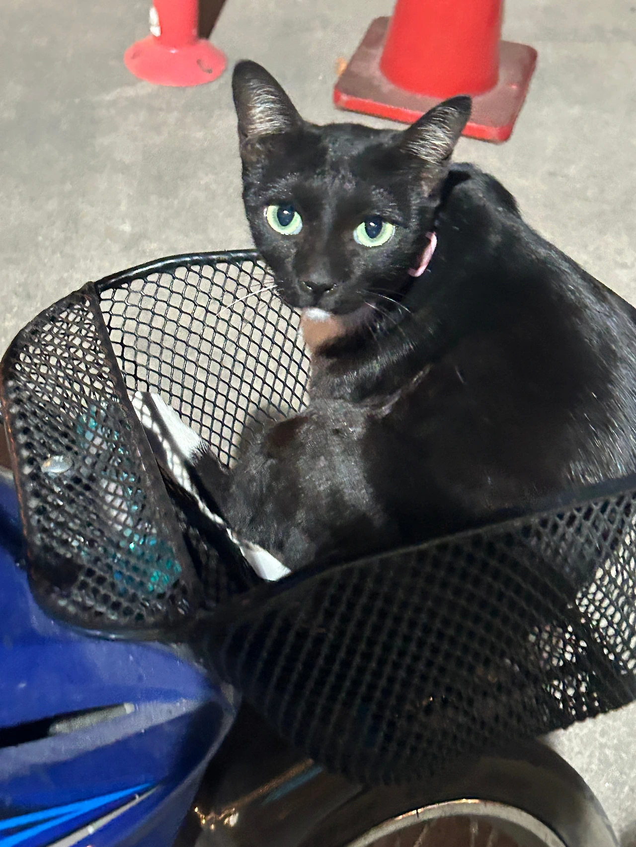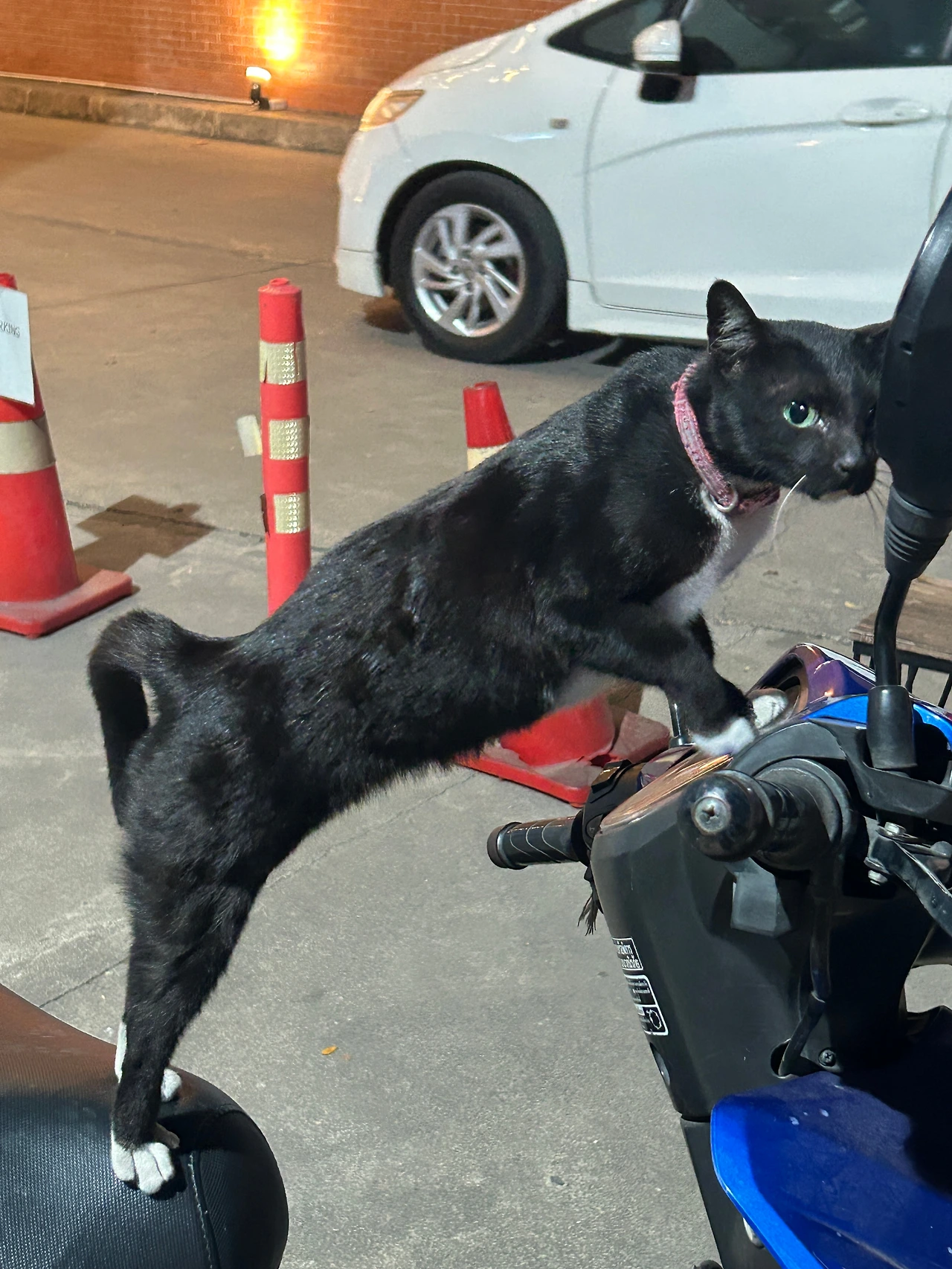 한국인인 나는 덜컥 ‘오토바이 주인이 싫어하진 않을까’ 걱정부터 되는데, 녀석은 오토바이가 제 것인 것처럼 몸을 쭈욱 일으켜 운전대까지 잡는다. ‘안 돼, 그러다 오토바이가 고장나면 주인이 널 미워할지도 몰라!’ 말리는 내 마음도 모르고, 까만고양이는 풍덩- 다이빙하듯 운전대 앞 바구니로 뛰어들어 버린다.