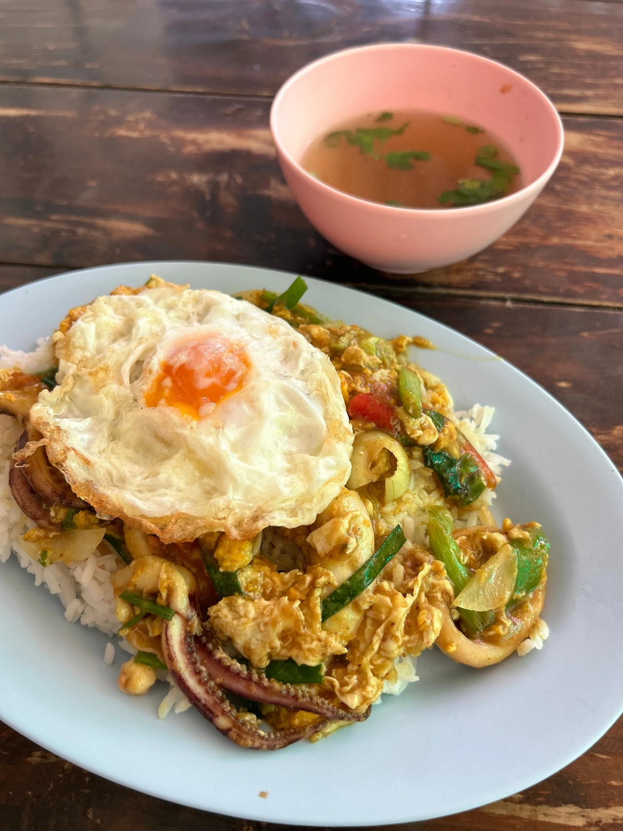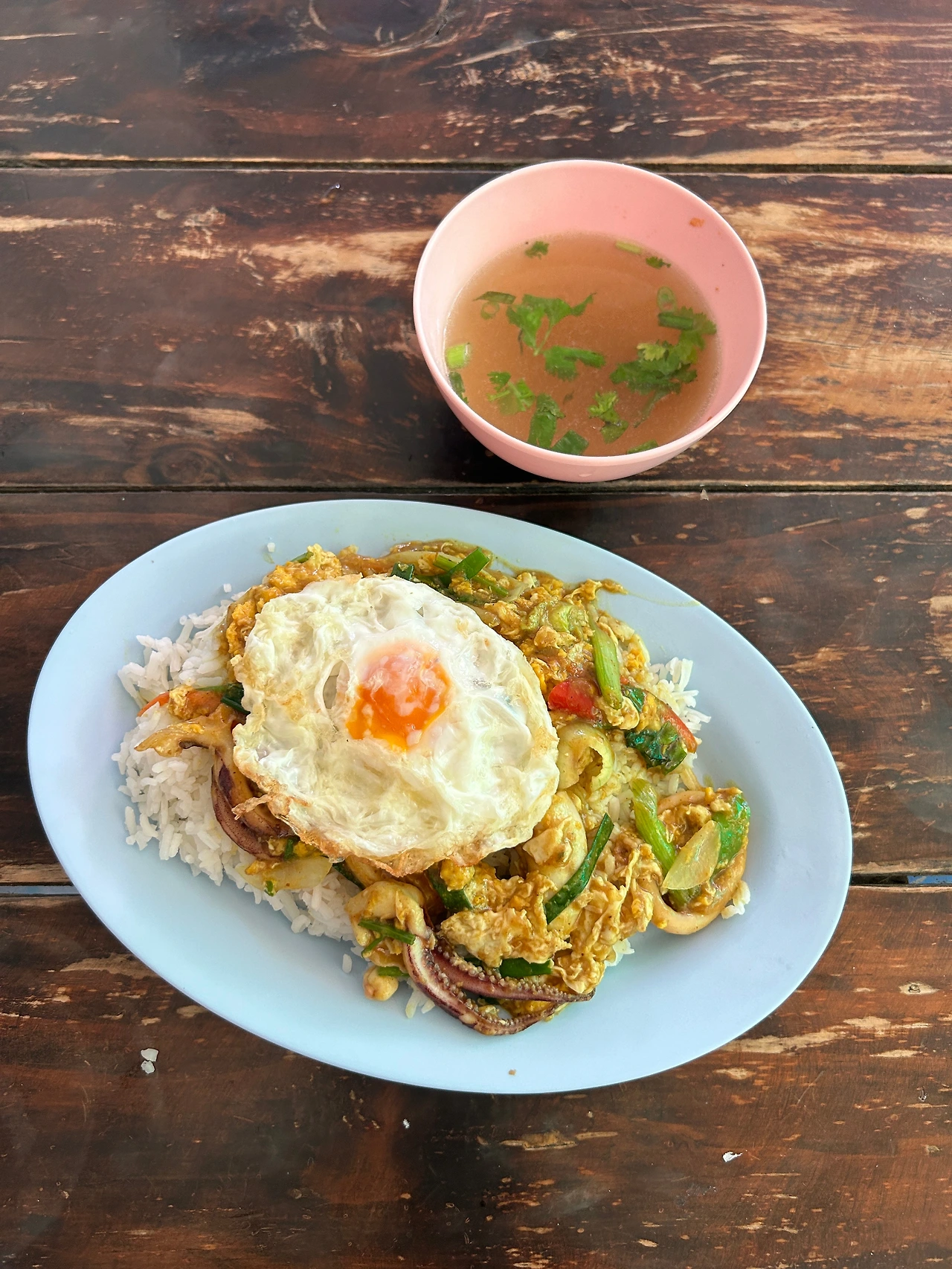 태국음식 하면 소프트크랩을 바삭하게 튀겨 넣고 계란을 풀어 만드는 노란 뿌빳퐁커리가 유명한데, 1인분씩은 잘 팔지 않는 터라 혼자서 여행할 때는 은근히 먹기가 쉽지 않은 메뉴다. 그런데 오징어를 넣어 1인용 덮밥으로 만들어주다니, 안 먹어볼 수가 없지!