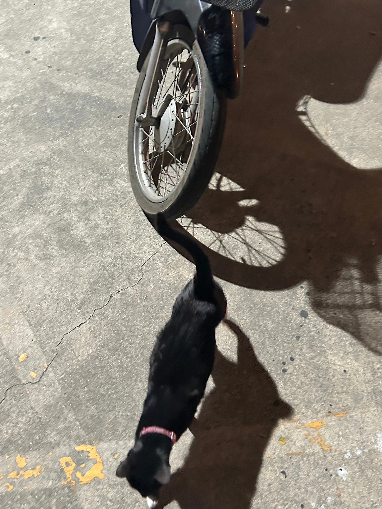 내 발밑에 앉아 한참 요리조리 포즈를 바꾸며 그림자놀이를 하던 고양이가 다시 오토바이로 다가가더니 훌쩍 안장 위로 뛰어오른다.