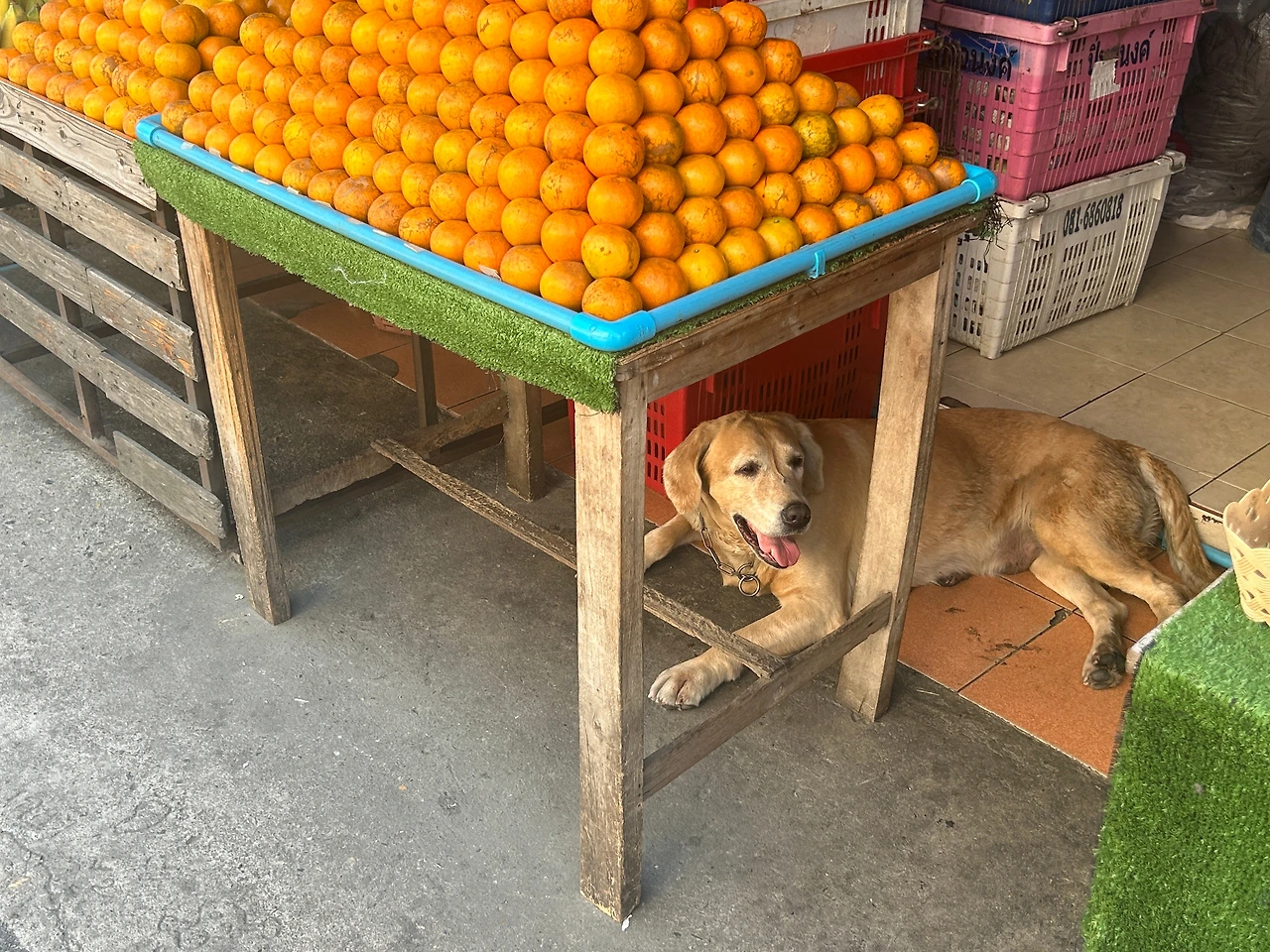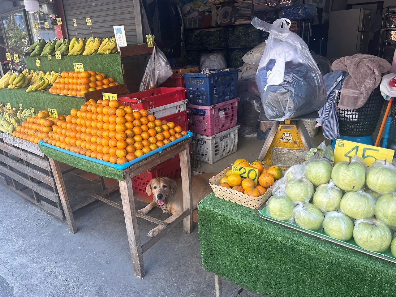 그 옆 좌판엔 하나씩 정성스레 포장해 둔 구아바가 가지런히 집에 데려가줄 손님들을 기다리는 중이다. 태국 노점들은 모두 하나같이 정갈한 솜씨들을 자랑하지만, 이렇게 둥근 과일로 피라미드를 쌓아둔 노점들을 맞닥뜨릴 때면, 꼭 자리를 비우고 없는 주인들을 직접 만난 것처럼 친근한 기분이 든다. 비록 얼굴은 모르지만, 기꺼이 하루의 한 조각을 할애해 정성 들여 이 작은 피라미드를 쌓아둔 주인장은, 아주 느긋하고 낙천적인 사람이 아닐까?