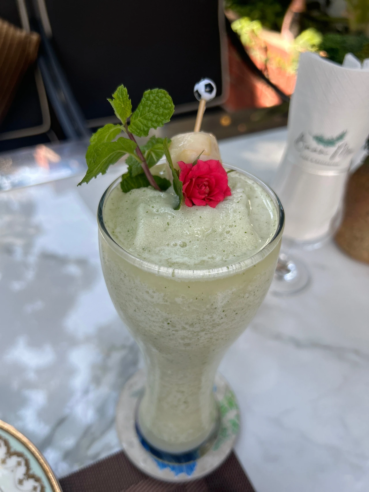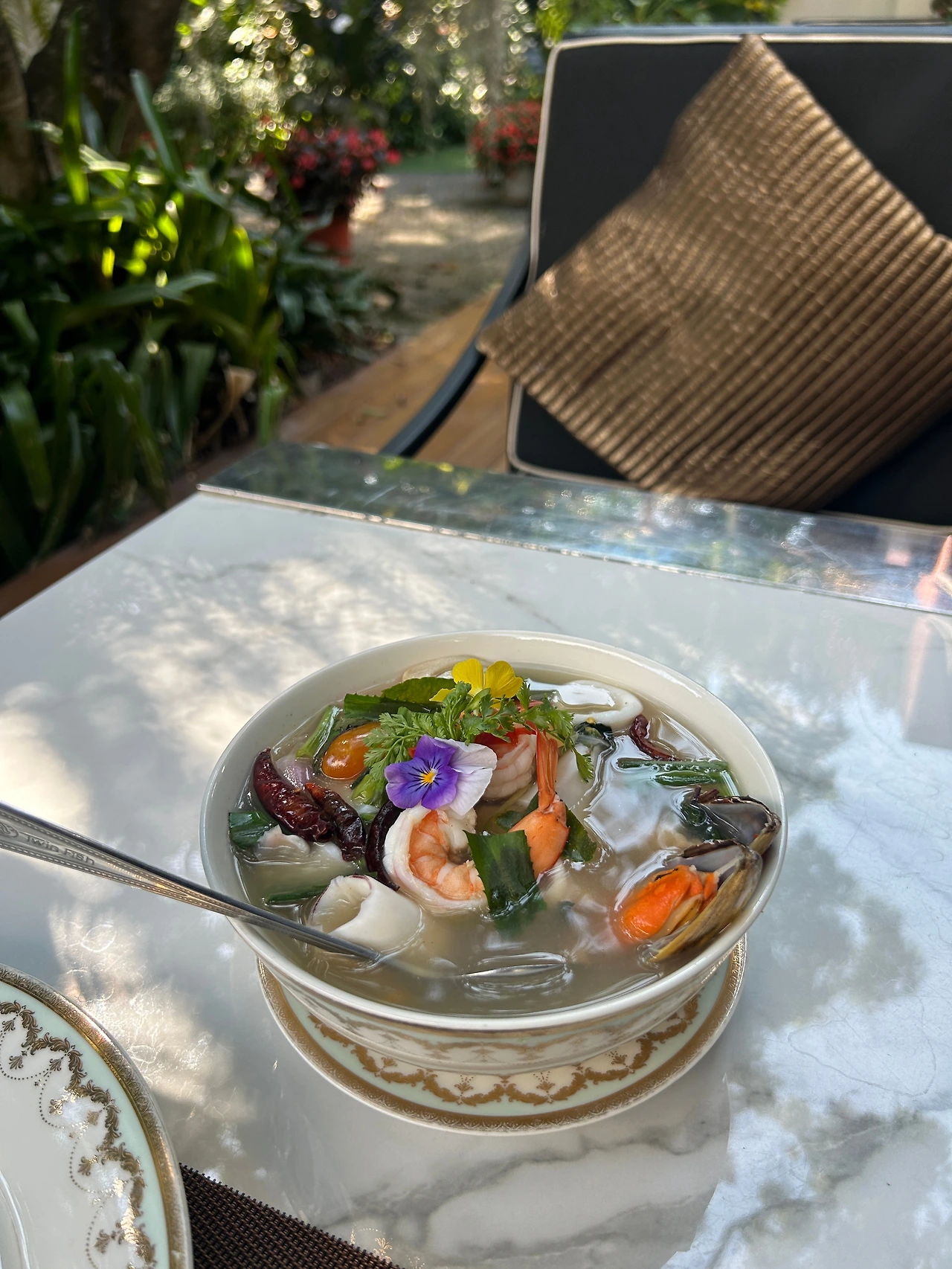 주문한 음식은 초록색 야채와 과일을 갈아 만든 스무디와 해산물을 넣은 맑은 수프. 초록이 무성한 정원 한가운데서 꽃과 해산물로 알록달록하게 채워진 그릇을 서빙받고 나니 꽃다발이라도 한아름 받은 것 같은 기분이다.