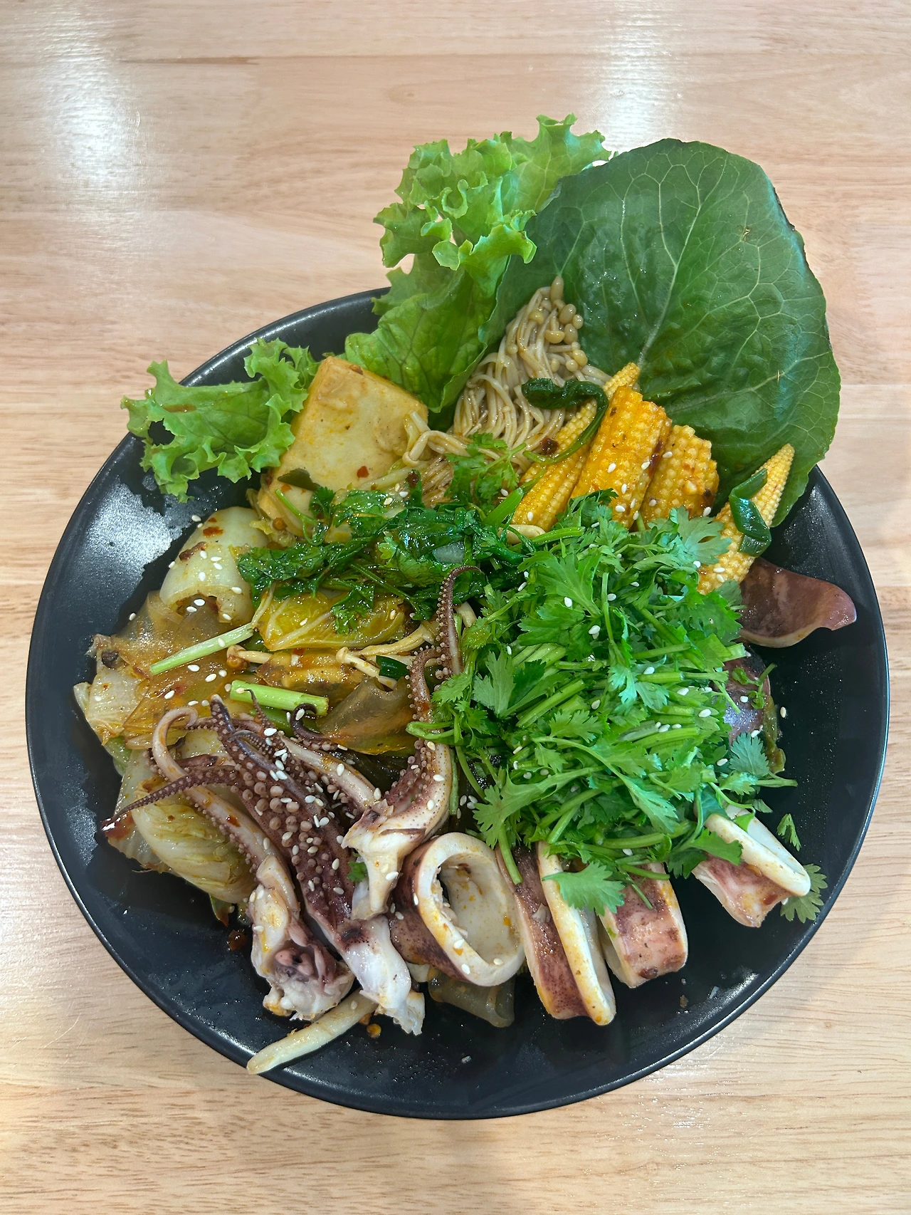 오늘은 특별히 통오징어를 바구니에 담았다. 오징어를 통째로 넣으니 특유의 고소한 얼큰함이 야채에 가득 배었다. 특히 익히면 달달한 맛이 더욱 깊어지는 배추와 매운 양념, 오징어 육수의 조합은 언제나 옳다. 남국에선 흔한 야채인 베이비콘도 매콤한 볶음요리와 찰떡궁합! 초록색 고수도 듬뿍듬뿍 올려주면 무슨 음식이든 태국의 정취가 물씬 배어든다.