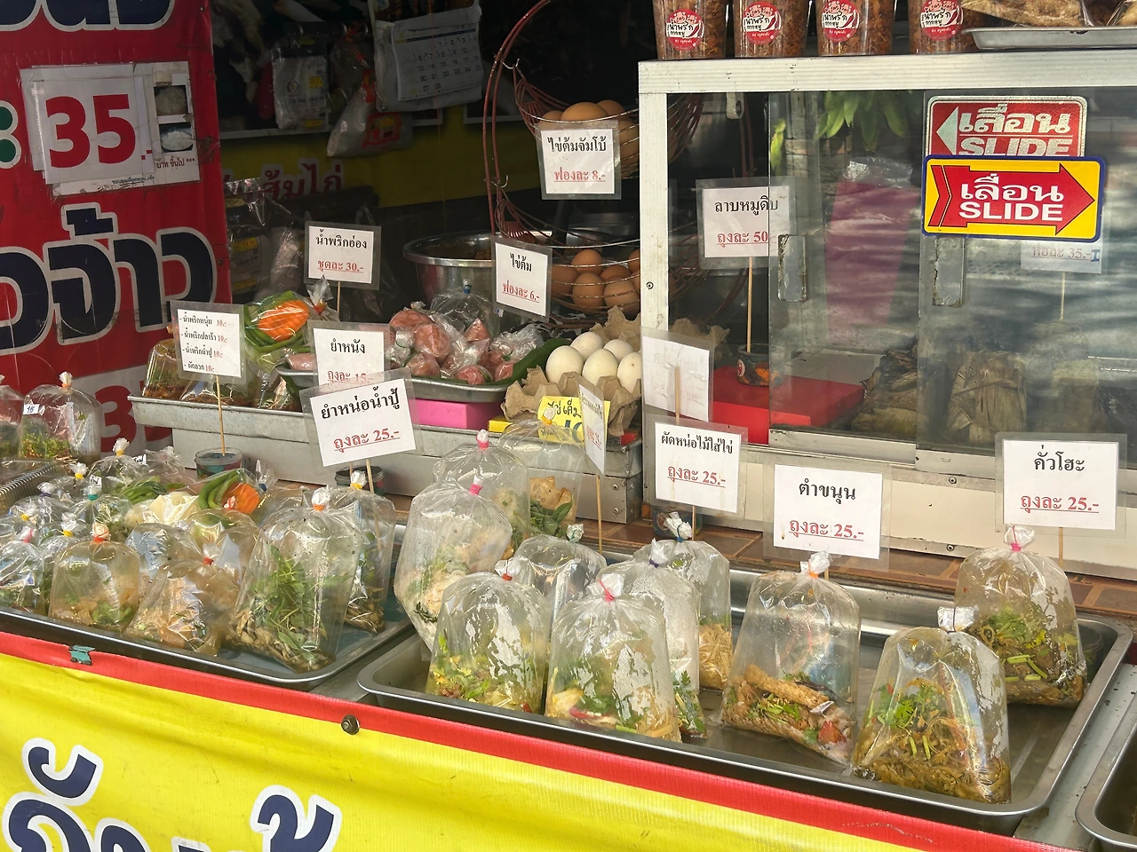 이른 아침부터 부러 ‘다른동네맛집’을 찾아 나선 건, 이전에 ‘랏나맛집’을 방문했을 때 근처에 눈여겨봐 두었던 태국식 디저트가게 때문! 거리에 내어둔 좌판에 진열된 품목들은 타닌시장에 즐비한 디저트가게들과 크게 다르지 않은데, 이 집은 솜씨가 좀 더 야무져 보인다. 지난번에 이 앞을 지나칠 땐 디저트들이 거의 다 팔리고 없었는데, 오늘은 다행히 대부분의 종류가 아직 남아있다.