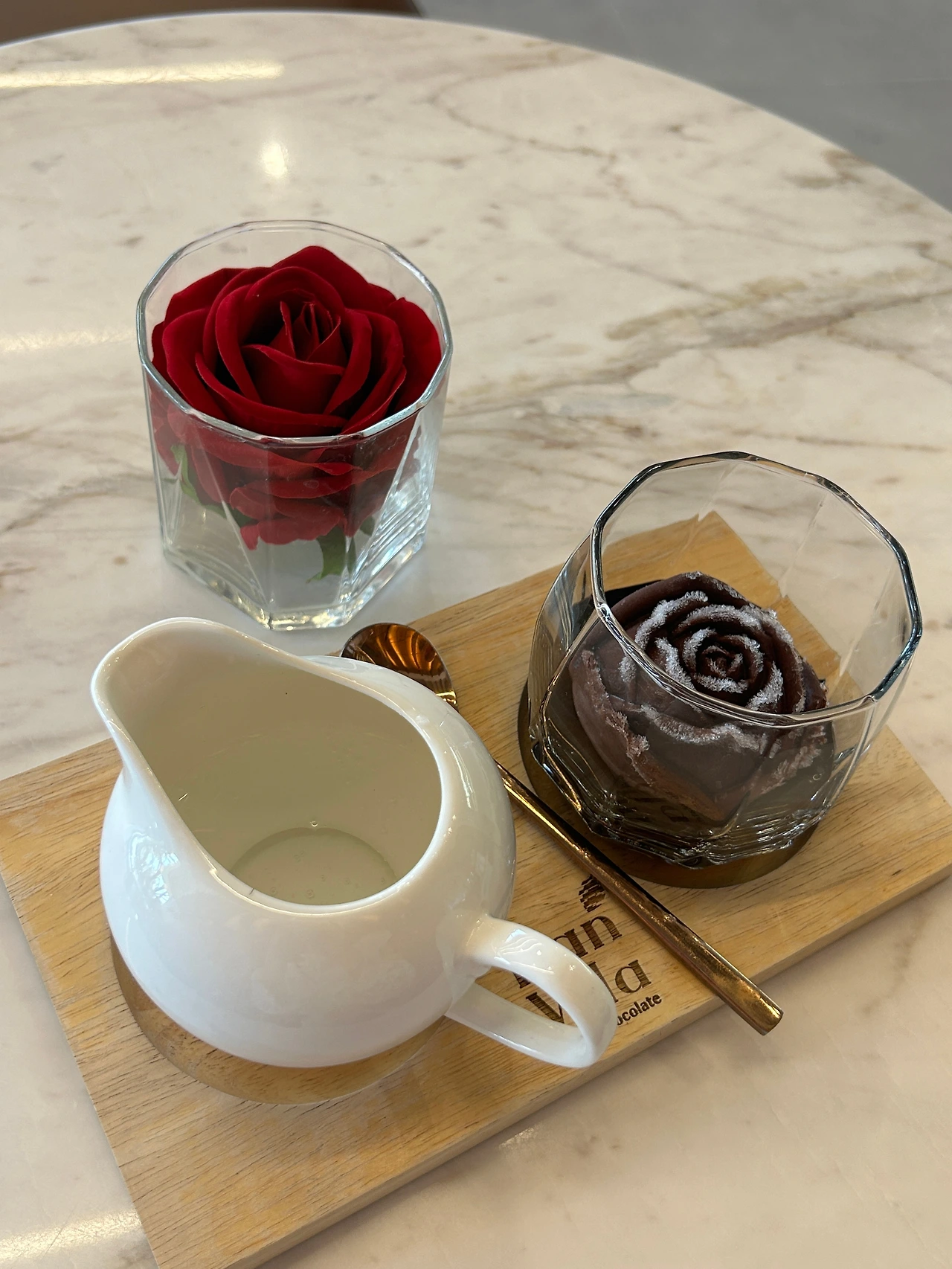 장미꽃 모양으로 살짝 얼린 다크초콜릿에 톡 쏘는 탄산을 부어 먹는 음료를 주문해 보았다. 장미초콜릿이 든 컵에 탄산수를 꼴꼴꼴 부어주면 뽀글뽀글 탄산기포가 올라오면서 초콜릿이 서서히 녹는데, 놀이공원에서 처음 보는 놀이기구를 타는 것처럼 컵에 탄산을 따르고 그 모습을 지켜보는 것만으로도 한낮의 무더위가 싹 가실 정도로 즐거웠다.