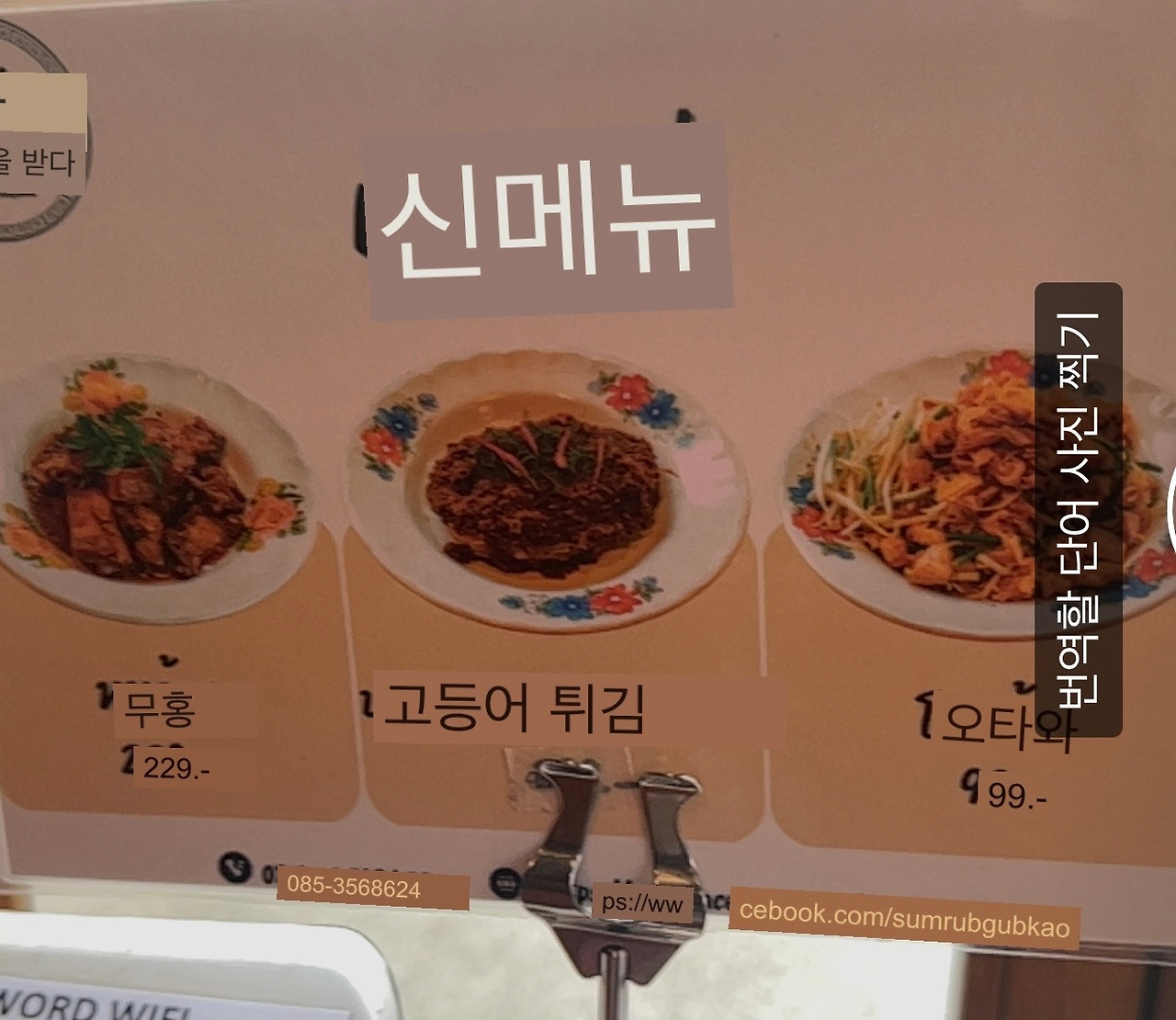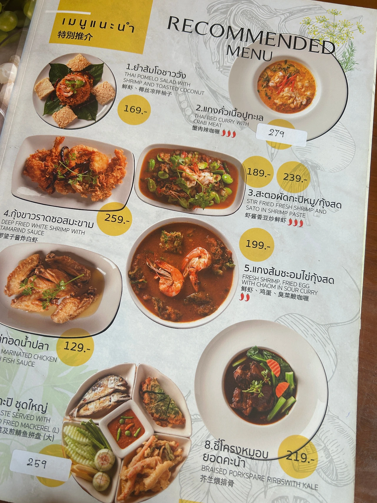 이 식당의 경우엔 메인메뉴들의 가격이 150-300바트 사이였는데, 드레스코드 같은 걸 따로 신경 쓰지 않고 편하게 드나들 수 있는 에어컨 있는 식당들의 평균적인 가격이 이 정도인 것 같다. 한화로 환산해 보면 메뉴 하나 당 6,000원에서 12,000원 사이이니 여행 중인 한국인들은 여전히 ‘저렴하다’고 느낄 가격이지만, 동네식당들과 비교하면 그 차이가 결코 작지 않다.