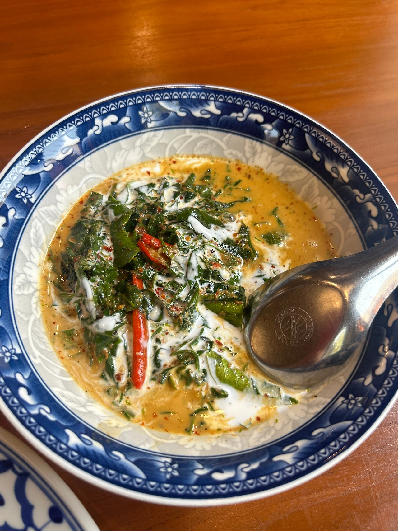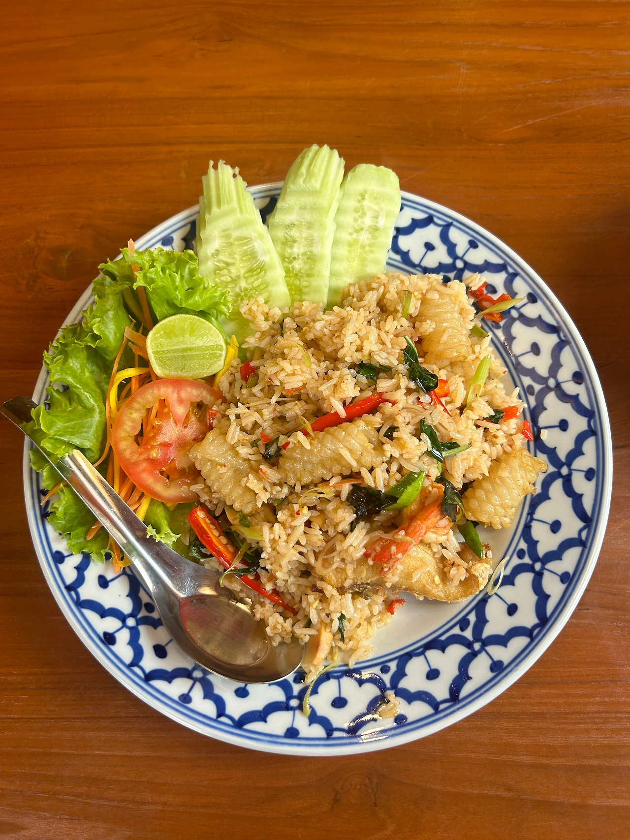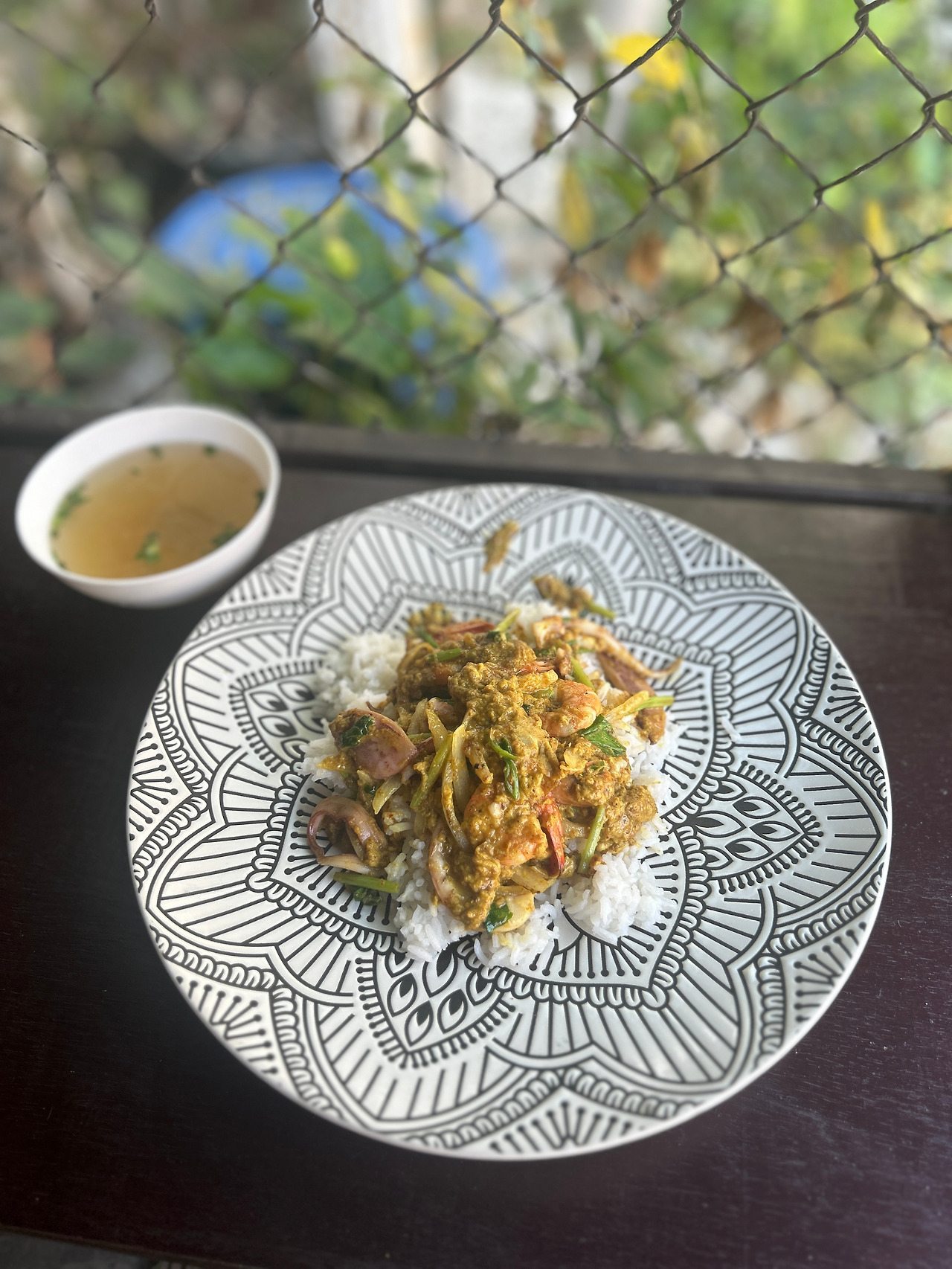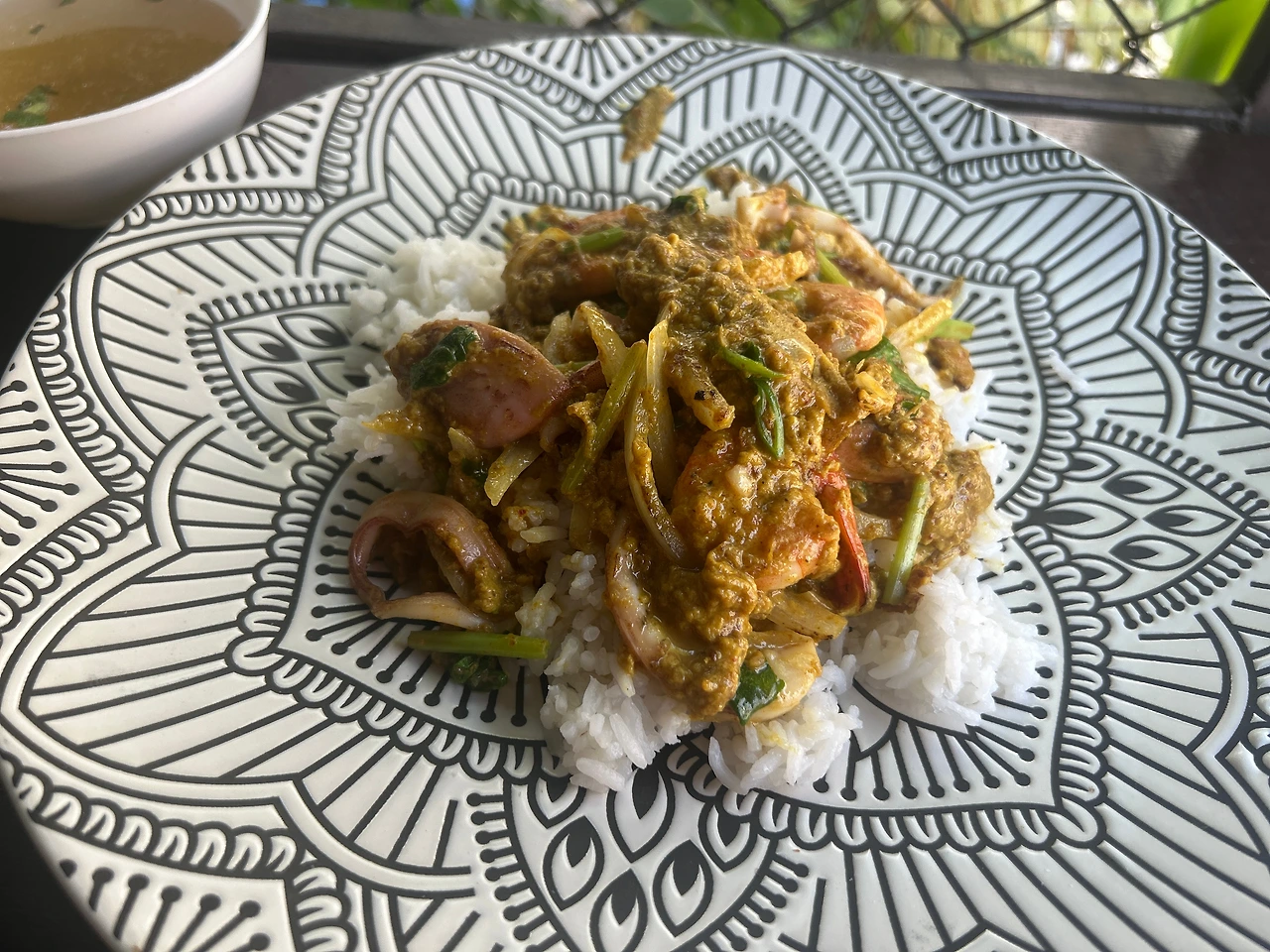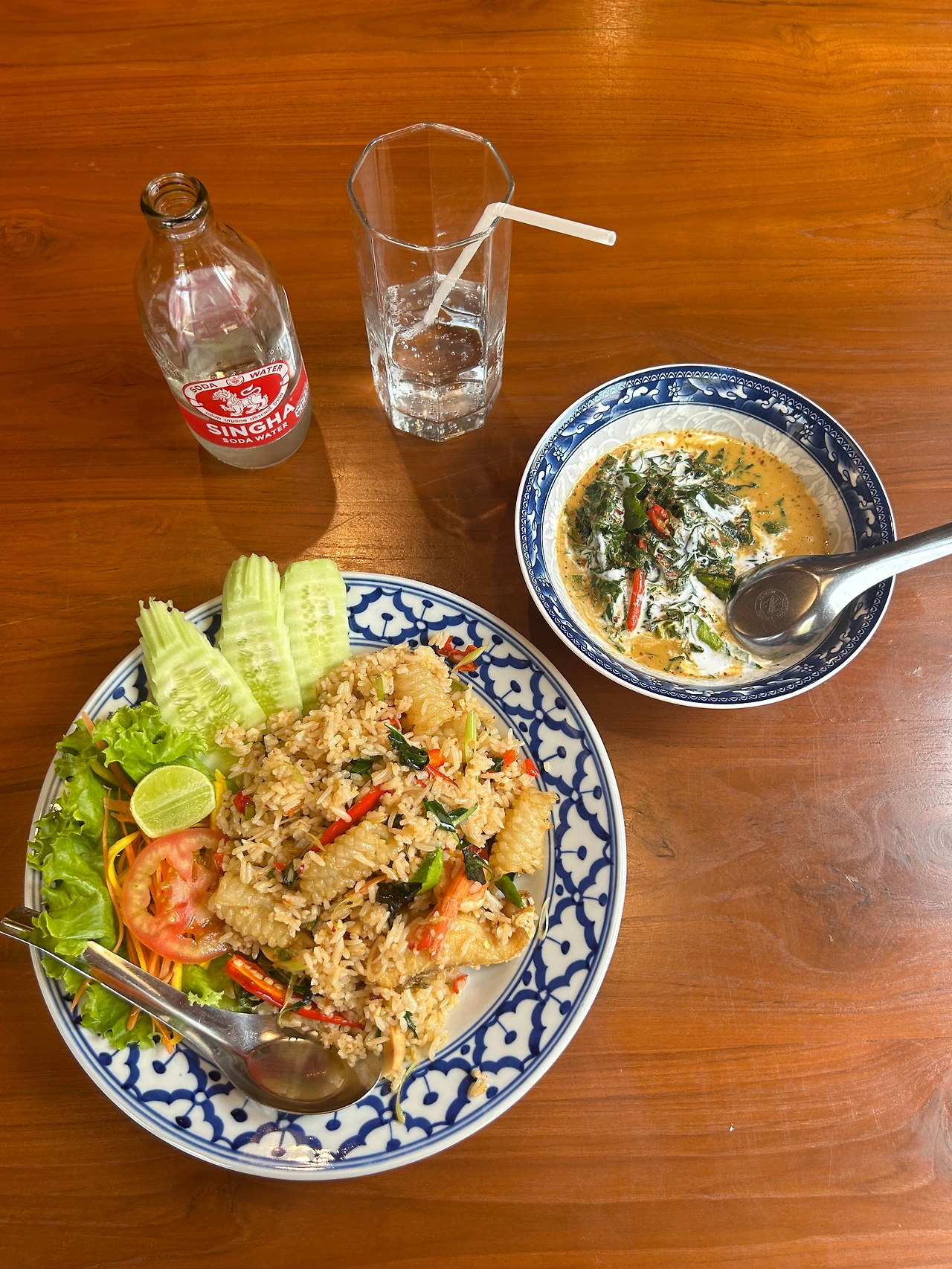 이날 주문한 메뉴는 ‘게살커리’인데, 가격은 279바트로 전날 먹은 동네식당의 해산물커리덮밥의 약 네 배에 달했다. 밥은 포함되어있지 않아서 바질해산물볶음밥을 따로 주문했는데, 이런, 값을 톡톡히 하는 어마어마한 양이 접시에 담겨 나왔다.
