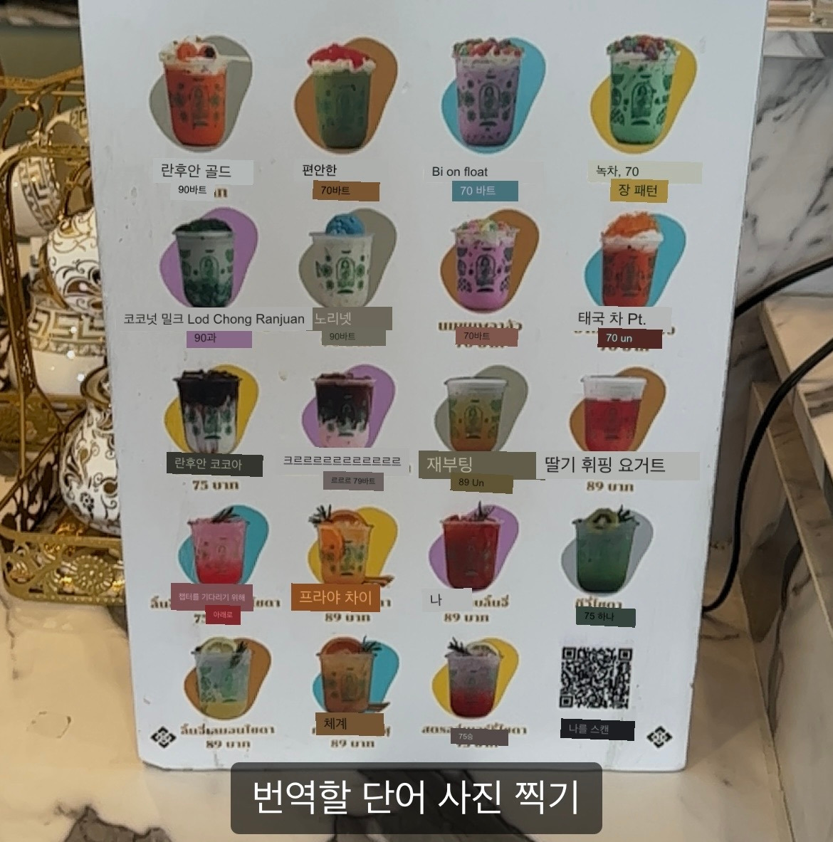태국식 디저트카페는 아마도 대부분 이런 형태인지, 이전에 방문했던 카페와 똑같이 디저트는 테이블에 진열되어있는 것들을 직접 골라 담으면 된다. 디저트를 향해 돌격하기 전, 음료 메뉴판에 재미있는 것들이 많아 보여 구글렌즈를 들이밀었더니, 이 녀석, 오늘도 번역하느라 개그하느라 바쁘다.