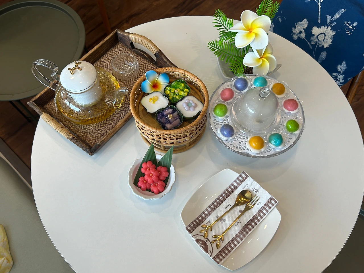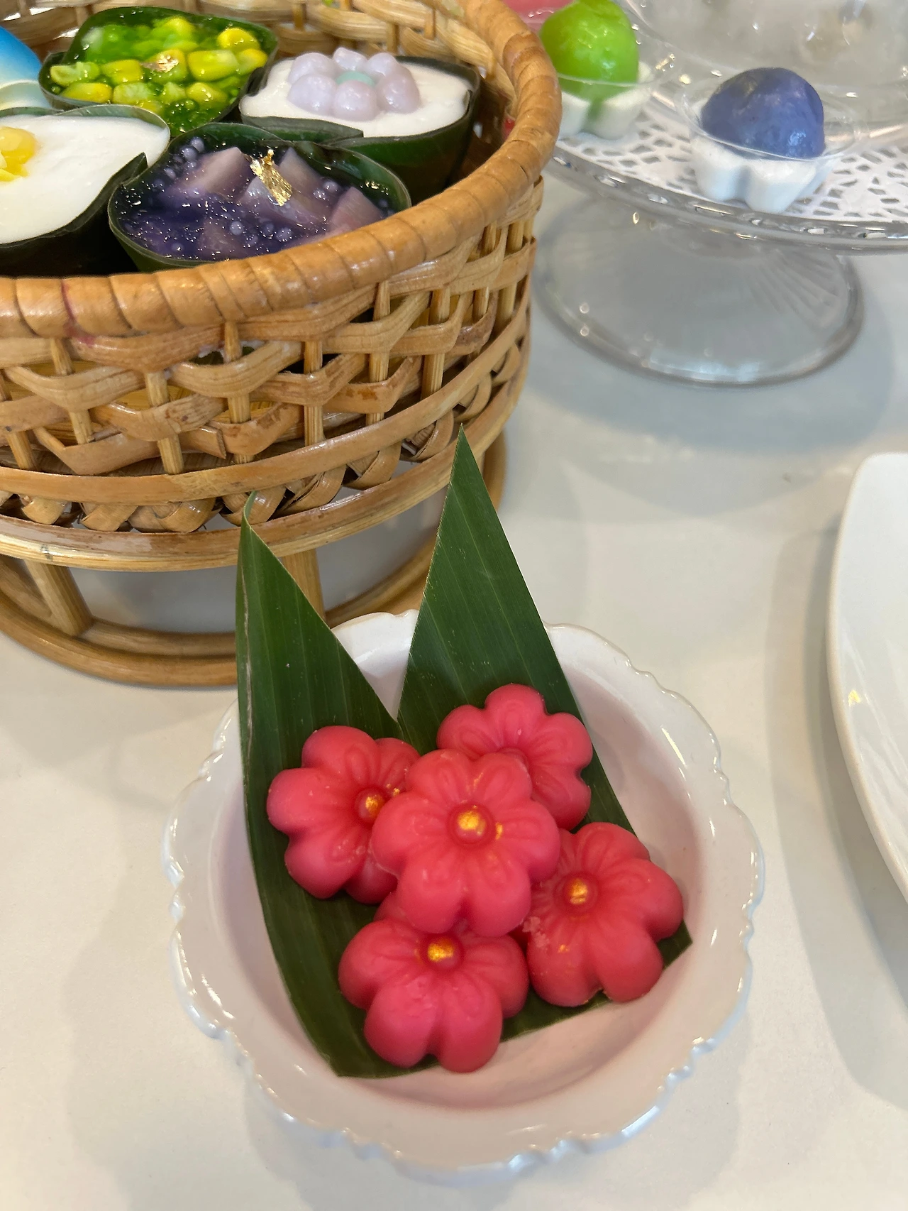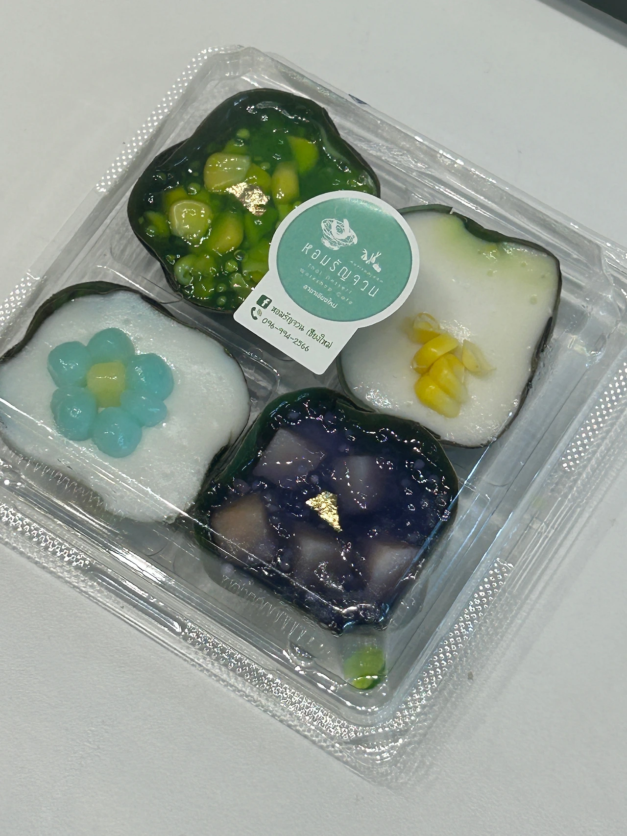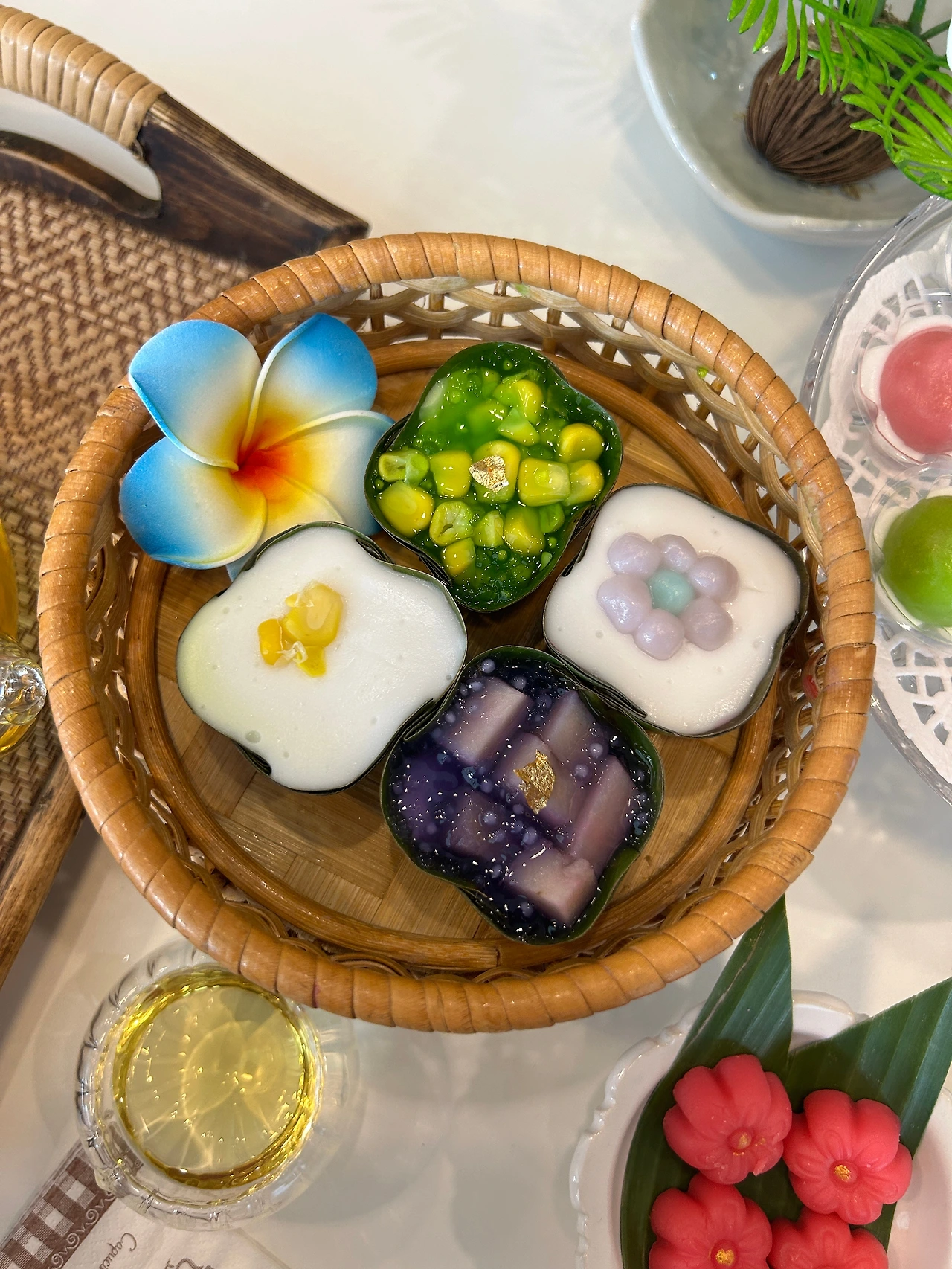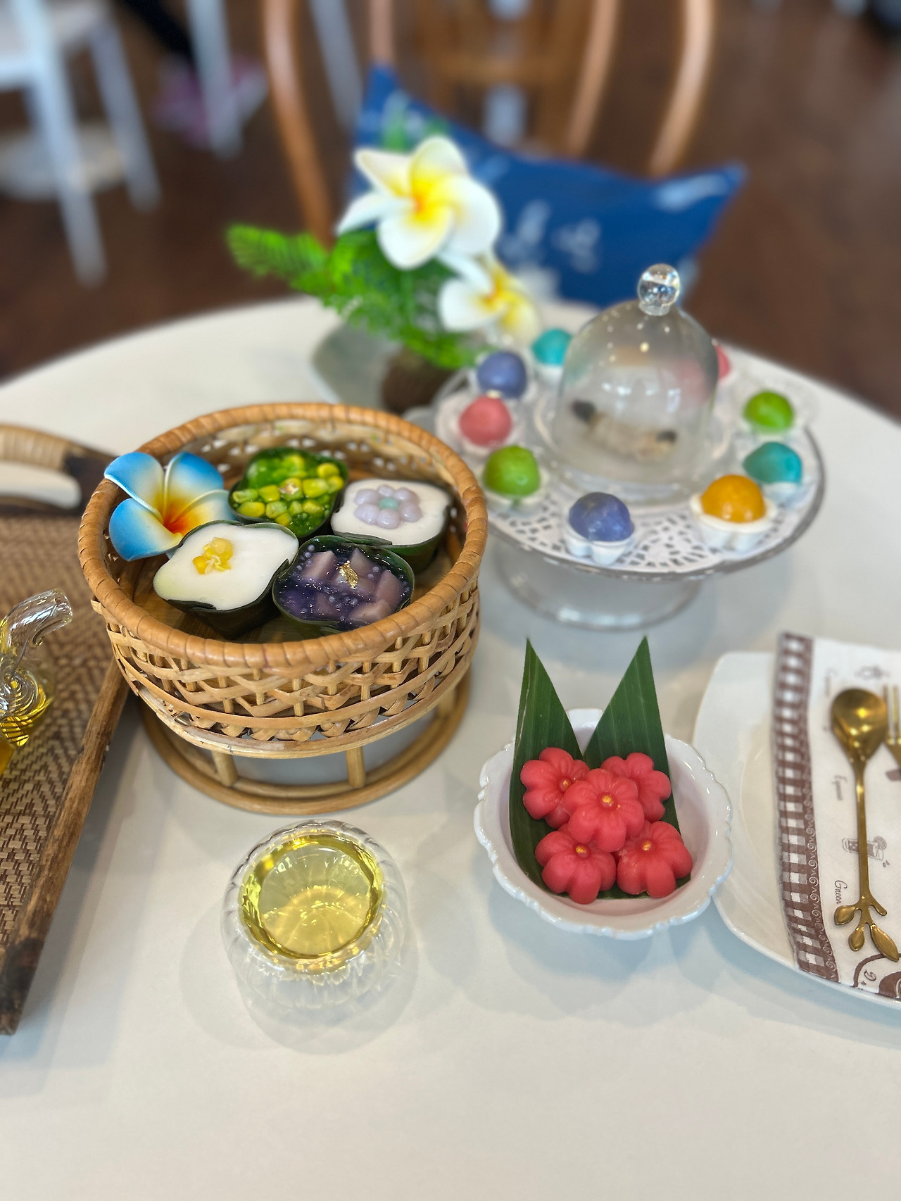 앙금으로 빚어낸 붉은 꽃모양의 화과자는 마치 어린 시절 동네제과점에서 산 버터크림케이크 위에 올려져있던 장미장식처럼 맛에는 크게 특별한 것이 없었다. 조금은 심심한 앙금맛. 아주 달 거라고 예상했지만, 달지 않아서 좋았다. 코코넛밀크로 만든 태국식 떡–혹은 푸딩-은 치앙마이에 와서 좋아하게 된 간식인데 내가 아는 바로 그 구름처럼 푹신하고 부드러운 맛이었다. 보랏빛으로 쪄낸 타로와 샛노란 초당옥수수를 넣어 만드는 이 태국식 디저트도 이제는 제법 그 맛이 익숙해진 것 같다. 알록달록한 태국식 꿀떡은 안에 흑당으로 달콤하게 버무린 코코넛슬라이스가 들어있었는데 깨를 넣은 한국식 꿀떡이 곧바로 떠올랐다.