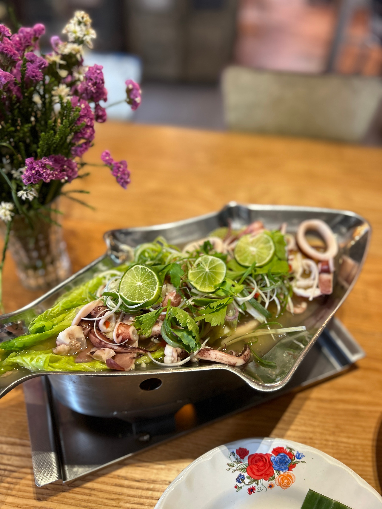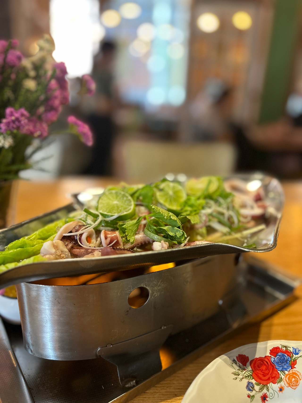 아마도 같은 레시피일 텐데, 오징어찜은 농어찜과 달리 찌개 같은 느낌이 난다. 라임과 태국고추로 양념한 국물은 맑고 개운한데, 그릇 밑에서 작은 불꽃이 계속 따뜻하게 데워주니, 시간이 지날수록 매콤하고 새콤한 맛에 오징어육수가 더해지며 더 진하게 졸아들어 그야말로 진국이다.