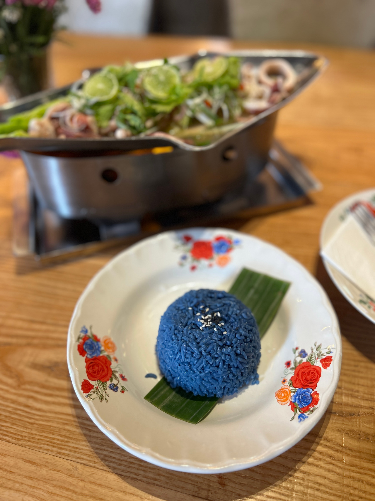 라임과 태국고추로 매콤새콤하게 양념한 태국식 오징어찜과 나비콩꽃으로 파랗게 물들인 자스민라이스를 주문했다. 메뉴판의 사진을 보고 설마 했는데, 예전에 방콕에서 농어찜을 주문했을 때와 똑같이 하단에 불을 붙이는 공간이 따로 마련되어있는 물고기모양 용기에 담겨 나왔다. 게다가 이거, 실제로 요리되어 나온 모습이 야채도 오징어도 사진보다 더 풍성하다!