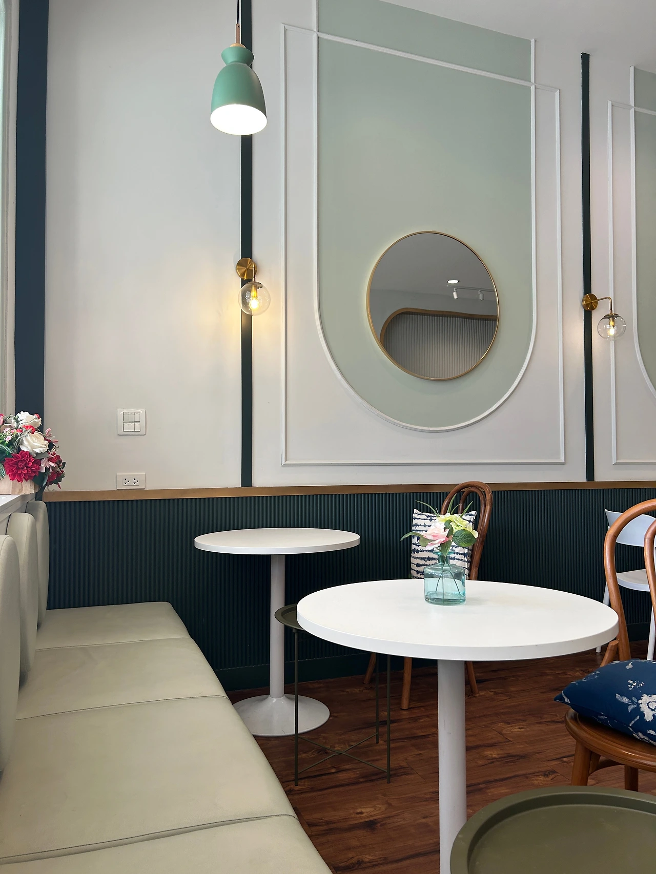 이전에 방문했던 태국식디저트카페는 초록이 가득한 야외에 테이블을 꾸며놓고 식기도 전부 라탄으로 만든 것들을 사용해서 한낮의 여름 속으로 소풍을 나온 기분을 만끽할 수 있었는데, 오늘의 카페는 귀부인들을 위한 우아한 응접실처럼 꾸며져 있다. 동네주민들이 연신 몰려와 한바탕 수다를 떨고 가는 모습을 보니, 어쩐지 아파트상가 1층에 위치한 핫플레이스 같은 느낌도 든다.