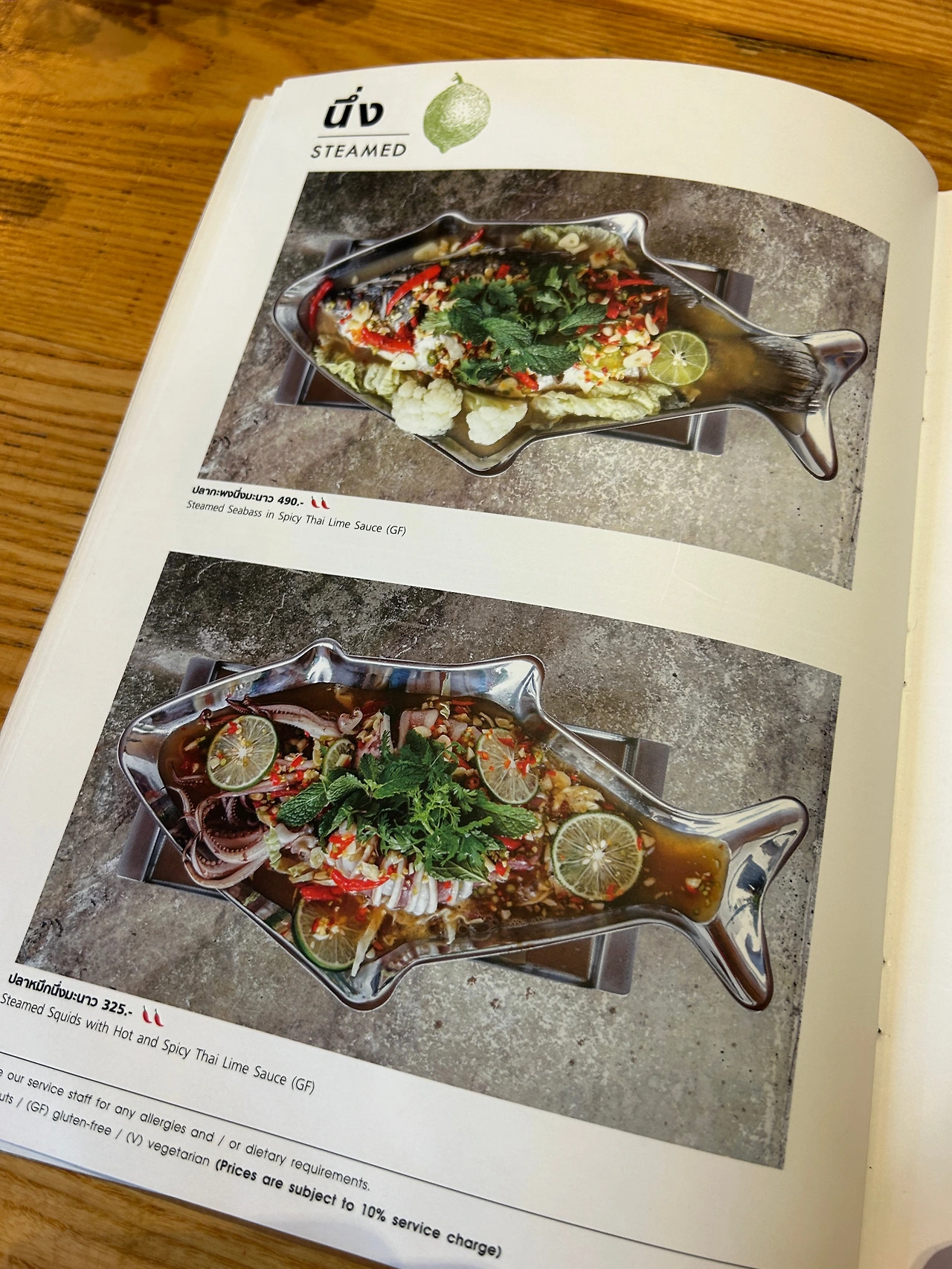 메뉴판에서 반가운 메뉴를 발견했다. 몇 년 전에 가족들과 함께 방콕에 갔을 때 내 팔뚝보다 큰 농어로 만든 찜을 먹고 라임으로 새콤하게 양념해주는 태국식 생선찜에 홀딱 반했는데, 마침 이 집에 그 메뉴가 있다. 하지만 오늘 난 혼자. 농어를 시키면 양이 너무 많을 것 같아 선뜻 결정하지 못하고 망설이는데, 바로 밑에 재료만 ‘오징어’로 바꾼 똑같은 찜메뉴가 있다!