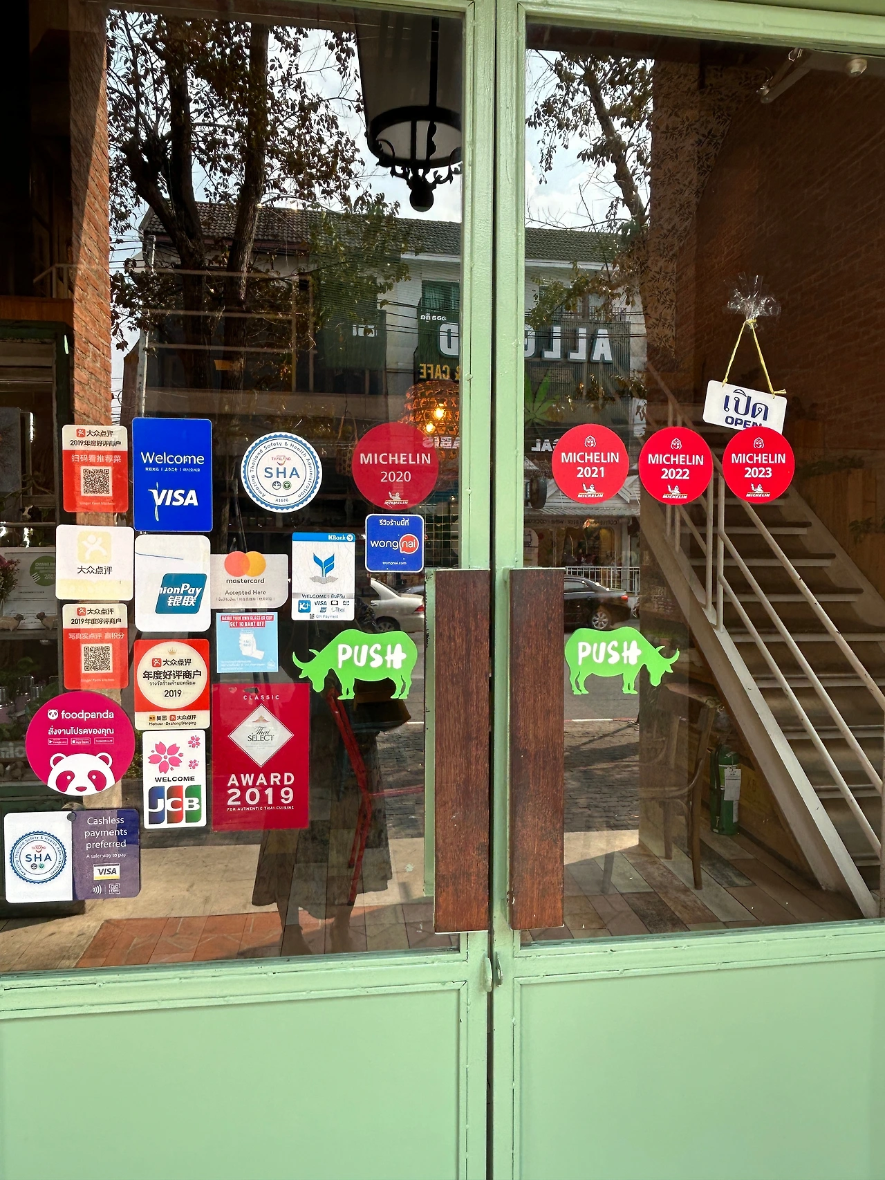 그러고 보니 참 오랜만에 번화가 한가운데 위치한 식당을 찾았다. 식당 입구에 붙여진 알록달록한 스티커들이 종업원 대신 손님을 맞이한다. 개중 단연 눈길을 끄는 건, 2020년부터 2023년까지 연속으로 ‘미슐랭가이드’에 선정되었음을 알리는 빨간 스티커들이다. -식당을 방문한 시기가 2023년이었으니, 그 뒤에도 계속 미슐랭가이드에 선정되었을지도 모르겠다-
