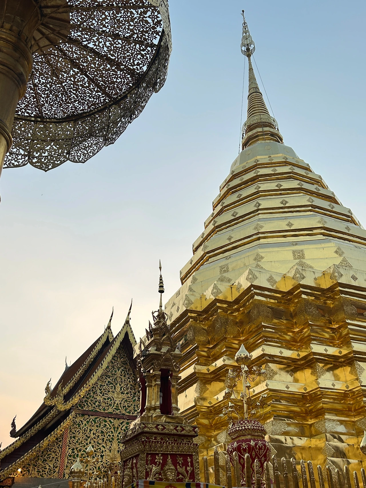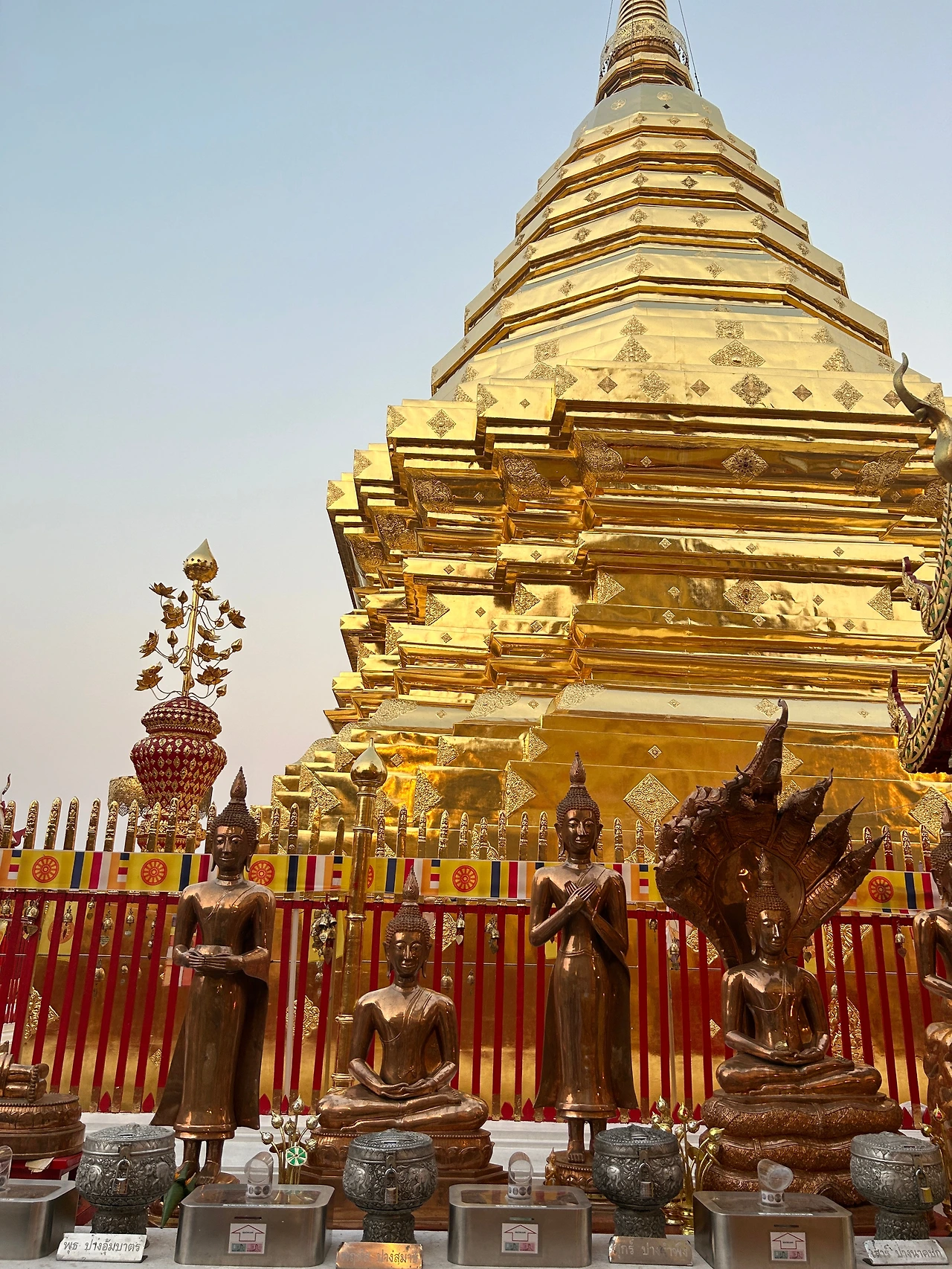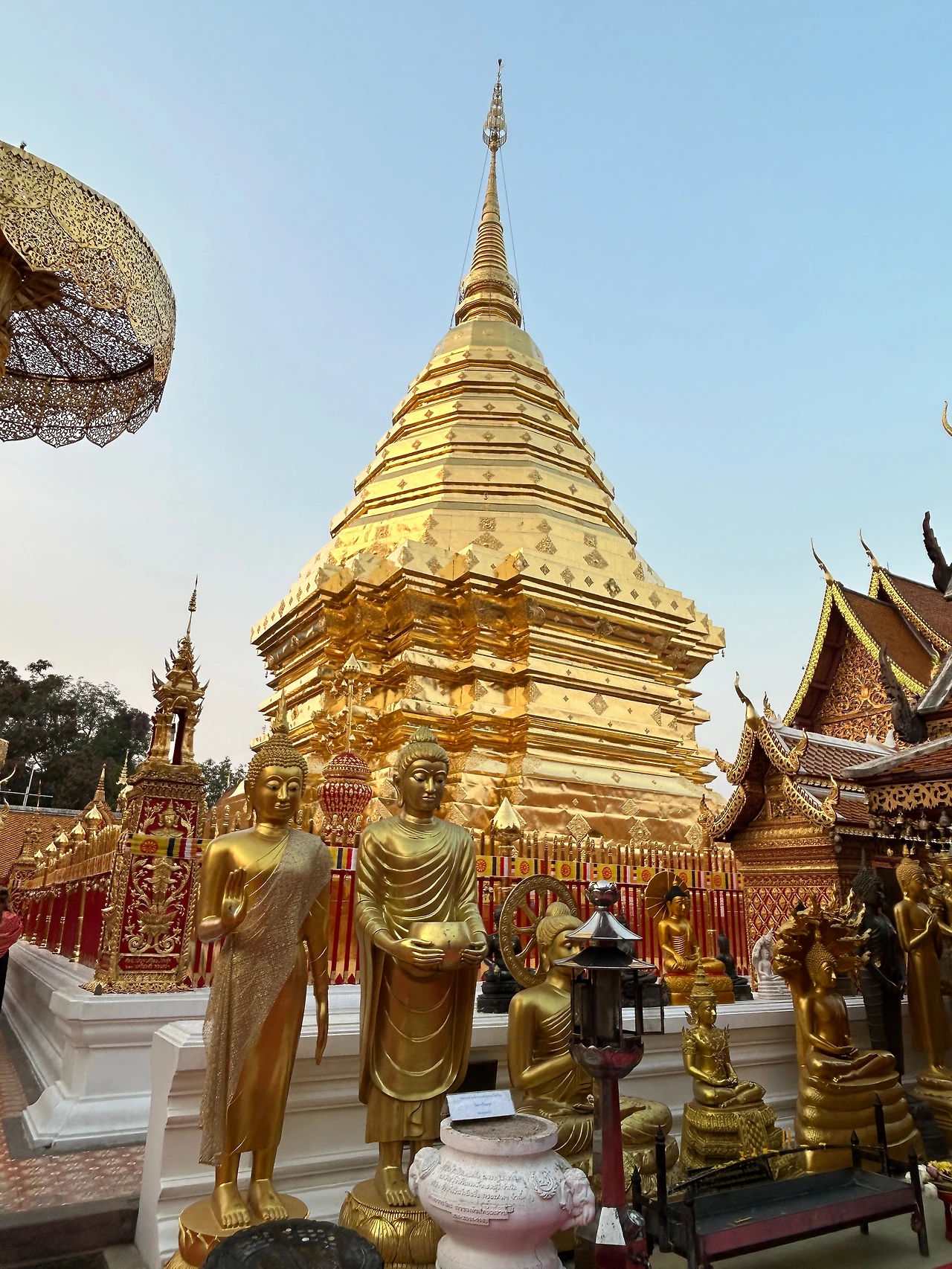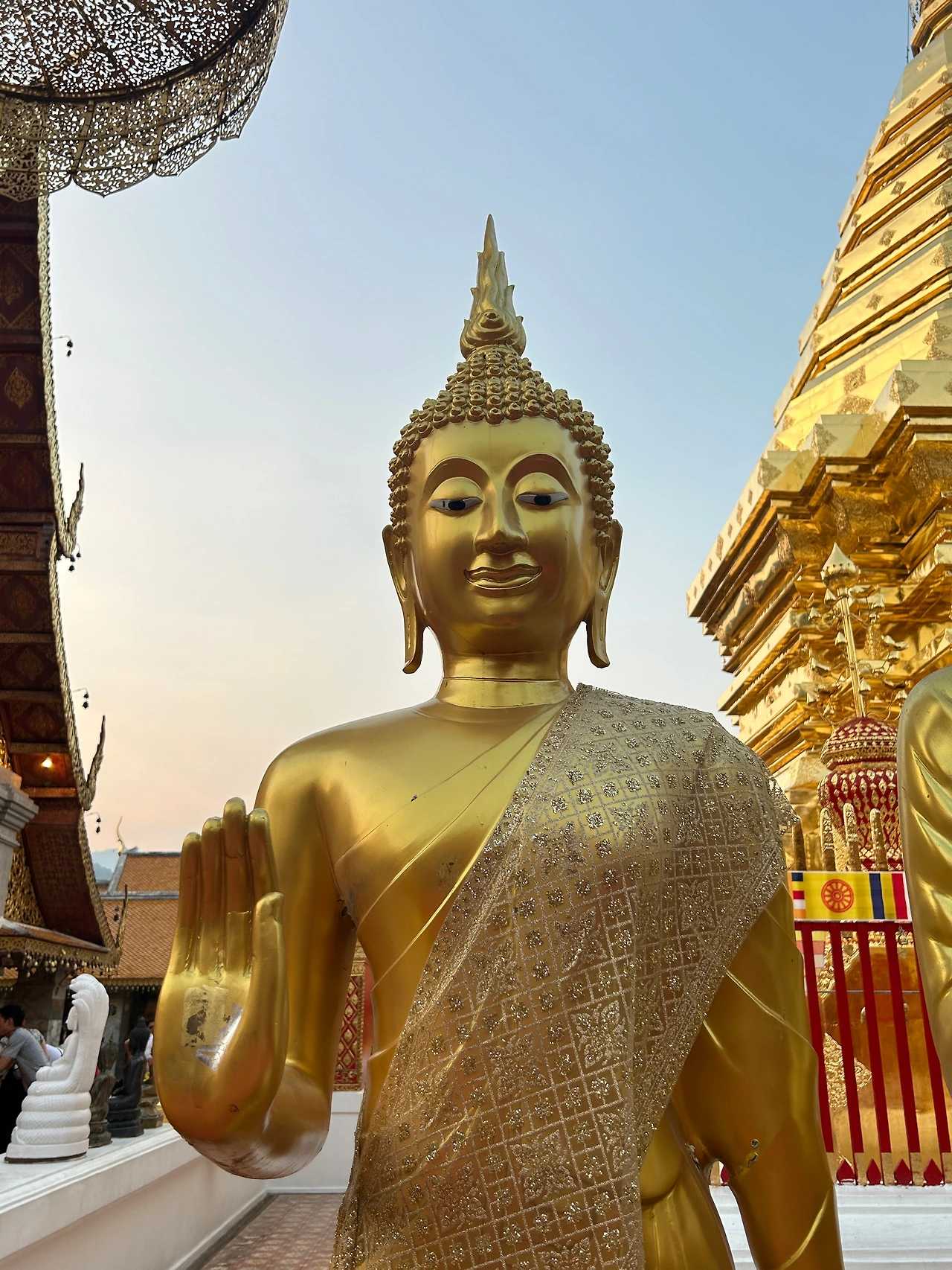 자그마한 기념품과 먹거리를 파는 상점들이 옹기종기 모여 있는 사원 앞은 한국의 여느 유명 사찰 앞과 별반 다를 것이 없었다. 치앙마이에 온 뒤 처음으로 사원에 입장하기 위해 표를 샀다. 자그마한 트램에 몸을 싣고 가파른 트랙을 달려 이윽고 정상에 다다르니, 마치 다른 세상의 문을 연 것처럼 사방이 온통 번쩍이는 금칠이다.