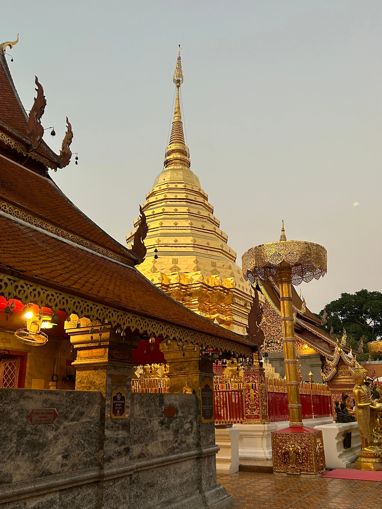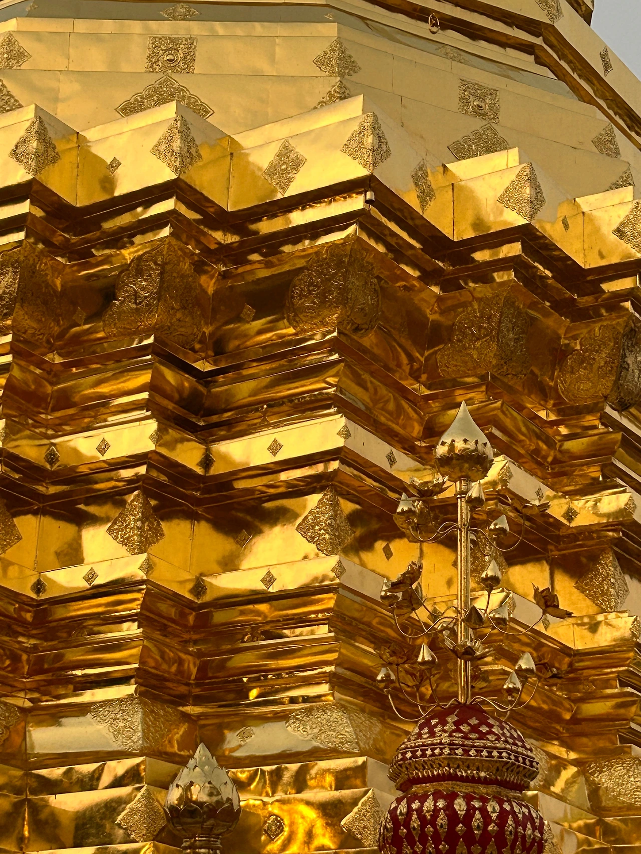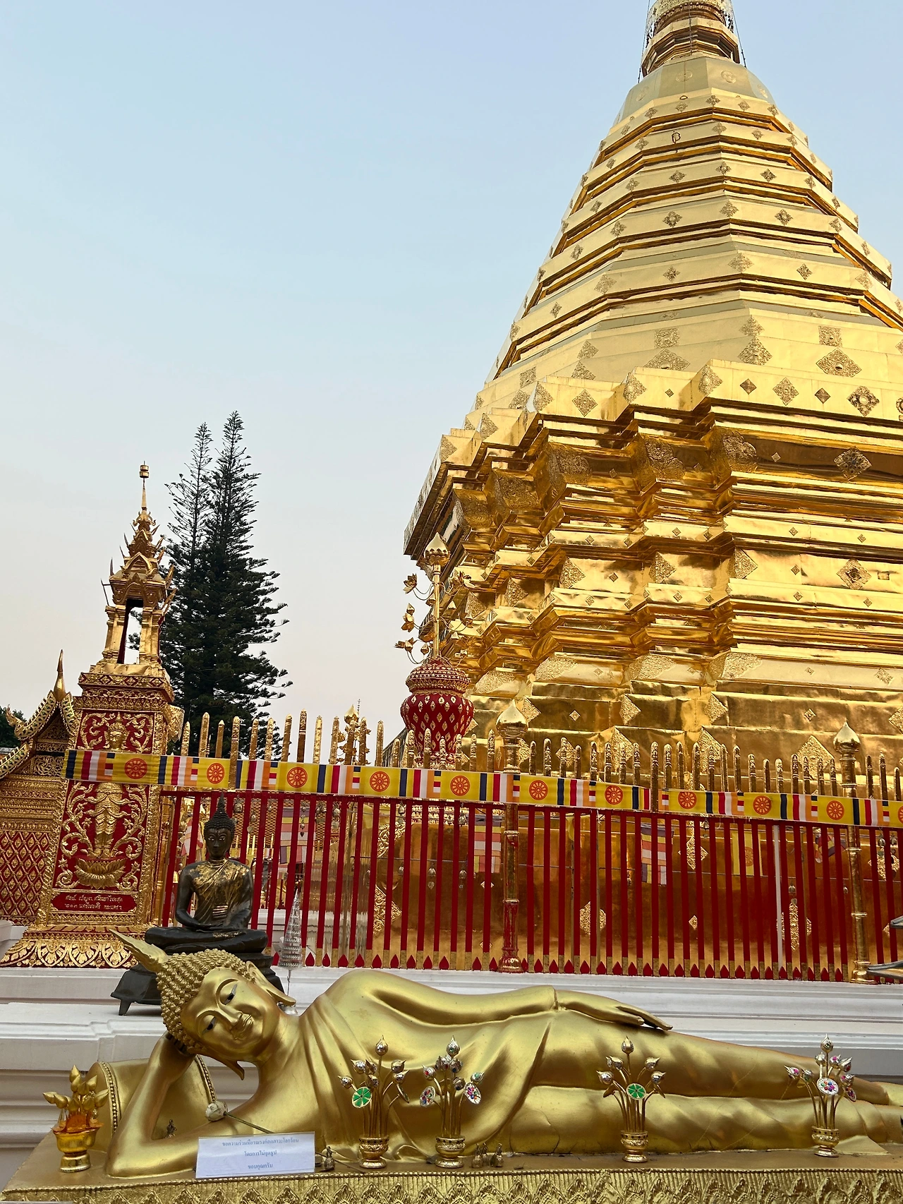 자그마한 기념품과 먹거리를 파는 상점들이 옹기종기 모여 있는 사원 앞은 한국의 여느 유명 사찰 앞과 별반 다를 것이 없었다. 치앙마이에 온 뒤 처음으로 사원에 입장하기 위해 표를 샀다. 자그마한 트램에 몸을 싣고 가파른 트랙을 달려 이윽고 정상에 다다르니, 마치 다른 세상의 문을 연 것처럼 사방이 온통 번쩍이는 금칠이다.