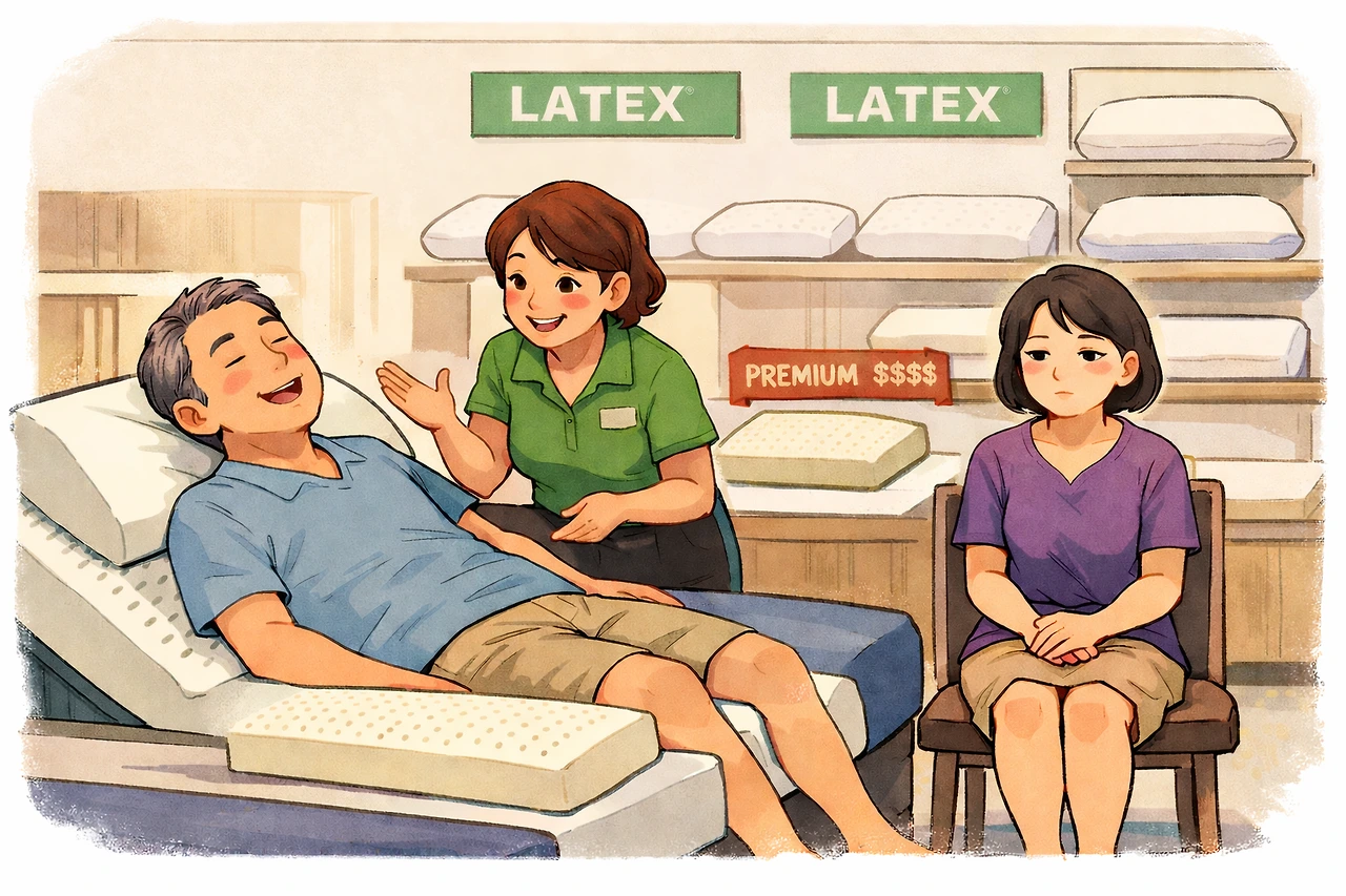 맞은편에는 아저씨가 누워서 만족한 표정으로 직원이 권하는 대로 정성껏 체험하며 만족스러운 표정으로 누워있었다. 반면 아줌마는 무표정하게 앉아 있었다. 슬슬 물건을 권하기 시작했고 여기저기서 구입하는 모습도 보였다. 물건을 사라는 권유가 시작되자 아저씨는 일어나 앉아 슬그머니 아줌마의 눈치를 살폈다. 아줌마 표정은 미동도 없었다.