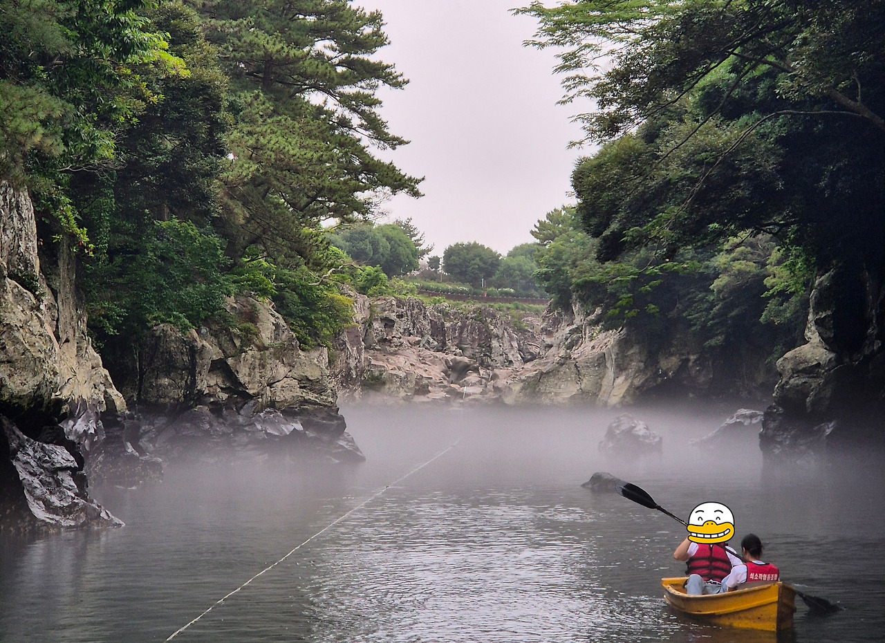 쇠소깍은 서귀포 효돈천이 바다와 맞닿는 하구 계곡이다. 울창한 나무 사이로 짙푸른 계곡을 바라보니 오래전 기억이 떠올랐다. 아이들이 어렸을 때 제주시에서 한 시간 가까이 차를 타고 쇠소깍에 간 적이 있다. 그때 우리는 계단에 서서 아래를 보며 "여기가 쇠소깍이야" 말한 뒤 입구 매점에서 파는 아이스크림을 사 먹고 돌아왔다. 남편은 내가 말하면 마지못해 가긴 하는데 막상 가면 깃발관광 가이드처럼 사진 한 장 찍어주고 얼른 돌아오려고 한다. 아이들 키우며 지칠 때는 나도 피곤해서 못 이기는 척 슬쩍 동의하기도 했다. 이제 나이가 드니 하나라도 더 보고 경험하고 싶어진다. 이날도 쇠소깍 가자는 말에 남편이 "갔었잖아 "하는 걸 "테우도 타고 카약도 탈 거야" 하며 꼭 가겠다는 의지를 보여줬다.