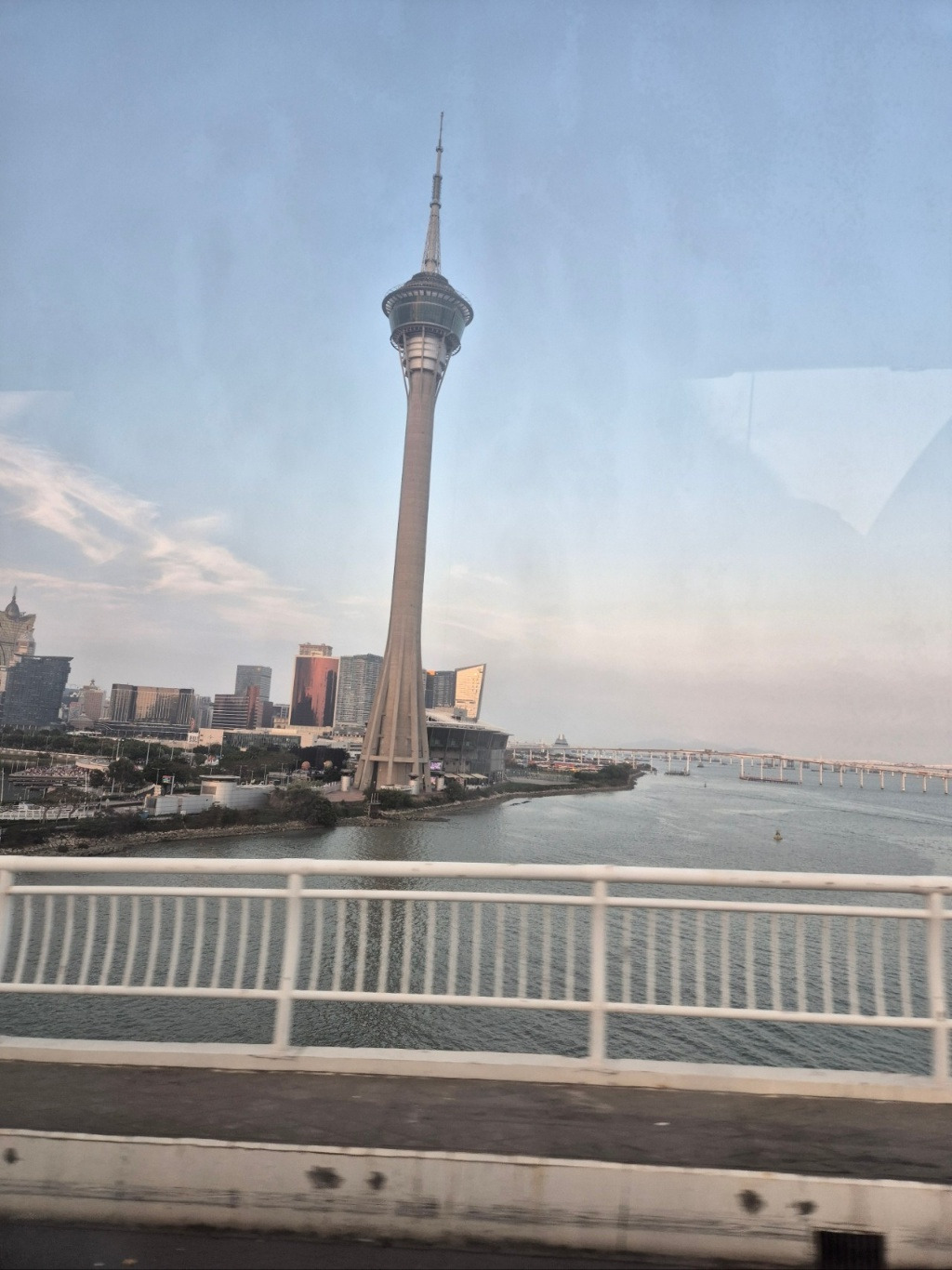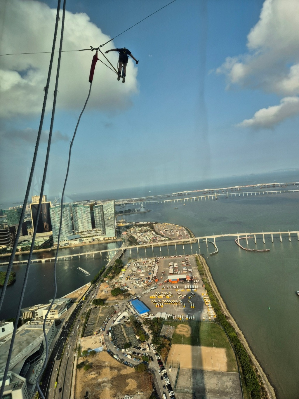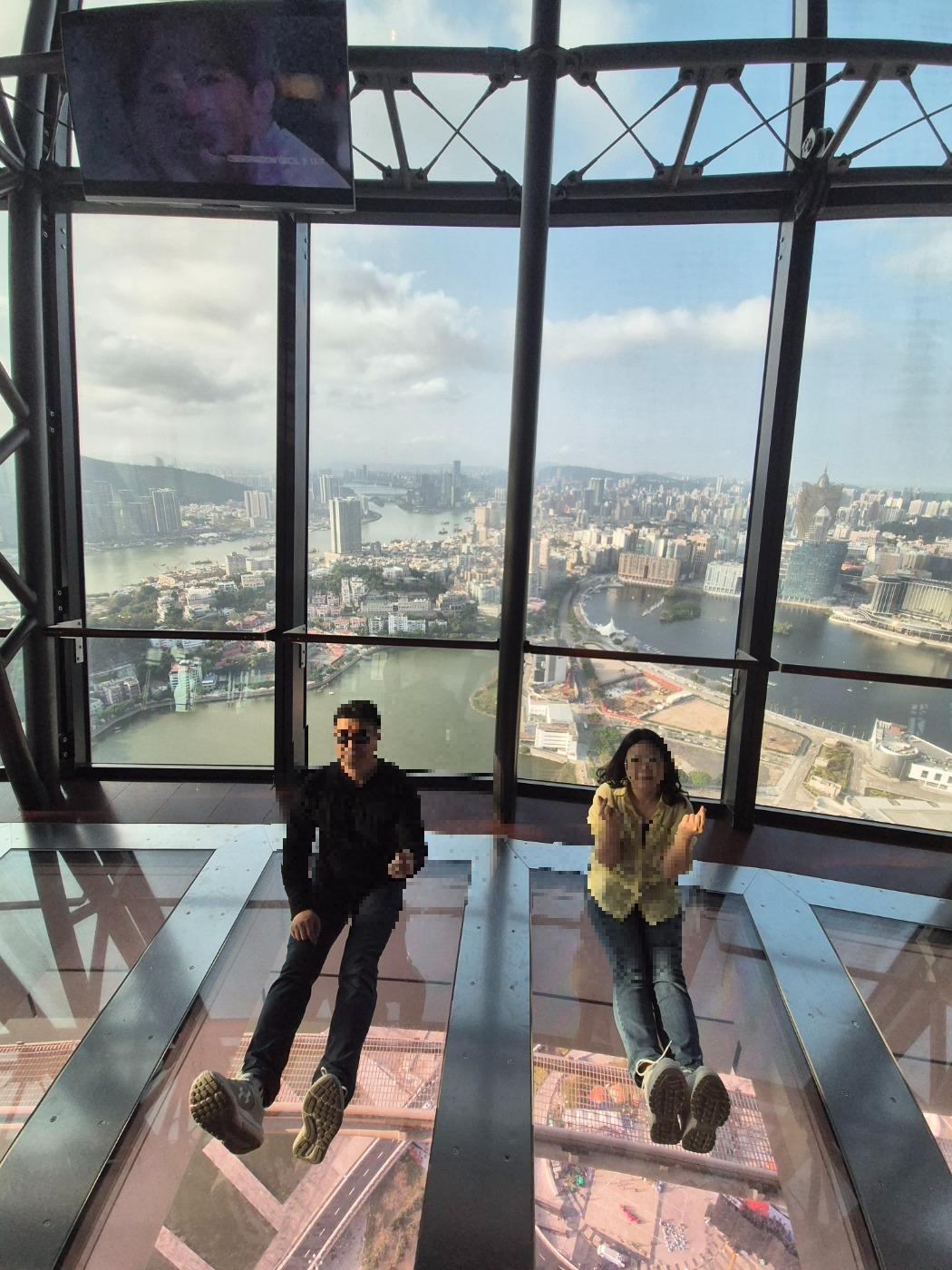 마카오타워는 360도로 돌아가며 전망을 볼 수 있고 창 옆으로는 투명한 바닥이 있다. 바닥을 보기 전에는 아무렇지 않을 줄 알았는데, 막상 가까이서 보니 심장이 쫄아드는 느낌이었다. 발 한번 올려봤다가 얼른 뗐다. 아무 일 없을 거라는 거 아는데, 그냥 투명할 뿐인데, 가슴이 철렁했다. 발밑으로 강도 보이고, 미니어처처럼 보이는 자동차도 달린다. 투명 바닥에서 인증샷도 찍고 특별한 포즈로 사진 찍는 사람들이 많았다. 남편도 그들 속에서 인증샷 찍으며 걸어 다녔고 나는 멀리 떨어져서 걸었다. 전체가 유리인 창으로 아름다운 도시도, 넓은 강도, 중국 본토도 홍콩도 볼 수 있다.
