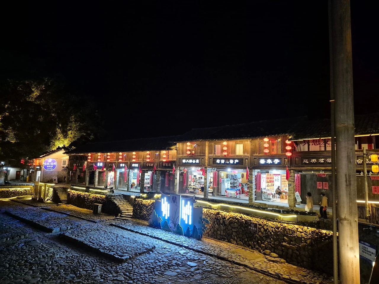 TV에 나왔던 '독박즈'의 여행일정을 그대로 따라 운수요 마을 안에 있는 식당에서 현지식 토루 지방 요리를 먹기로 되어 있었다. 식당으로 가는 길에 본 오래된 느티나무들이 불빛과 어우러져 묘한 신비감을 주었다. 나무 아래에서 여유롭게 앉아 쉬고 있는 사람들의 모습도 볼 수 있었다. 물가를 따라 늘어선 오래된 상점들에 서잡화와 간식거리들을 팔고 있었는데 붉은 간판과 불빛이 중국임을 실감하게 했다. 관광객이 지나가도 가만히 앉아 있는 가게 주인마저도 풍경의 일부처럼 보였다.