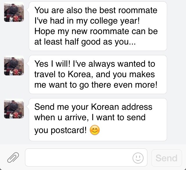 여름인데도 이불 없어 추위에 벌벌 떨며 자는걸 보고 이불 사러 가자며 Target에도 데려가 주고 한국인 중에 나만 혼자 다른 기숙사동이라 다른 사람들이 나 있는 줄도 모르고 밥 먹으러 가버렸을 때 같이 밥 먹으러 커먼스도 가주고, 계좌랑 핸드폰 개통하러 차이나타운도 같이 가주고. 착하고 공부도 잘하고 사려 깊은 내 룸메! 내 이름을 한자로 써서 "이건 어떻게 발음해!?"라며 발음을 듣고 웃기다며 인사한 게 엊그제 같은데 벌써 헤어질 시간이라니 너무 아쉬웠다.