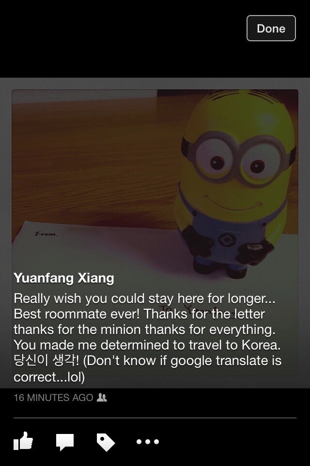 그러고는 페북 메세지로 사진을 보내줬다. 룸메랑 나는 둘 다 미니언을 굉장히 좋아했는데 미니언 인형과 편지 한 통을 책상 위에 올려두고 왔더니 저런 포스트를 올렸다.