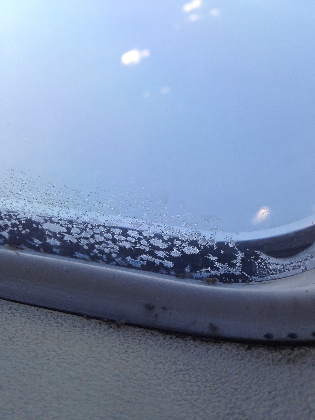 다리랑 허리는 또 좀 아파야지.. 밥 먹고 앉아만 있으니 더부룩하고 이놈의 화장실은 계속 누구 있다고 불 켜져 있고! 그냥 비상구 쪽으로 돌아다니면서 창 밖 사진만 찍어댔다. 창가에 맺힌 얼음을 보고 이 높이의 밖은 얼마나 추운지 궁금했다.