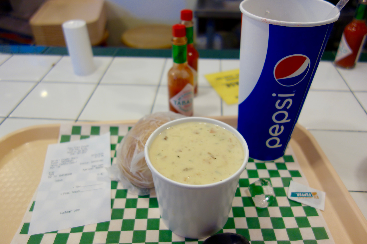 너무도 히피하게 생긴 점원 두 분이 주문을 받았다. 뉴 잉글랜드 차우더 미디엄이랑 소다 한 잔 시켰다.