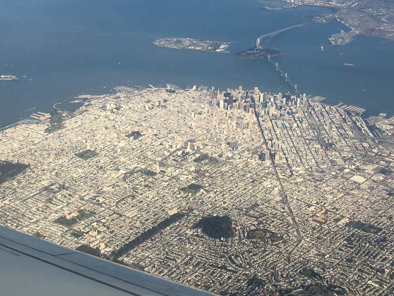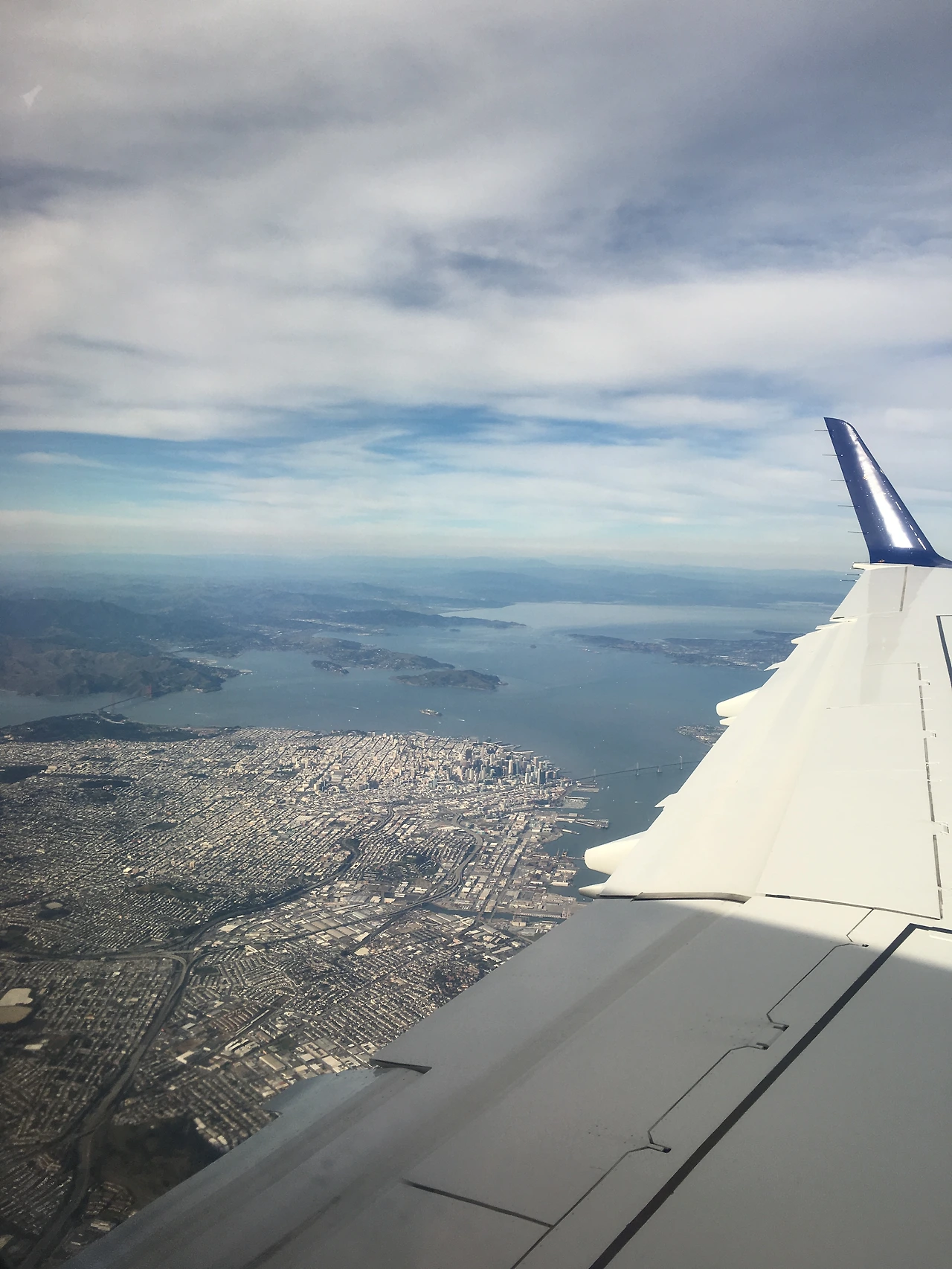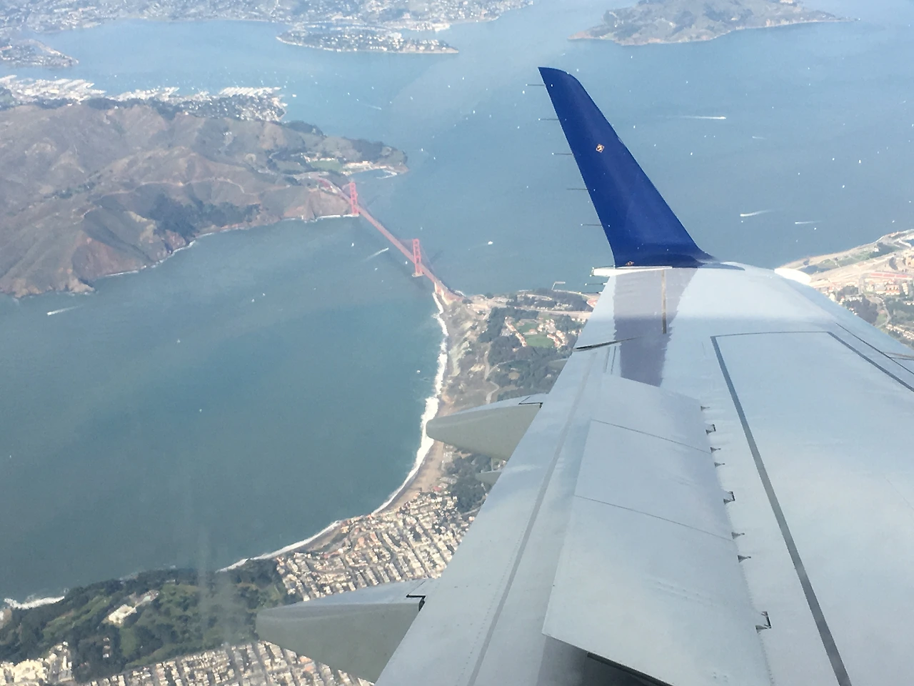 창가 자리였는데 비행기 기종을 안 보고 좌석을 골랐더니 창문과 창문 사이 좌석이라 바깥이 잘 안 보여서 시무룩했었는데, 샌프란에 거의 다 왔을 때쯤 비행기를 돌리느라 뒤쪽 시야가 터서 금문교랑, 샌프란을 미니어처로 볼 수 있었다. 핸드폰 카메라라 이렇게밖에 못 담았지만.. 다음엔 대포를 들고 타 볼까