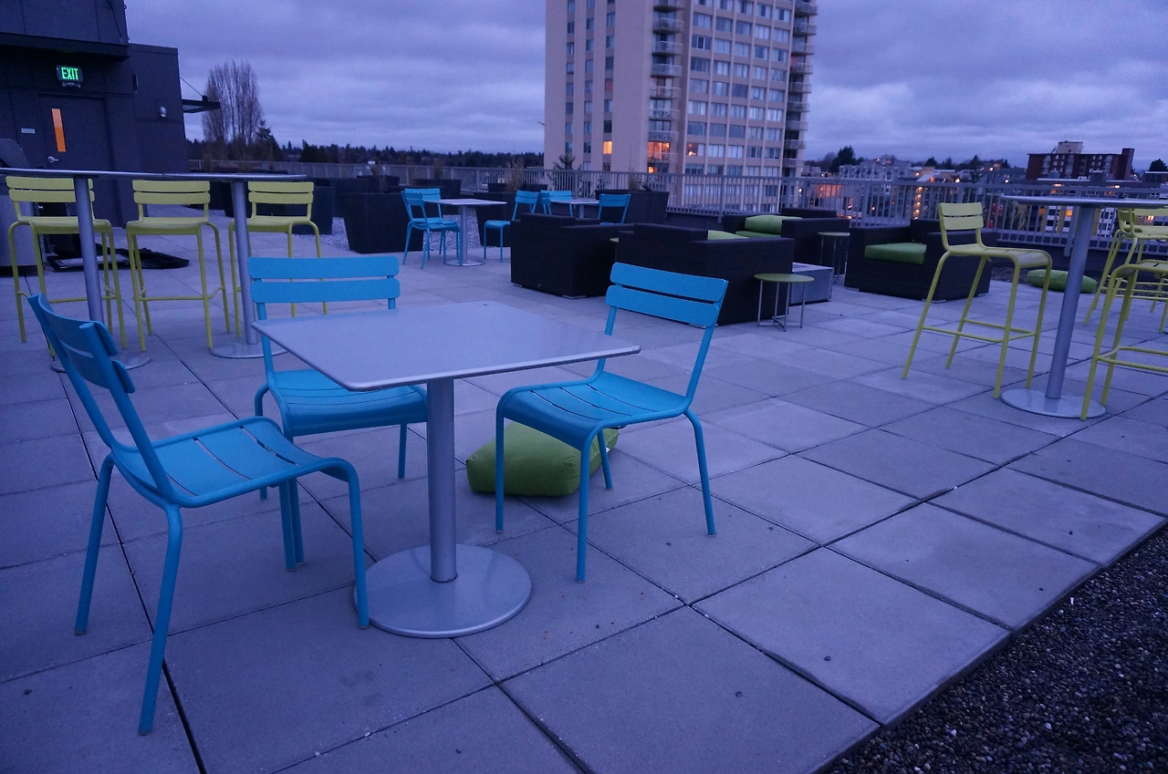 옥상에 이렇게 테이블이 놓여있는데 너무 추워서 앉질 못했다. 시애틀과 함께 셀카 찍고 나갈 준비하고 Lyft를 불러서 탔다.