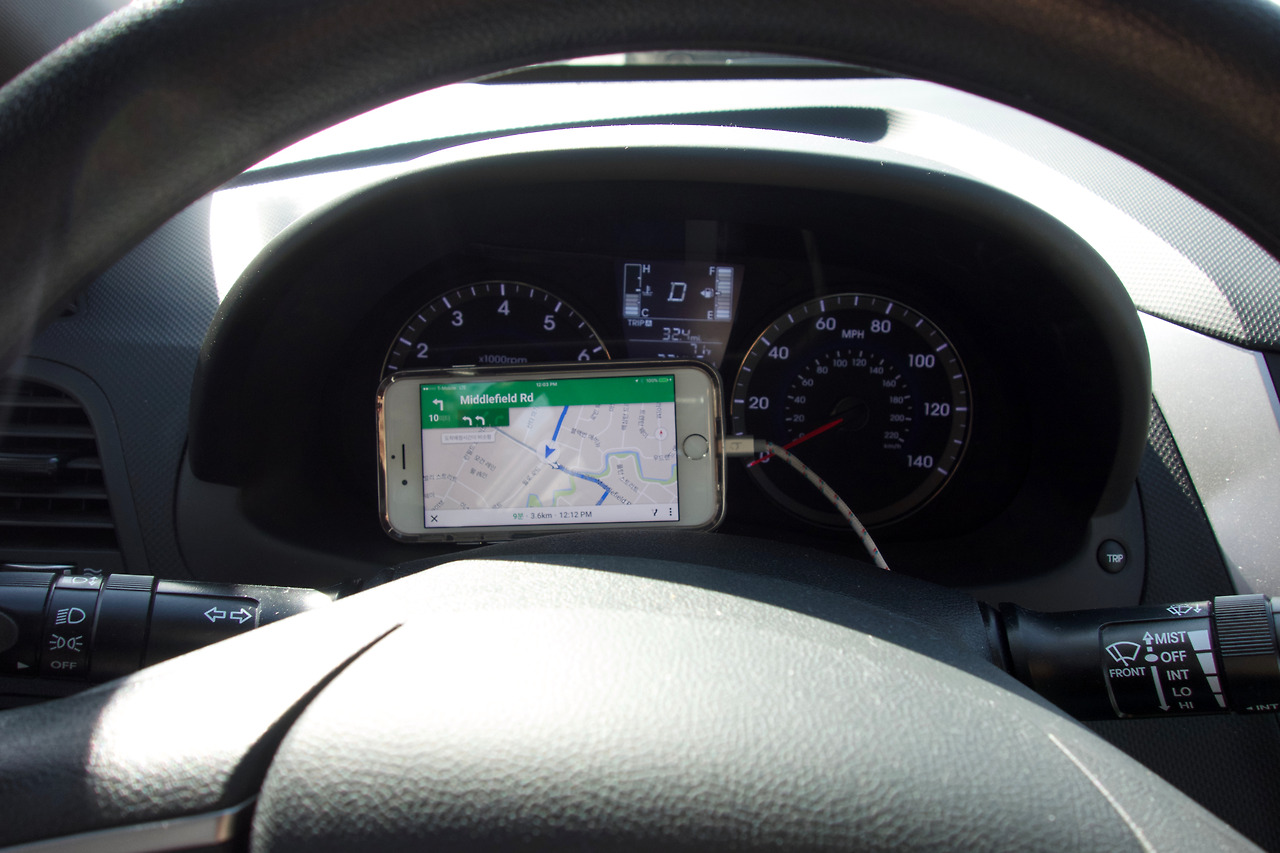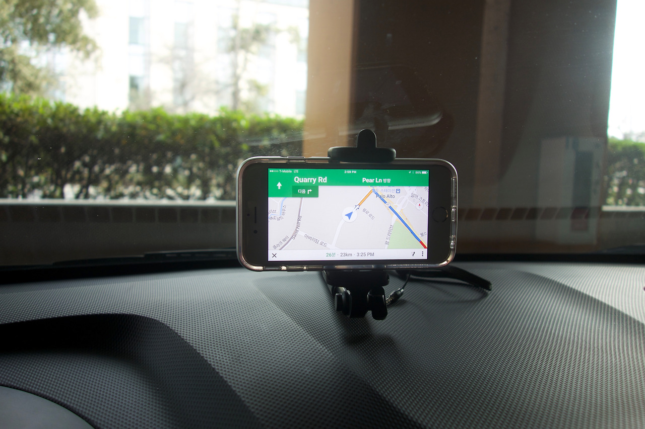 대시보드에 폰을 놓는건 아무래도 위험한 것 같아서 셀카봉을 거치대 삼아 앞유리 사이에 꽉 끼워봤다. 처음엔 성공적인 듯 싶었으나 가속페달과 함께 자꾸 고꾸라짐^^..