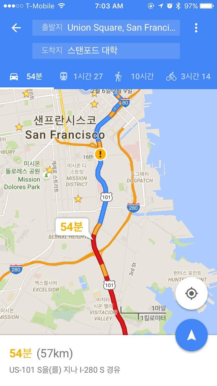 맵 아이콘에 나와있는 280번 고속도로를 몇키로 달려서 나와서 유턴 후 다시 South 방향으로..