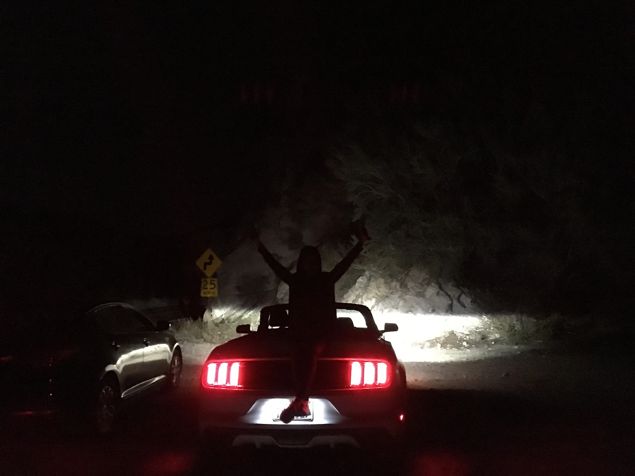 차의 불빛을 끄고 눈의 암순응을 기다린 다음 별을 보고 싶었지만 그렇게 하면 서로 어디 있는 지도 안보이고 결정적으로 너무 무서워서 라이트를 켜뒀다. 이때를 틈타 머스탱과 사진 찍어달라고 조르기.